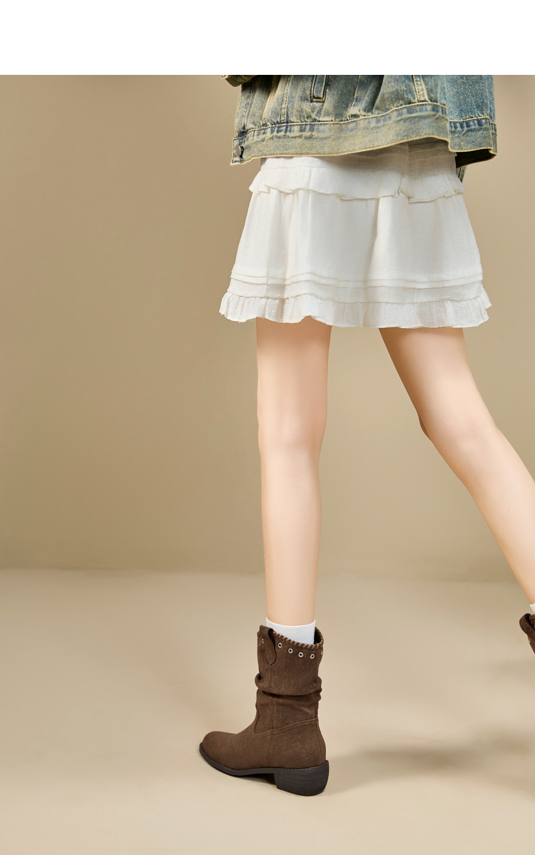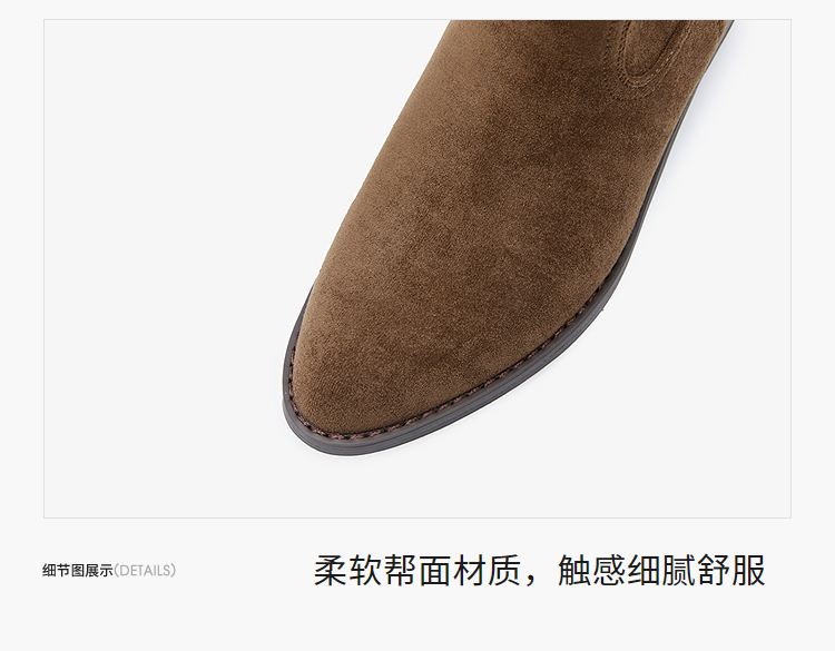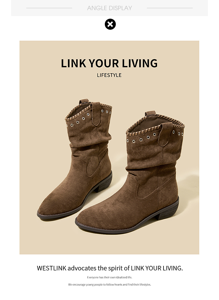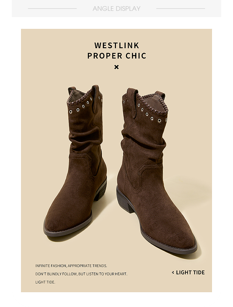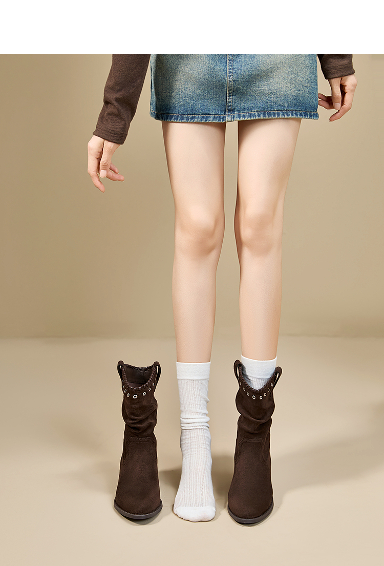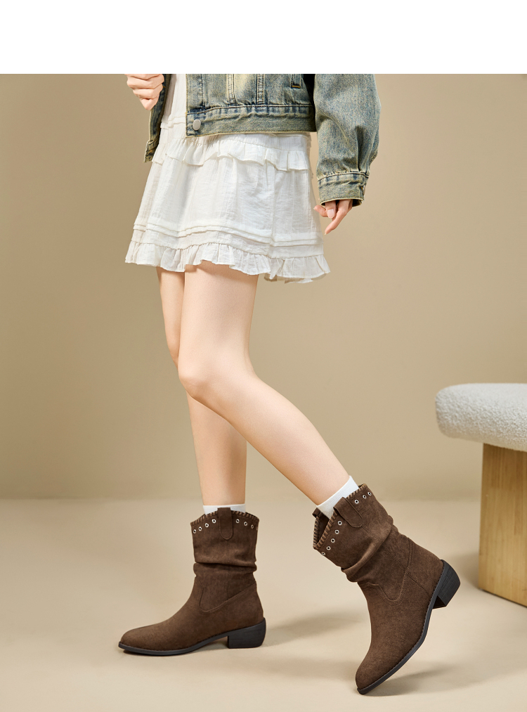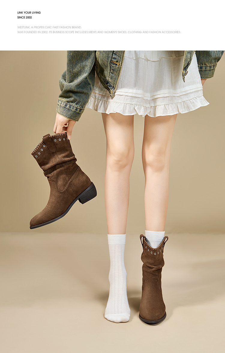 西遇V口西部牛仔靴女新款秋冬复古铆钉绒面堆堆靴黑色短靴子V2257266