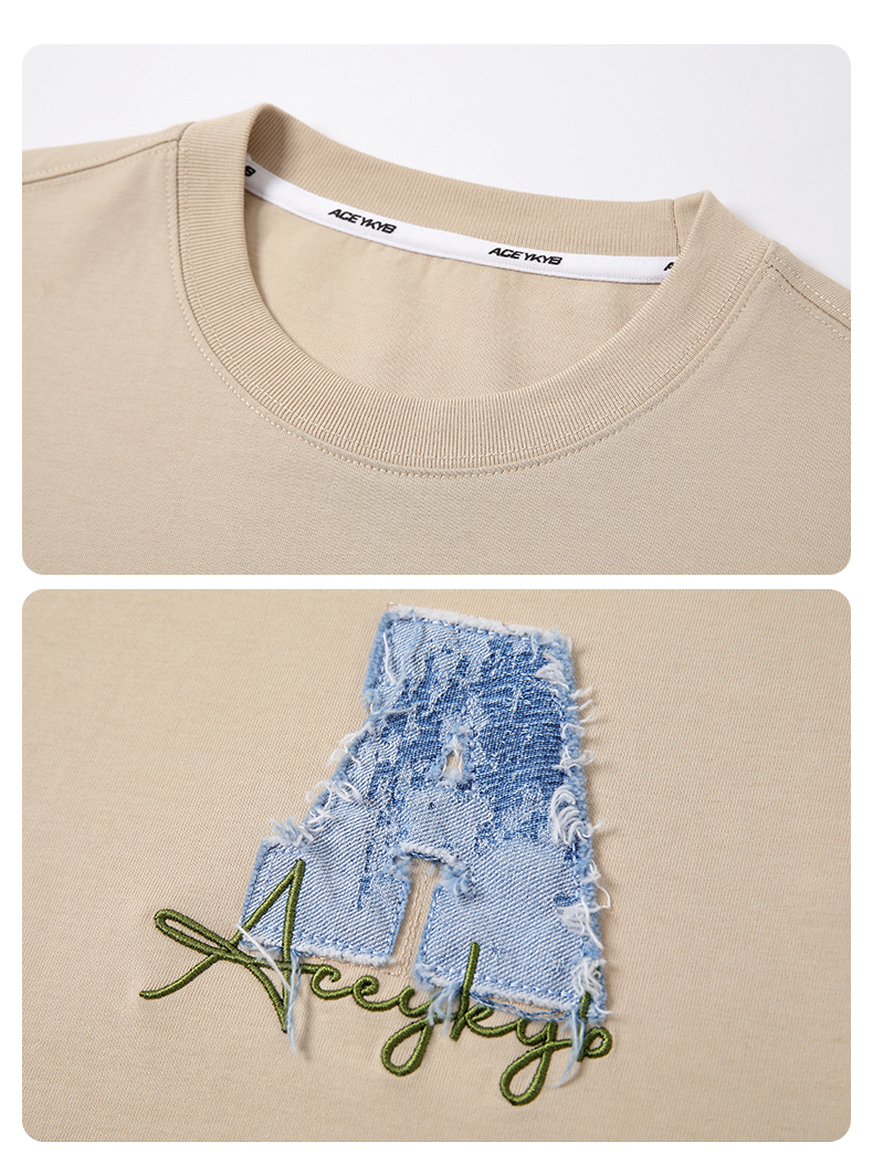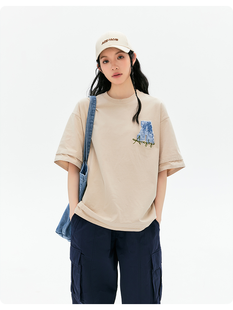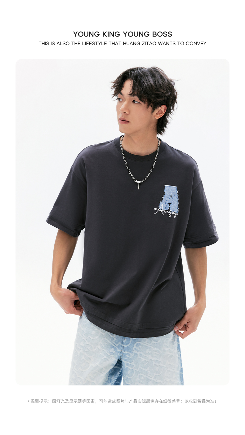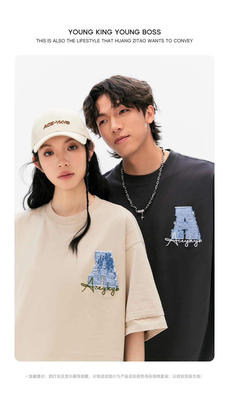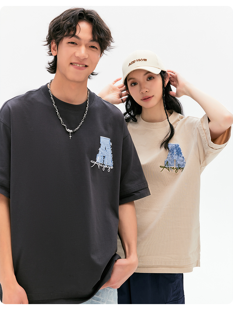 ACEYKYB黄子韬假两件T恤男女2025夏季新款复古牛仔贴布绣短袖中性