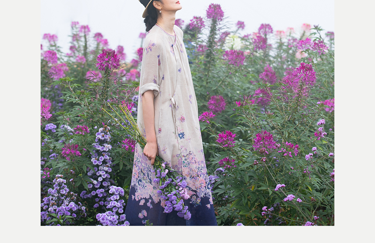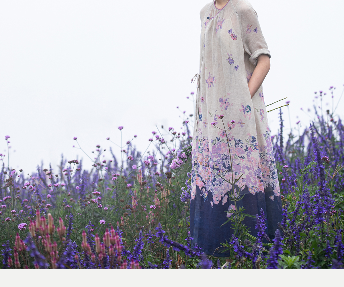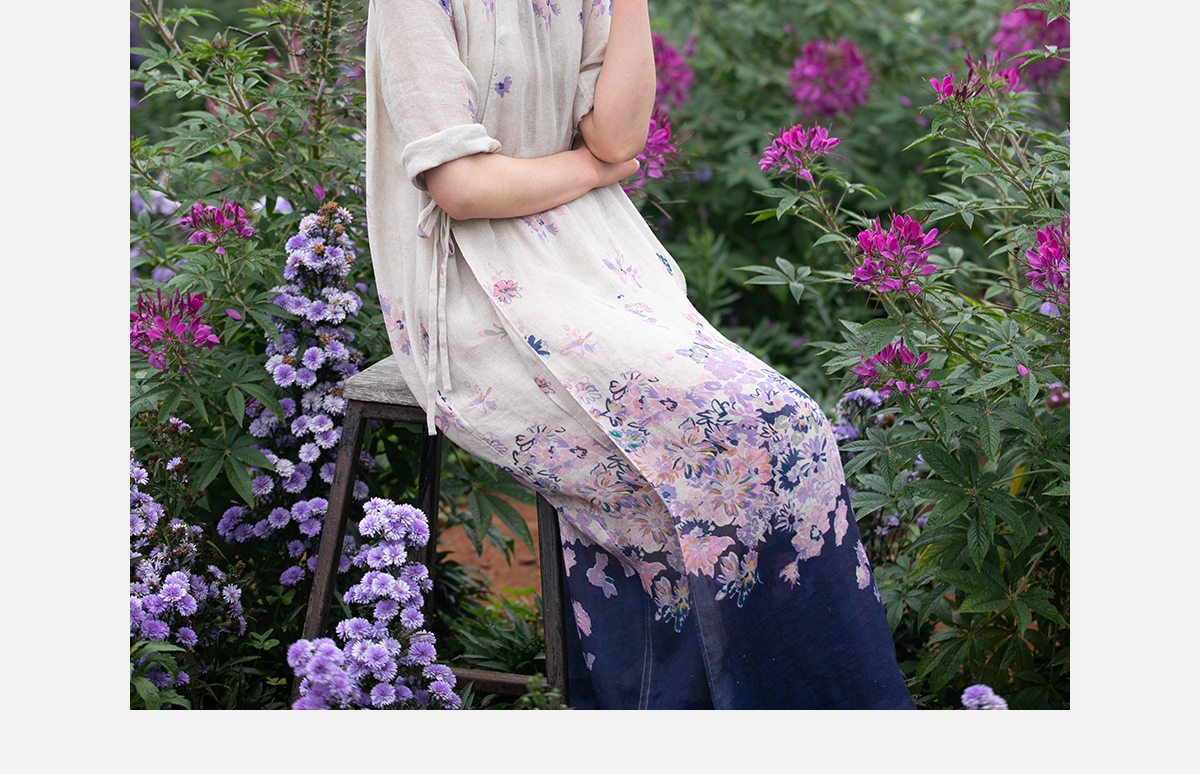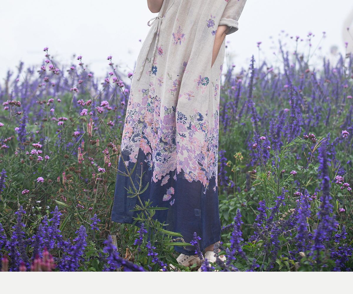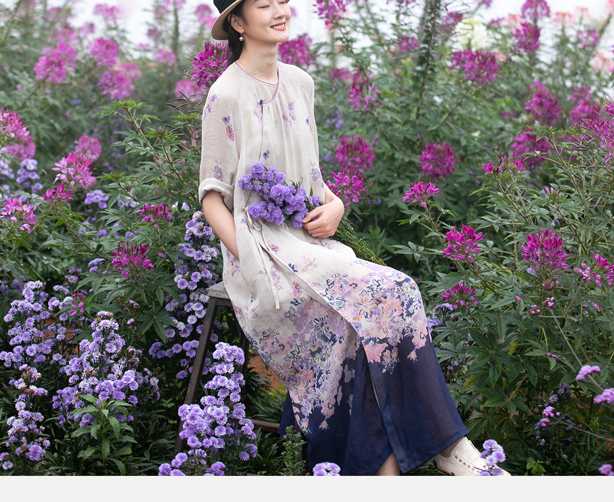 牧衣游原创 印花进口麻连衣裙女春季新款禅意复古新中式长裙 前雪