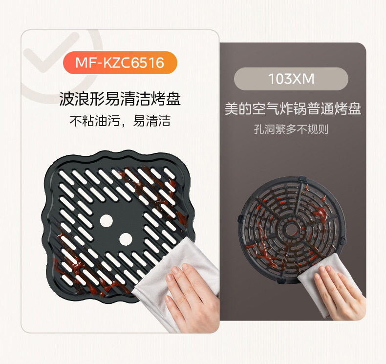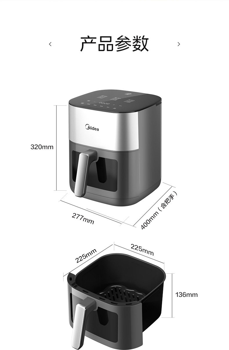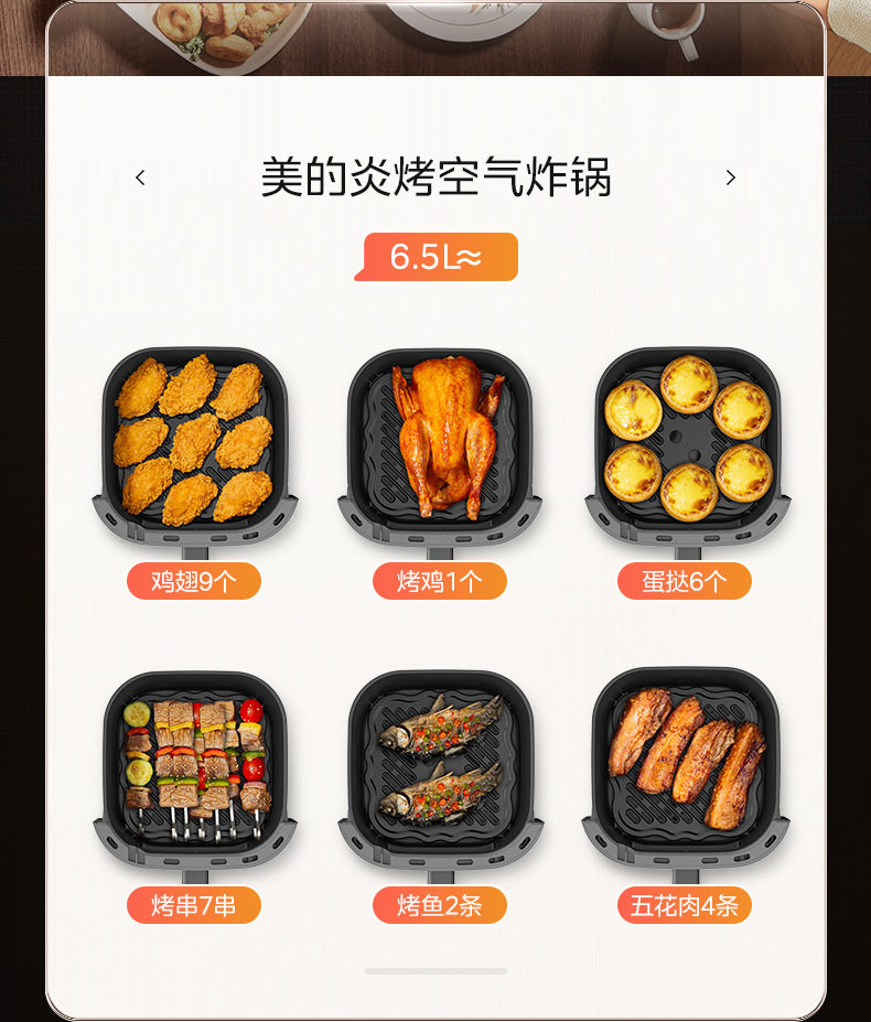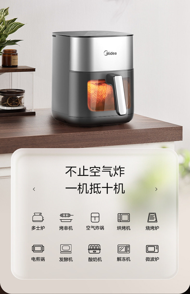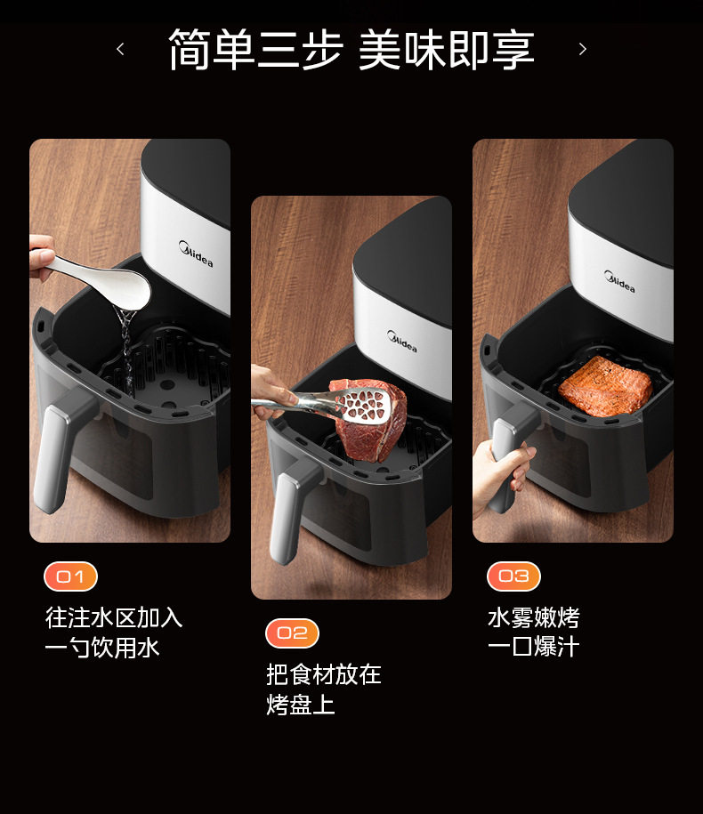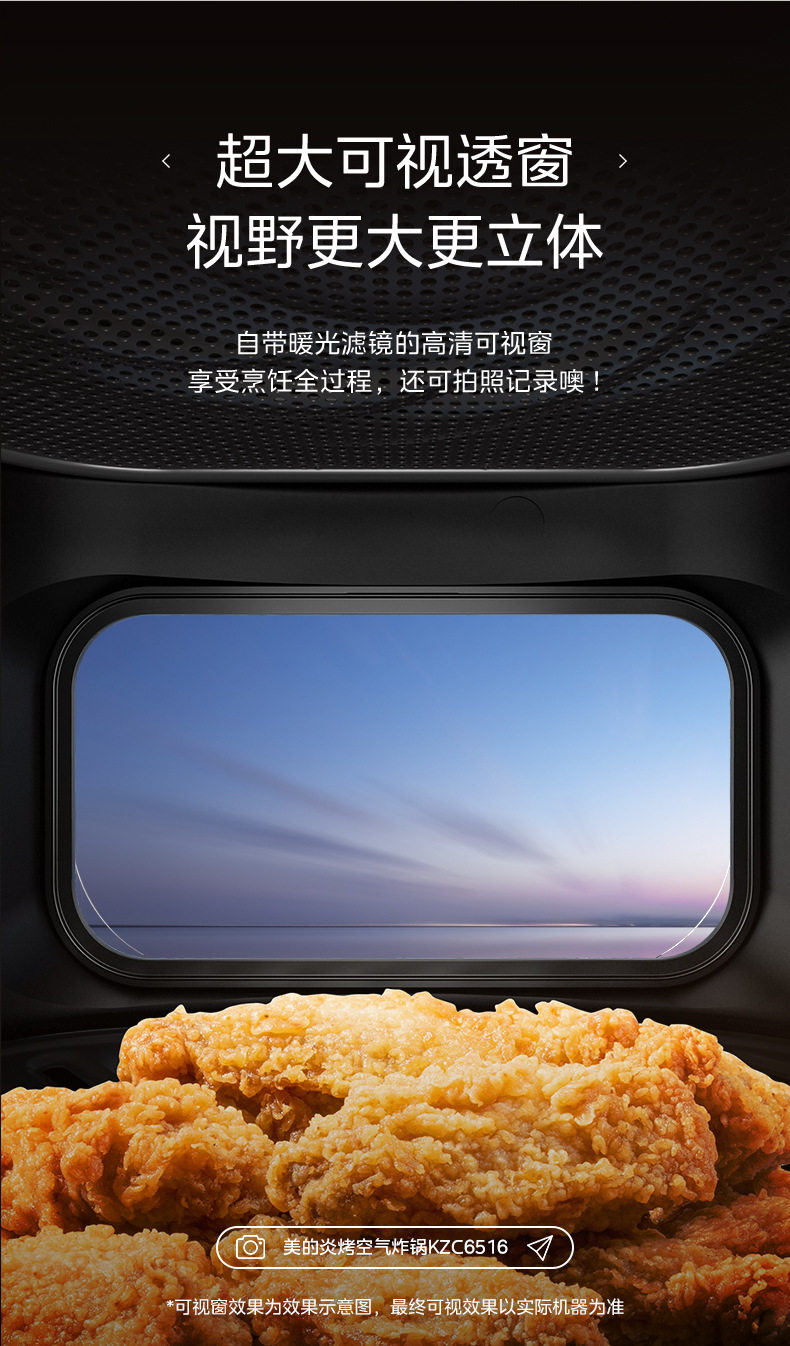 美的空气炸锅6.5L家用可视免翻面蒸汽多功能智能电炸锅MF-KZC6516
