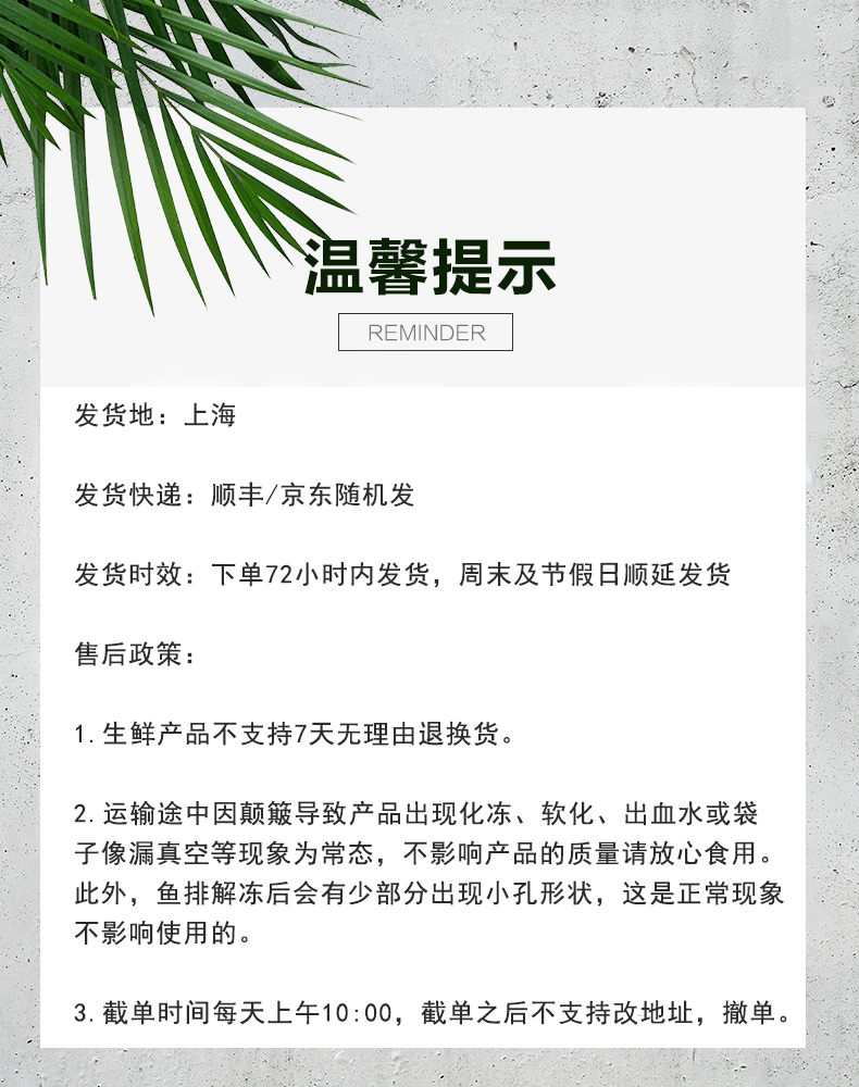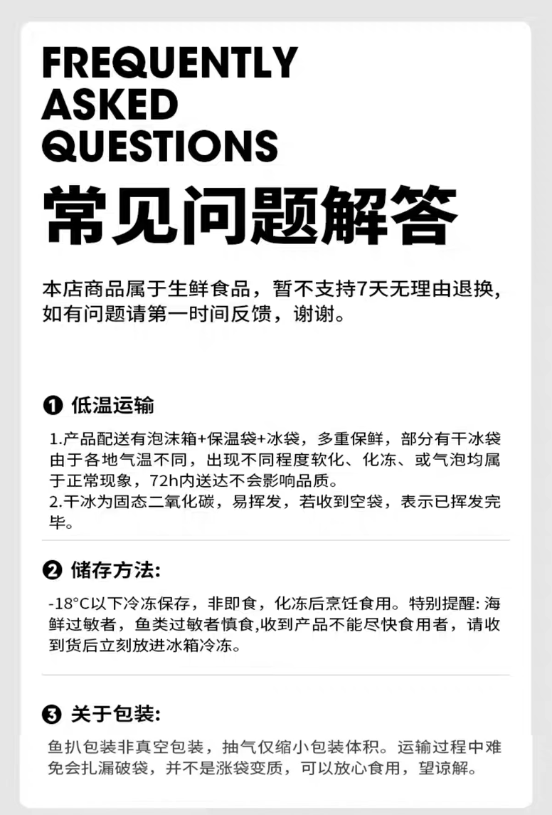 2.运输途中因颠簸导致产品出现化冻、软化、出血水或袋子像漏真空等现象为常态,不影响产品的质量请放心食用。此外,鱼排解冻后会有少部分出现小孔形状,这是正常现象不影响使用的。