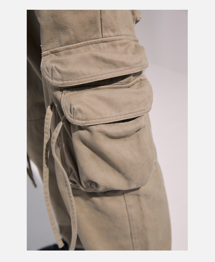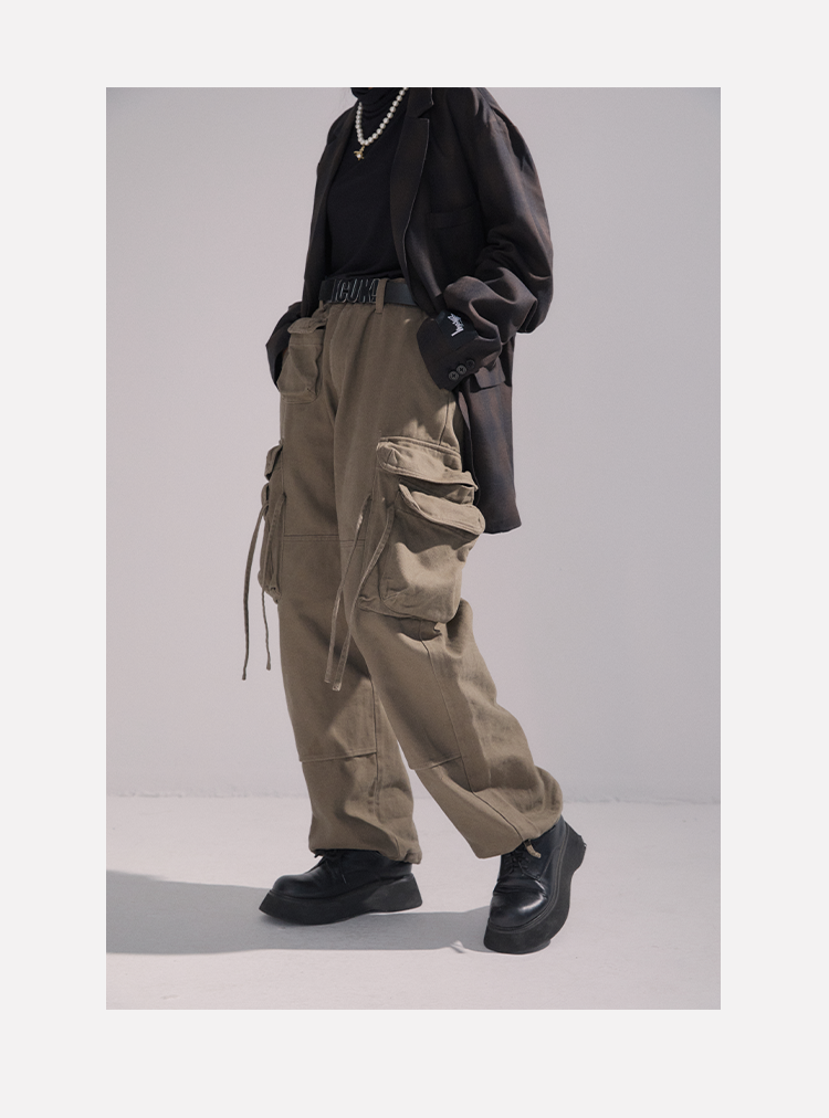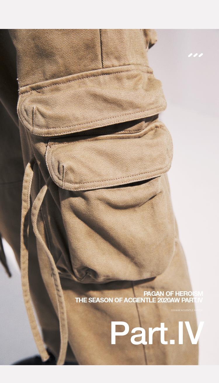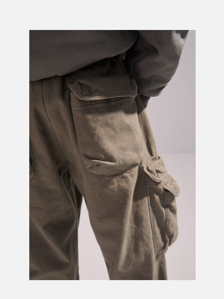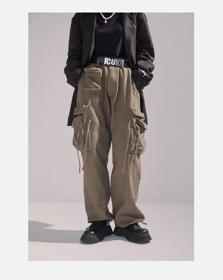 POH 古着感水洗重工直筒休闲裤男束脚长裤做旧朋克宽松多口袋军裤