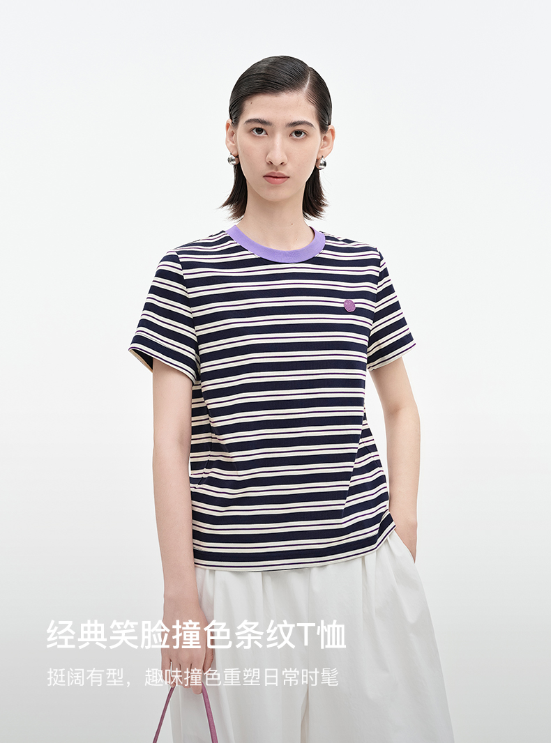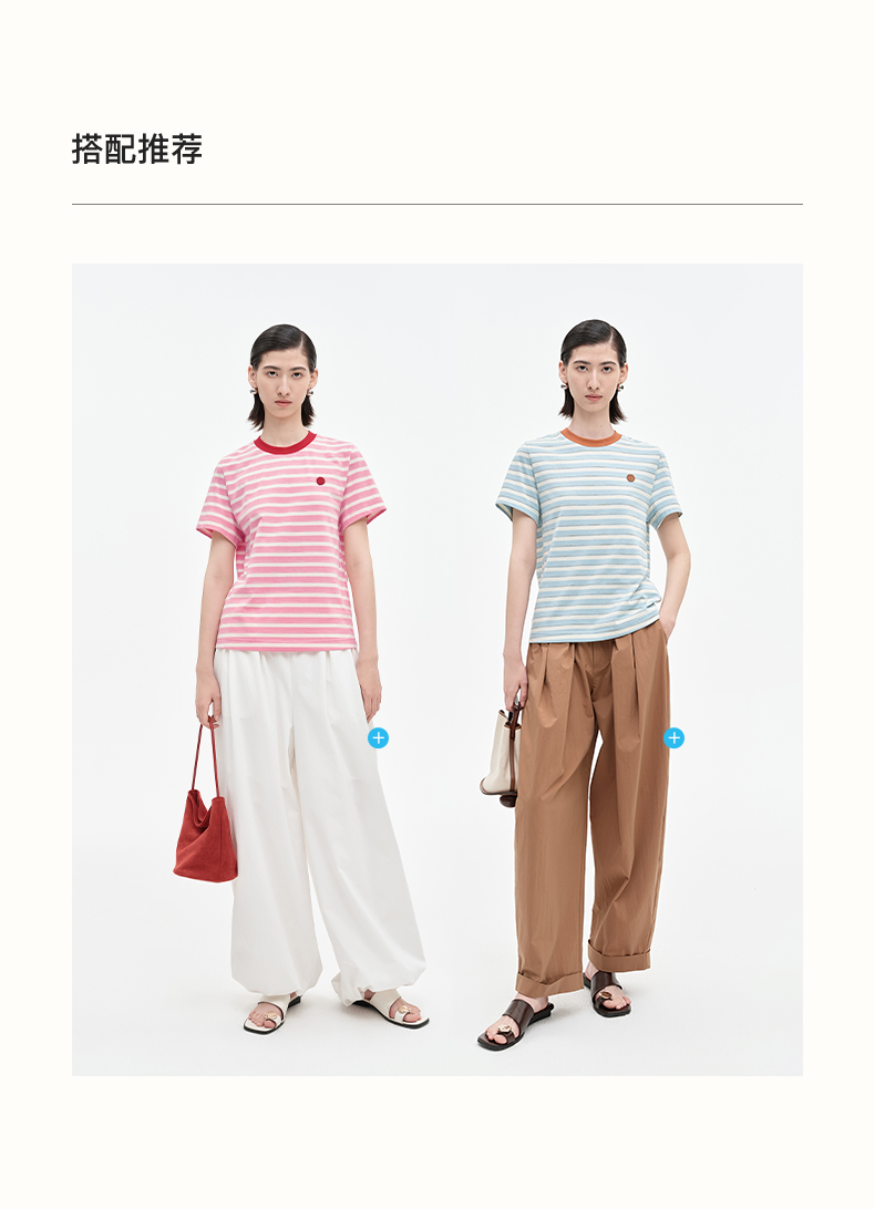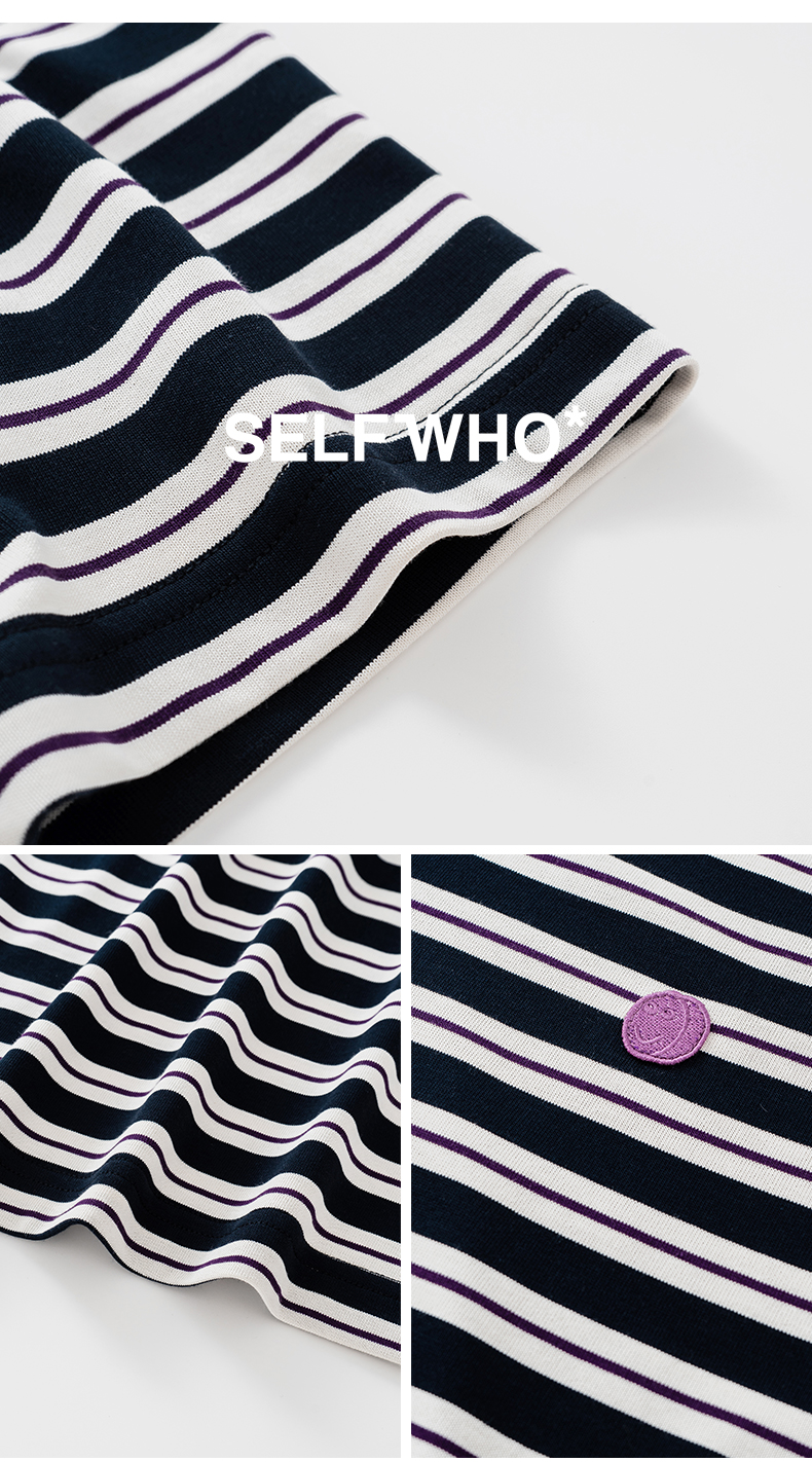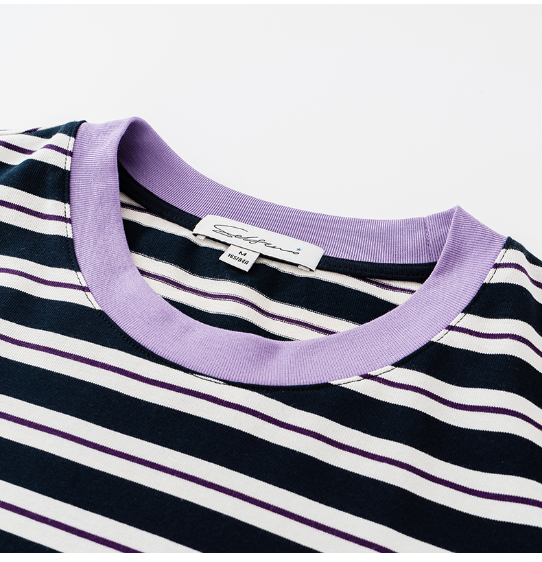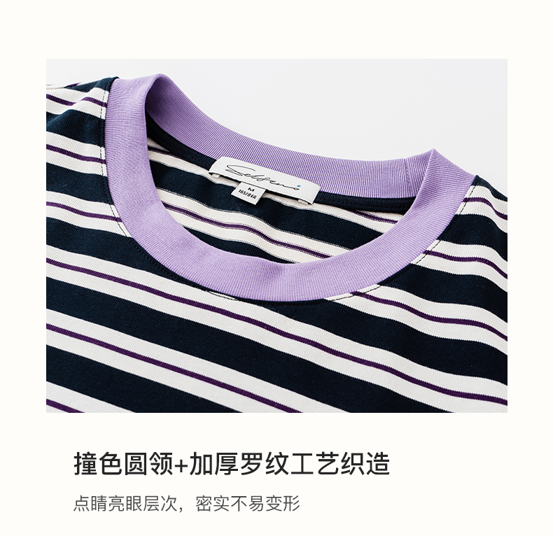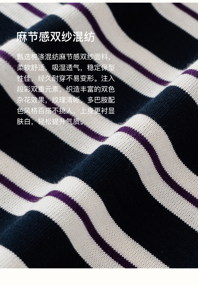 SELFWHO麻节感双纱混纺条纹短袖t恤女2025夏季新款撞色圆领短上衣