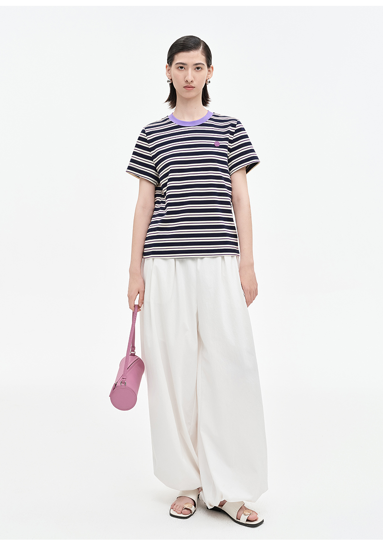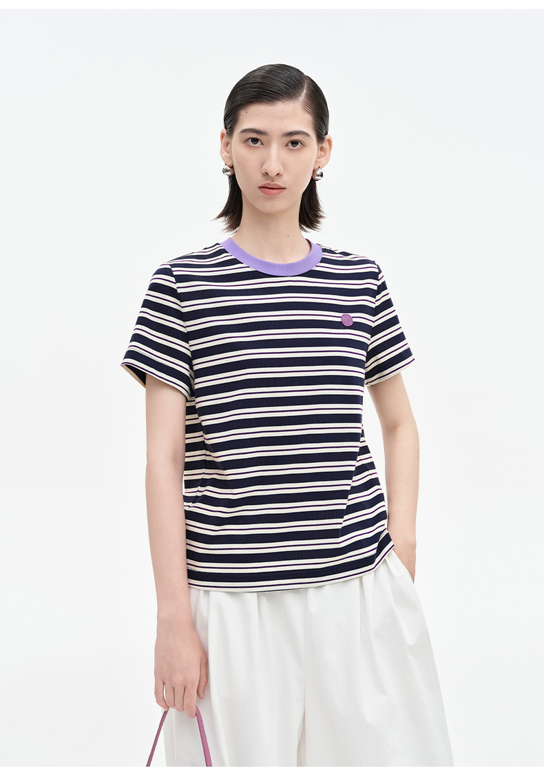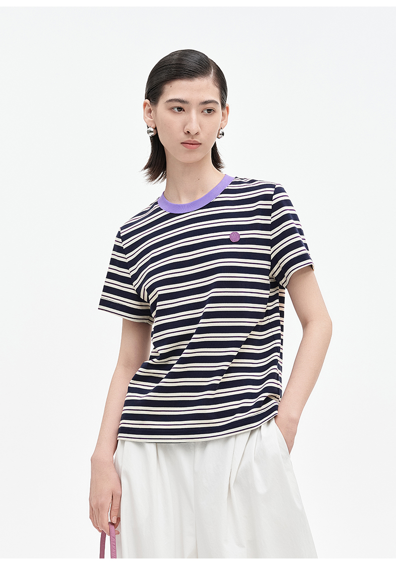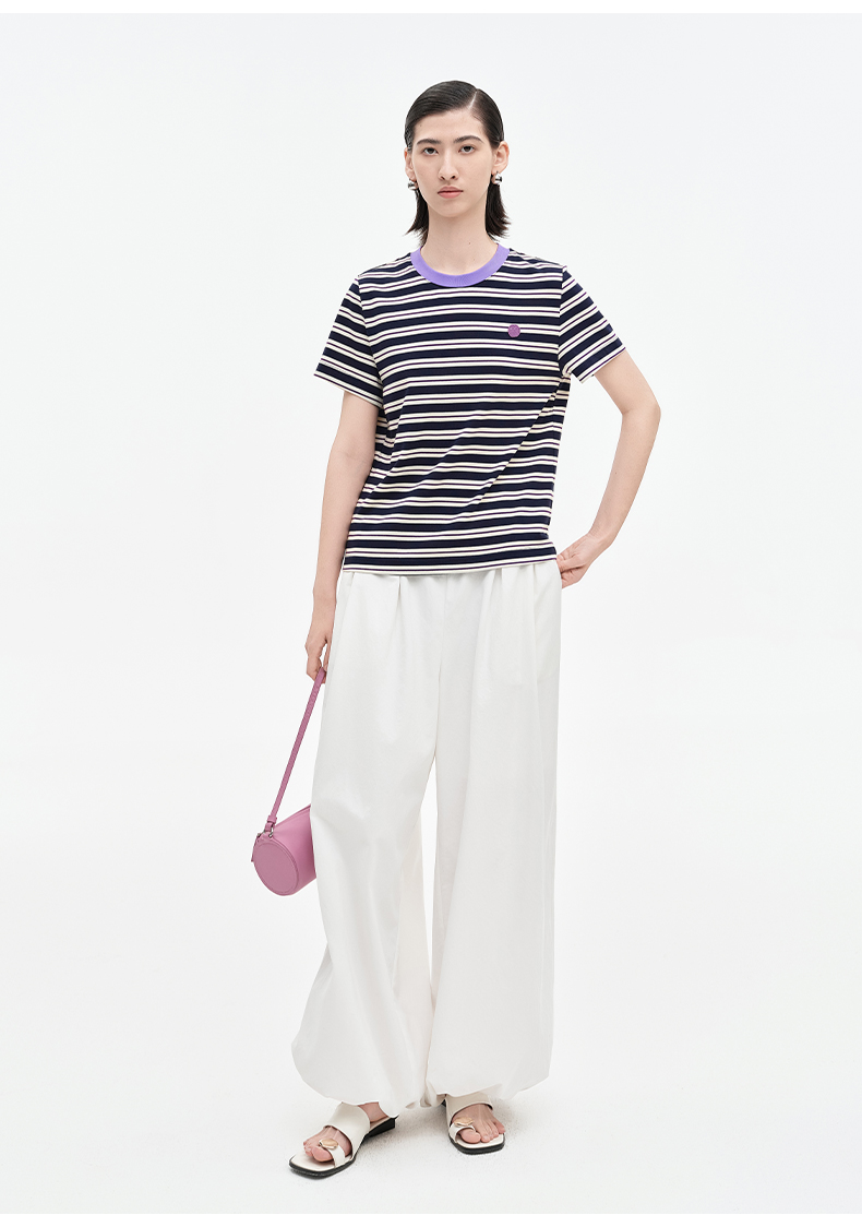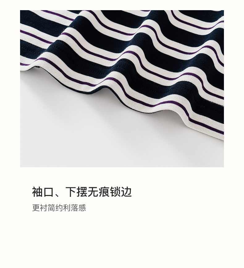 SELFWHO麻节感双纱混纺条纹短袖t恤女2025夏季新款撞色圆领短上衣