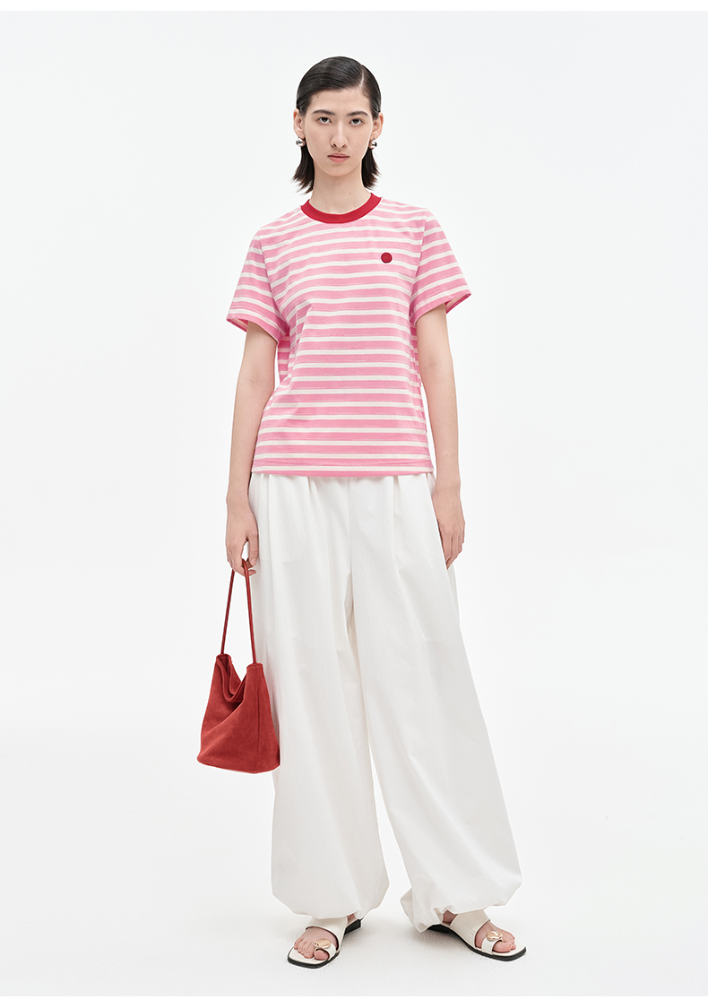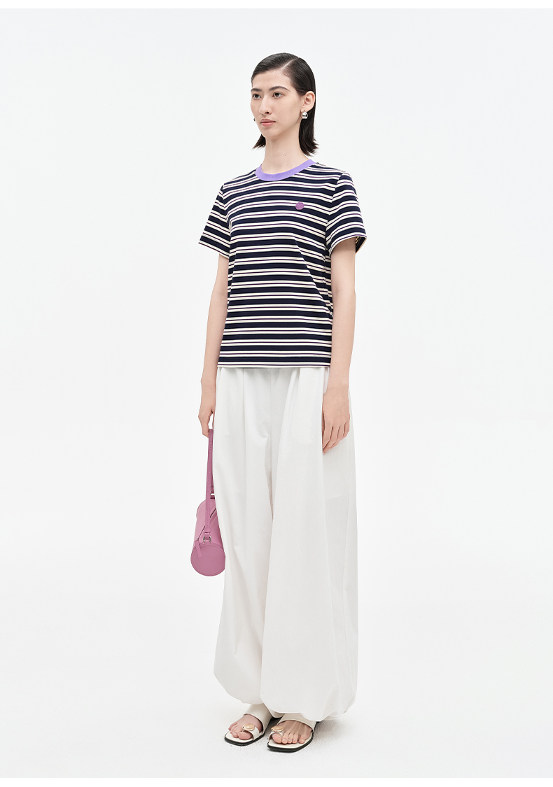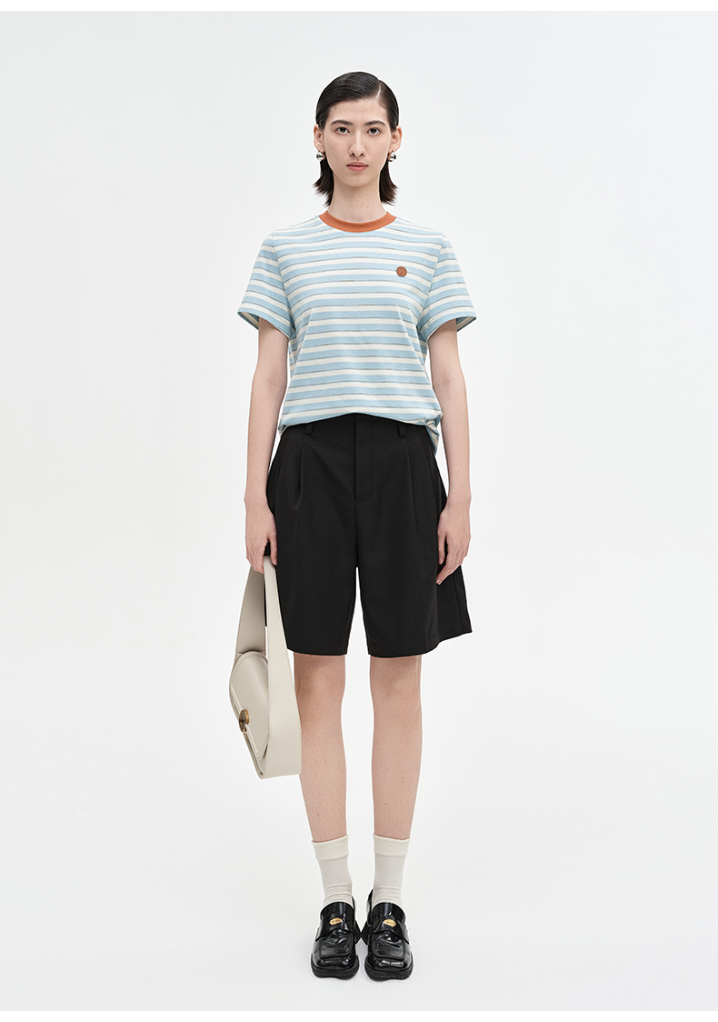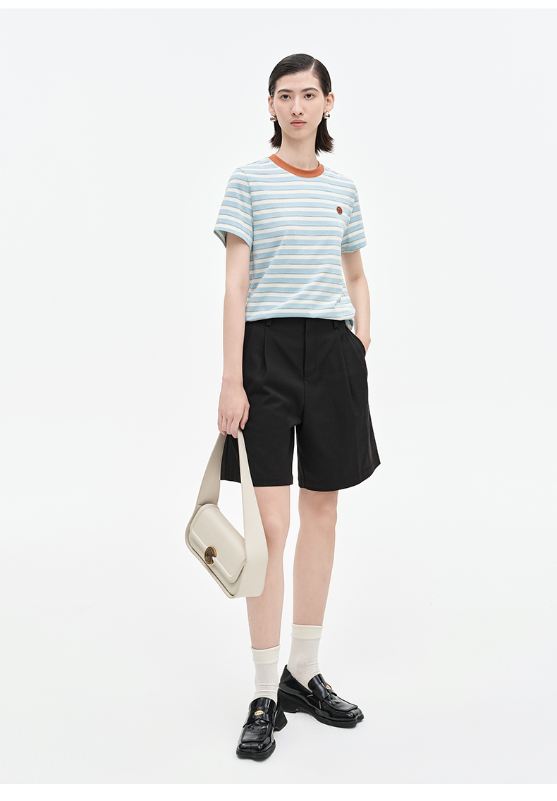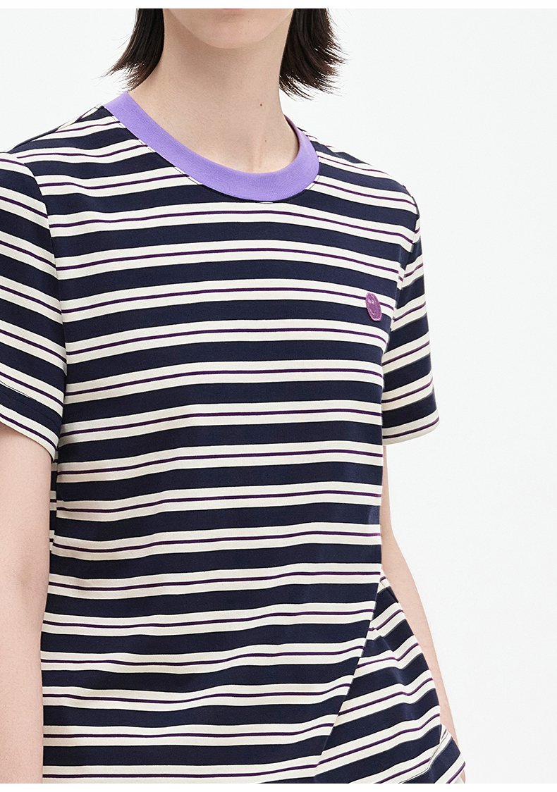 SELFWHO麻节感双纱混纺条纹短袖t恤女2025夏季新款撞色圆领短上衣