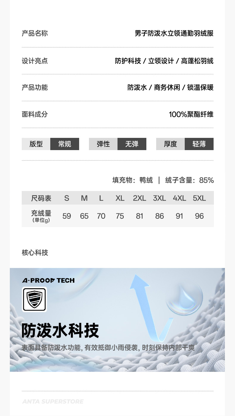 超级安踏运动羽绒服男士秋冬通勤商务休闲立领防泼水夹克外套152548909U