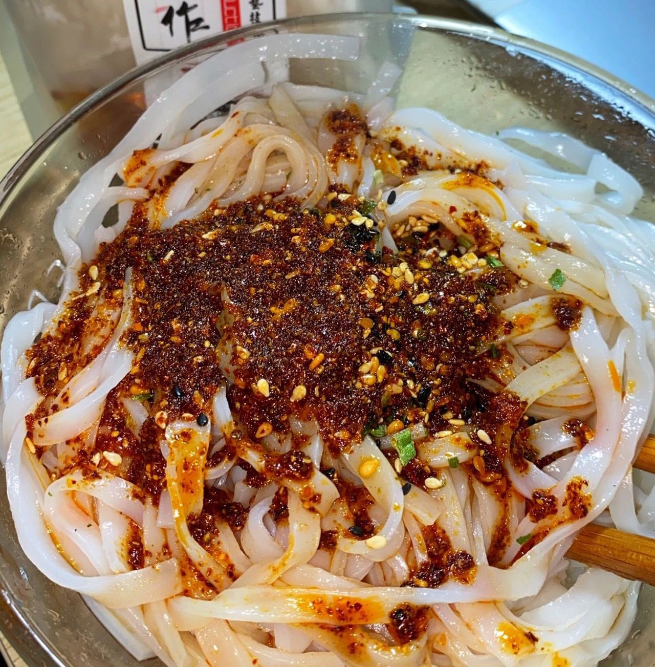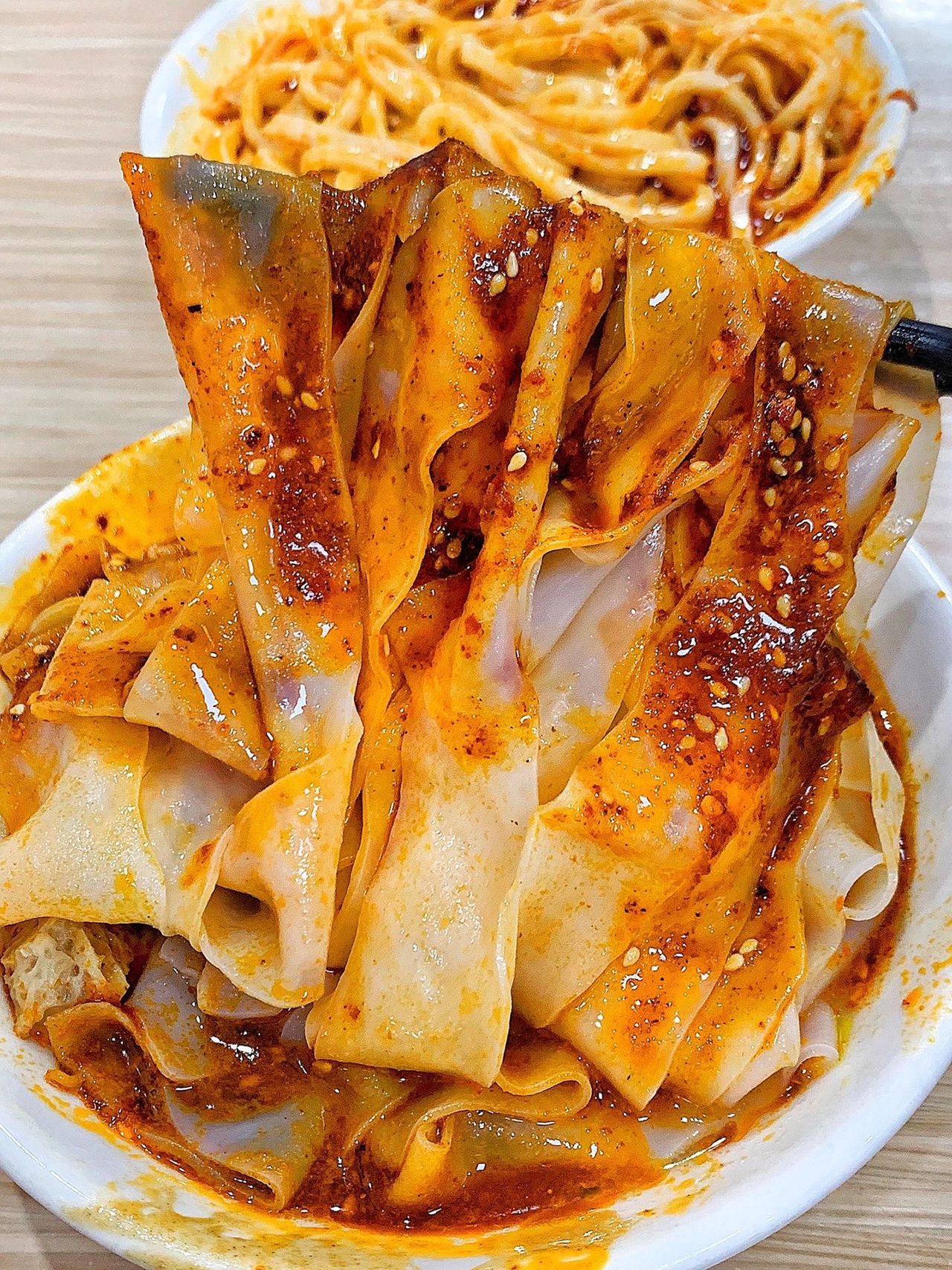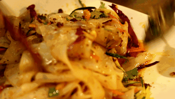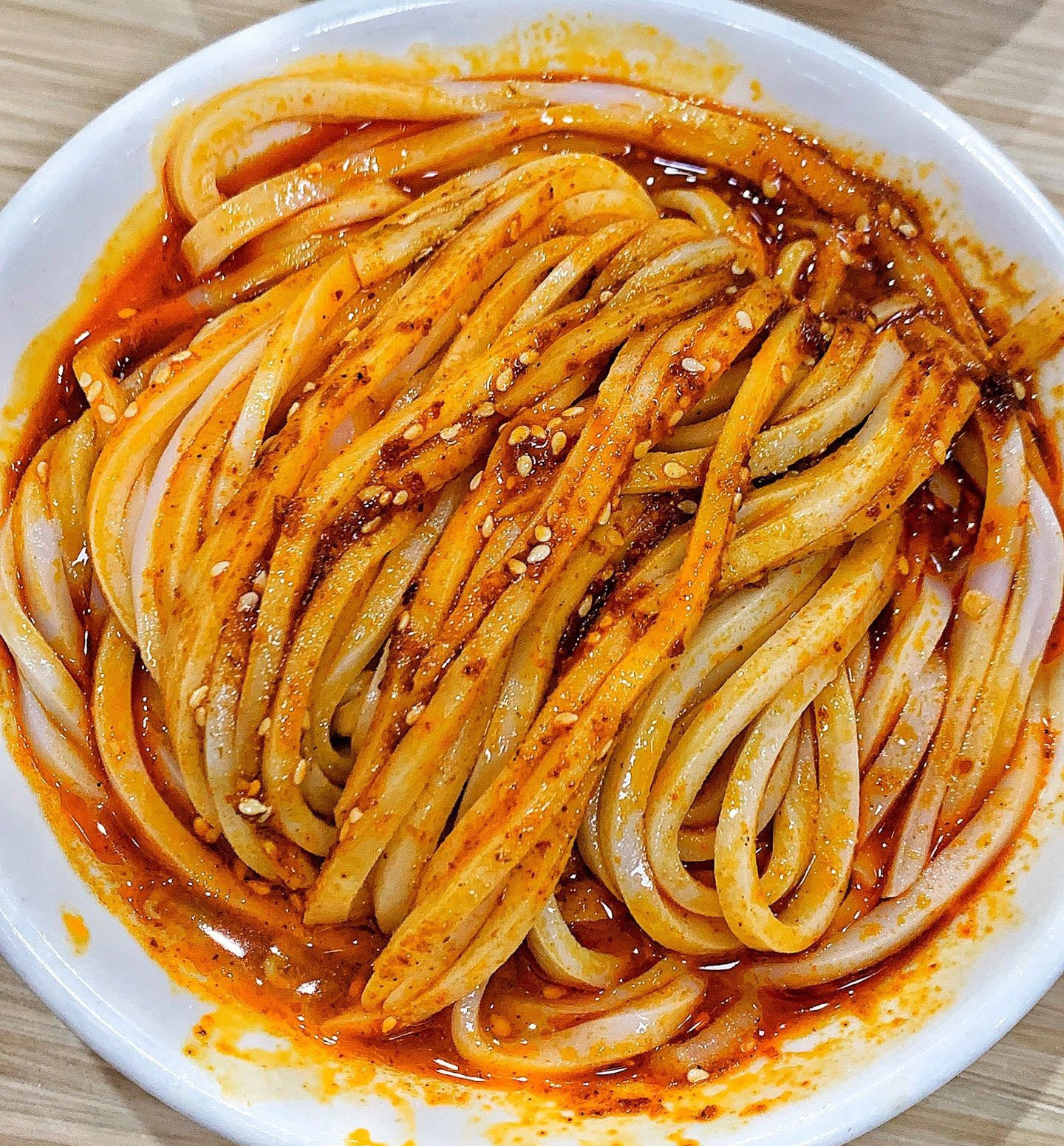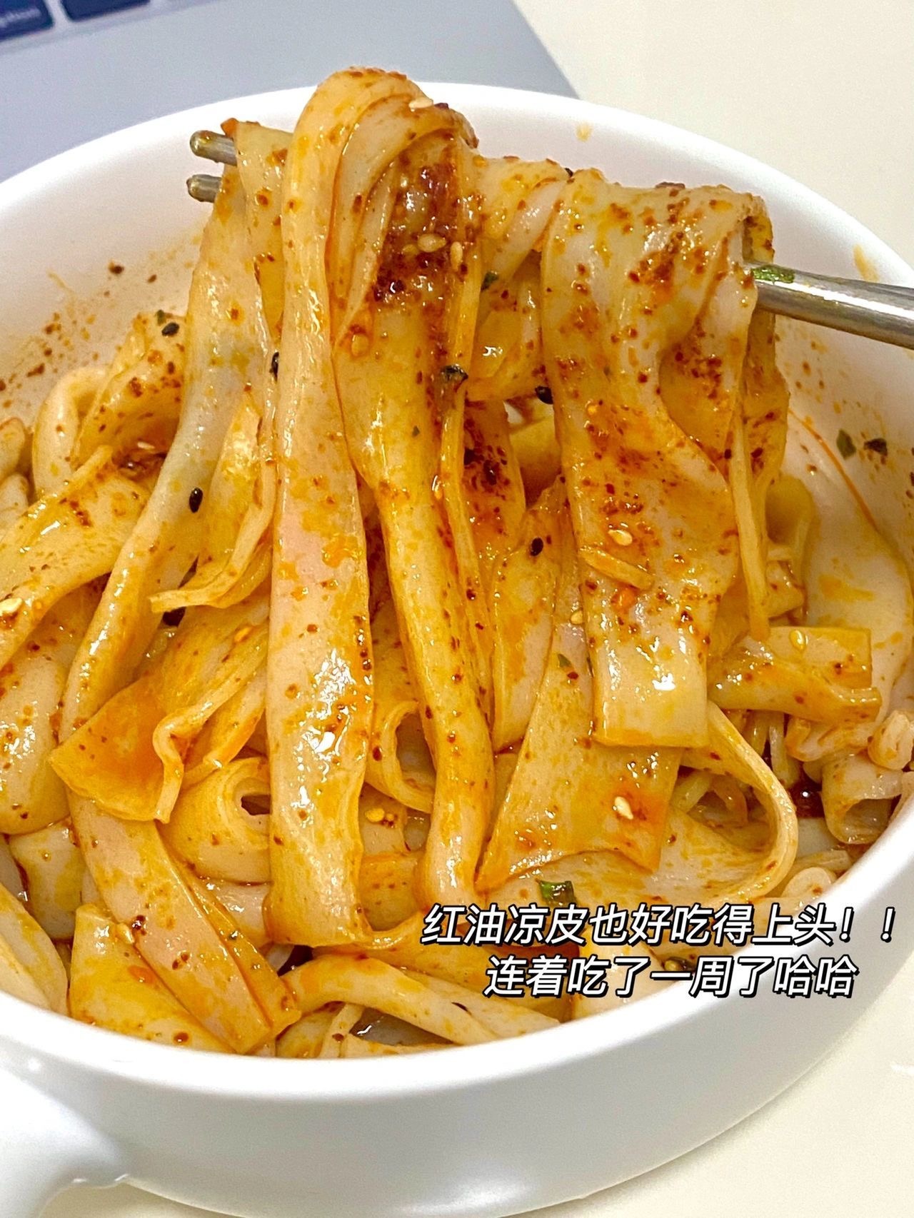 厚且劲道的凉皮加上重重的辣椒油