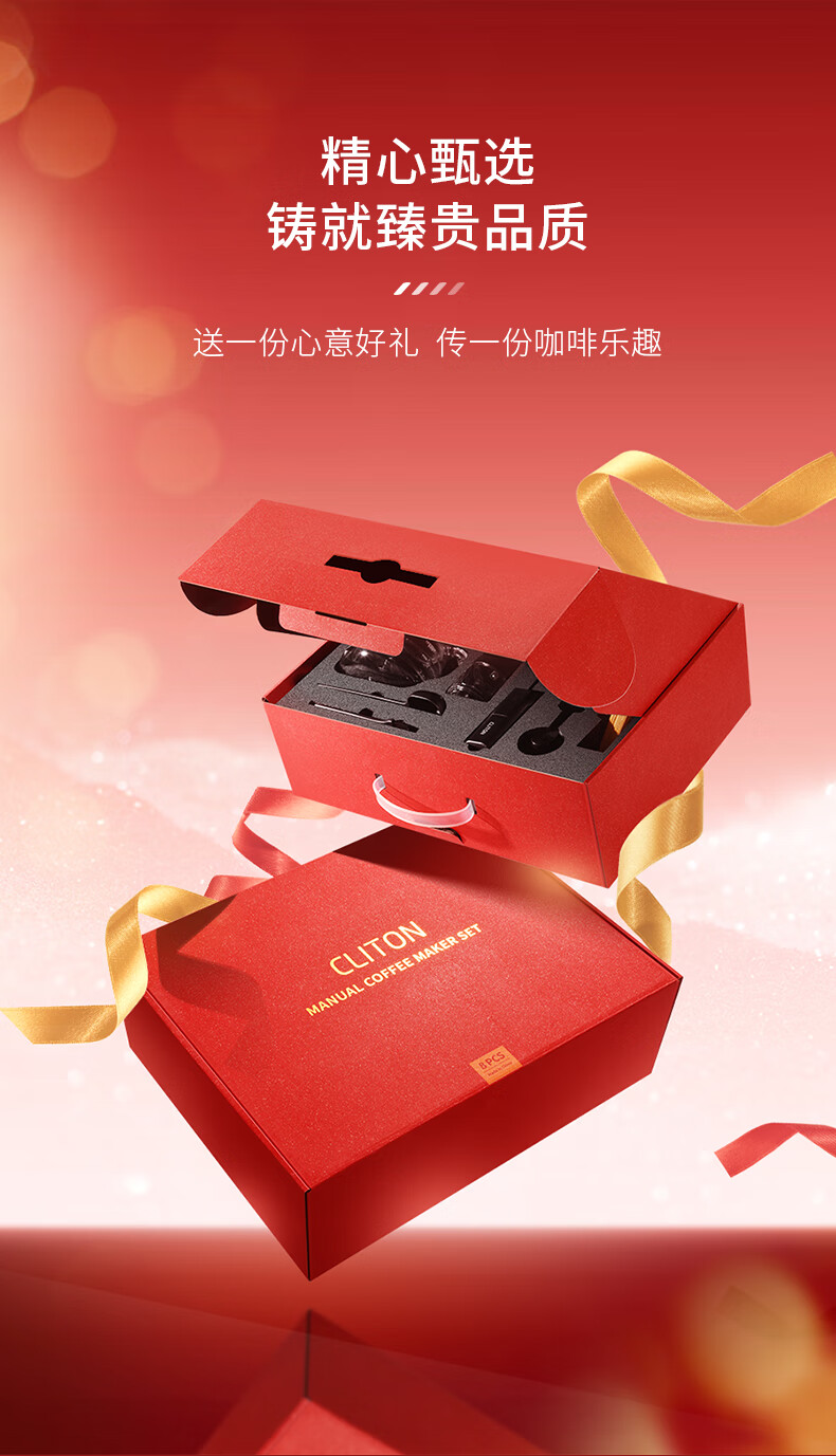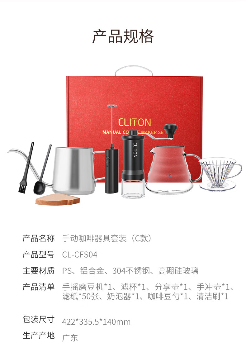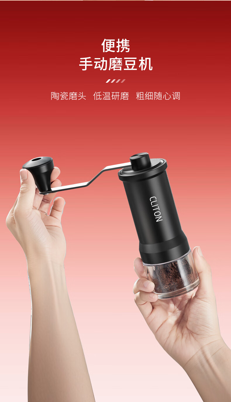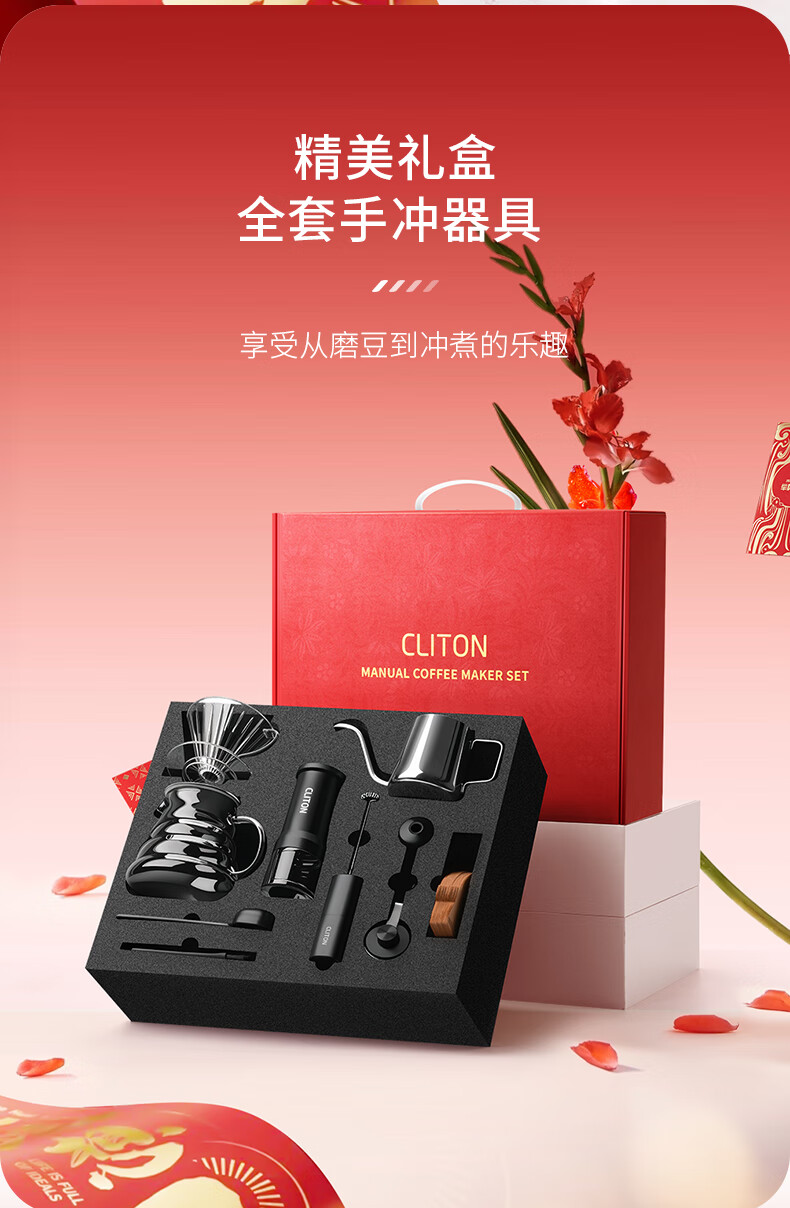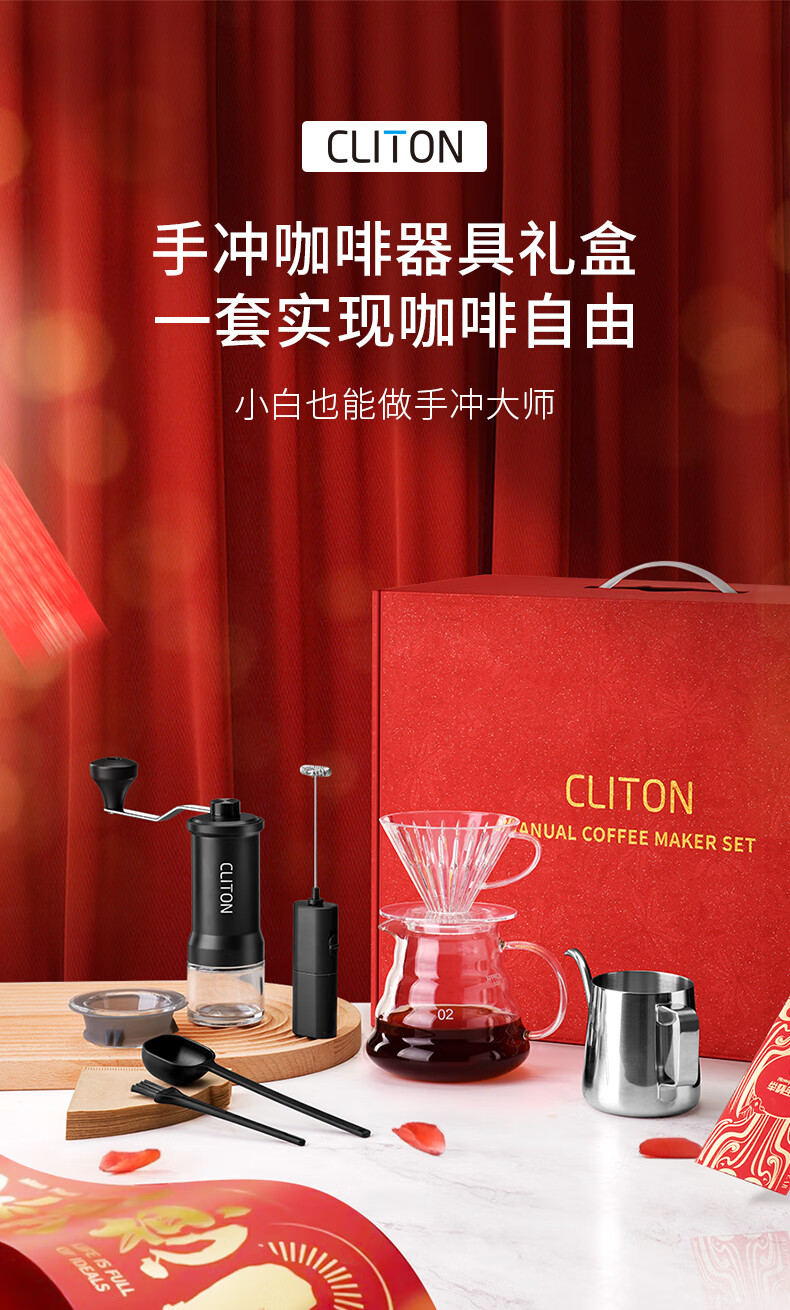 积分免费兑:CLITON手摇磨豆机咖啡豆研磨机手磨咖啡机咖啡壶滤杯手冲壶新年礼盒套装