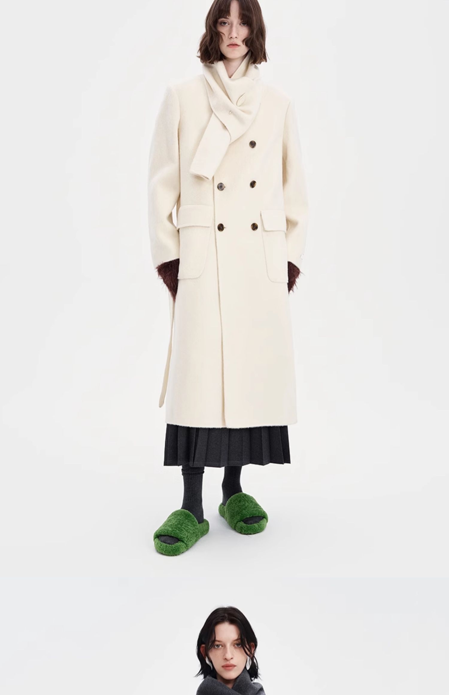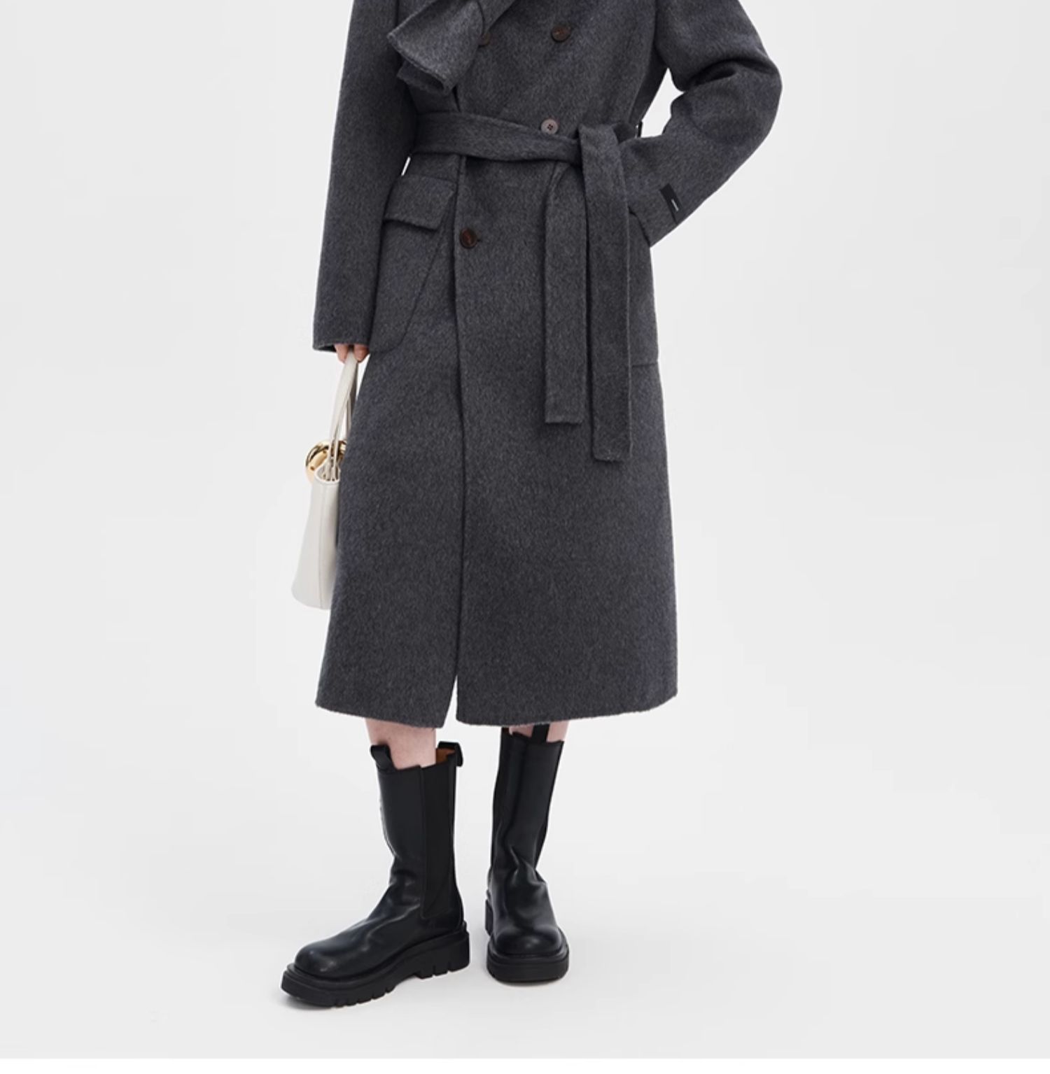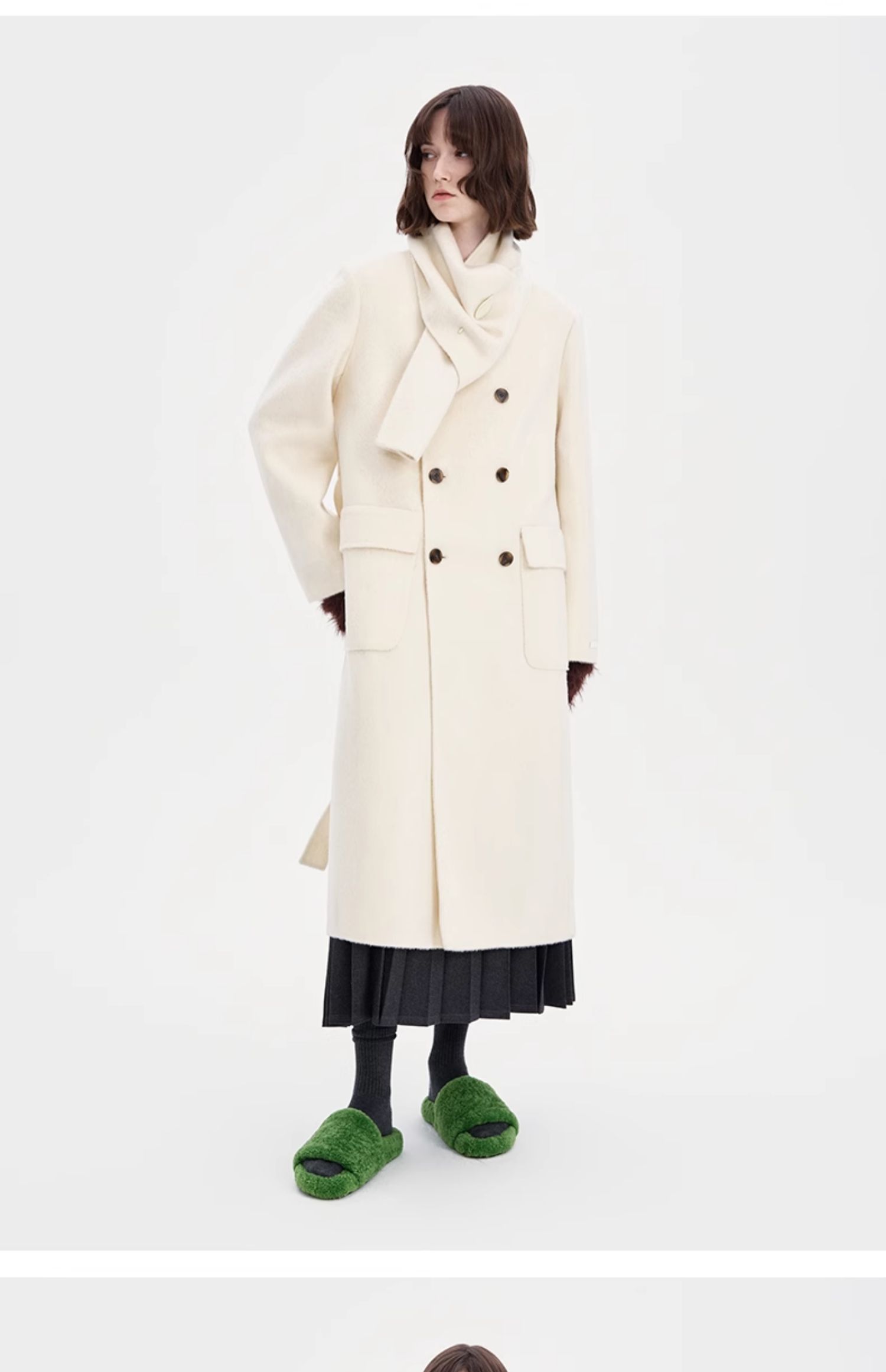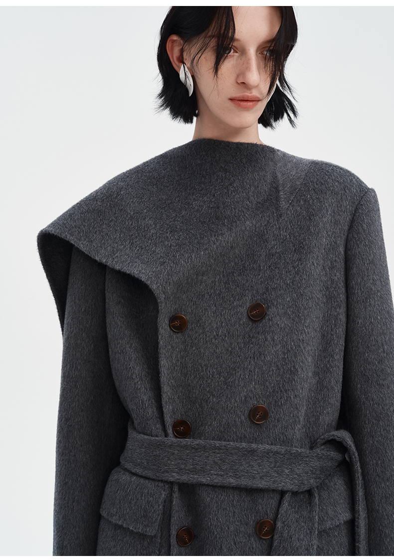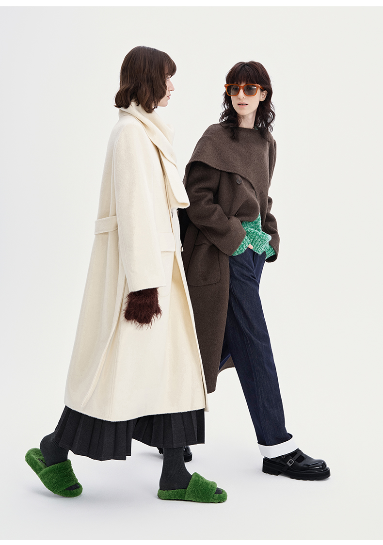 SELFWHO咖色澳洲进口绵羊毛苏力羊驼毛围巾领双面呢大衣女冬外套