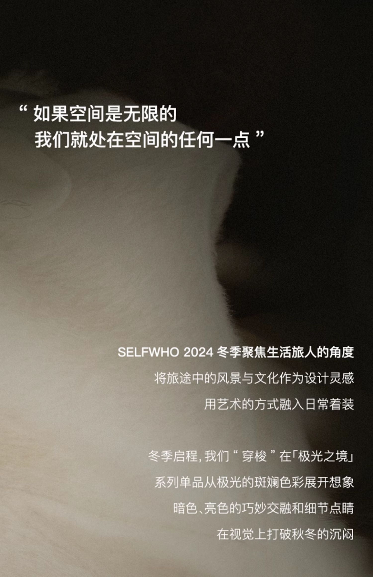 - SELFWHO——将街头文化融入高级成衣,以服装为载体,用廓形、解构设计和艺术意象探寻极致的生活方式。特立独行,知行合一,TO BE YOURSELF。