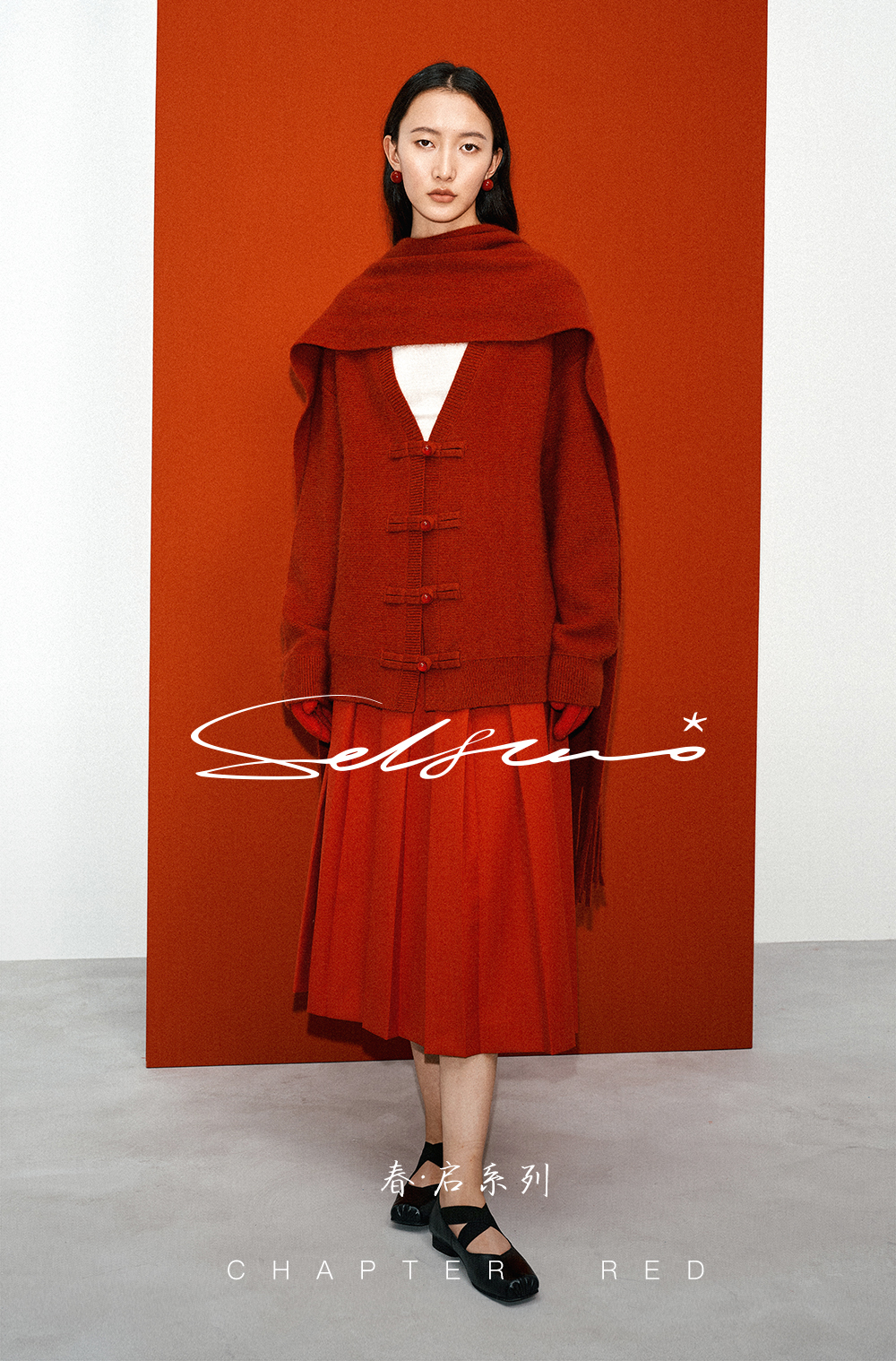 SELFWHO绵羊毛混纺圣诞红国风盘扣V领针织衫女2025冬新款落肩毛衣