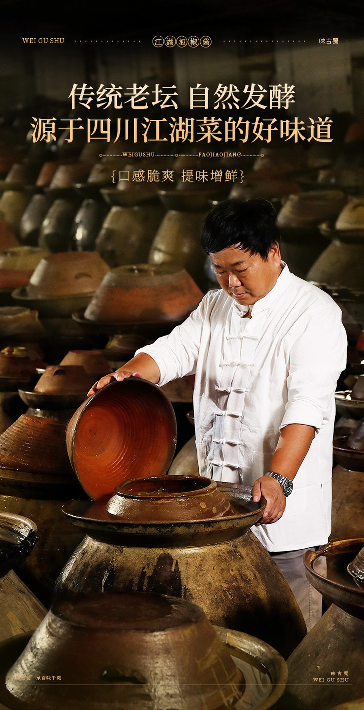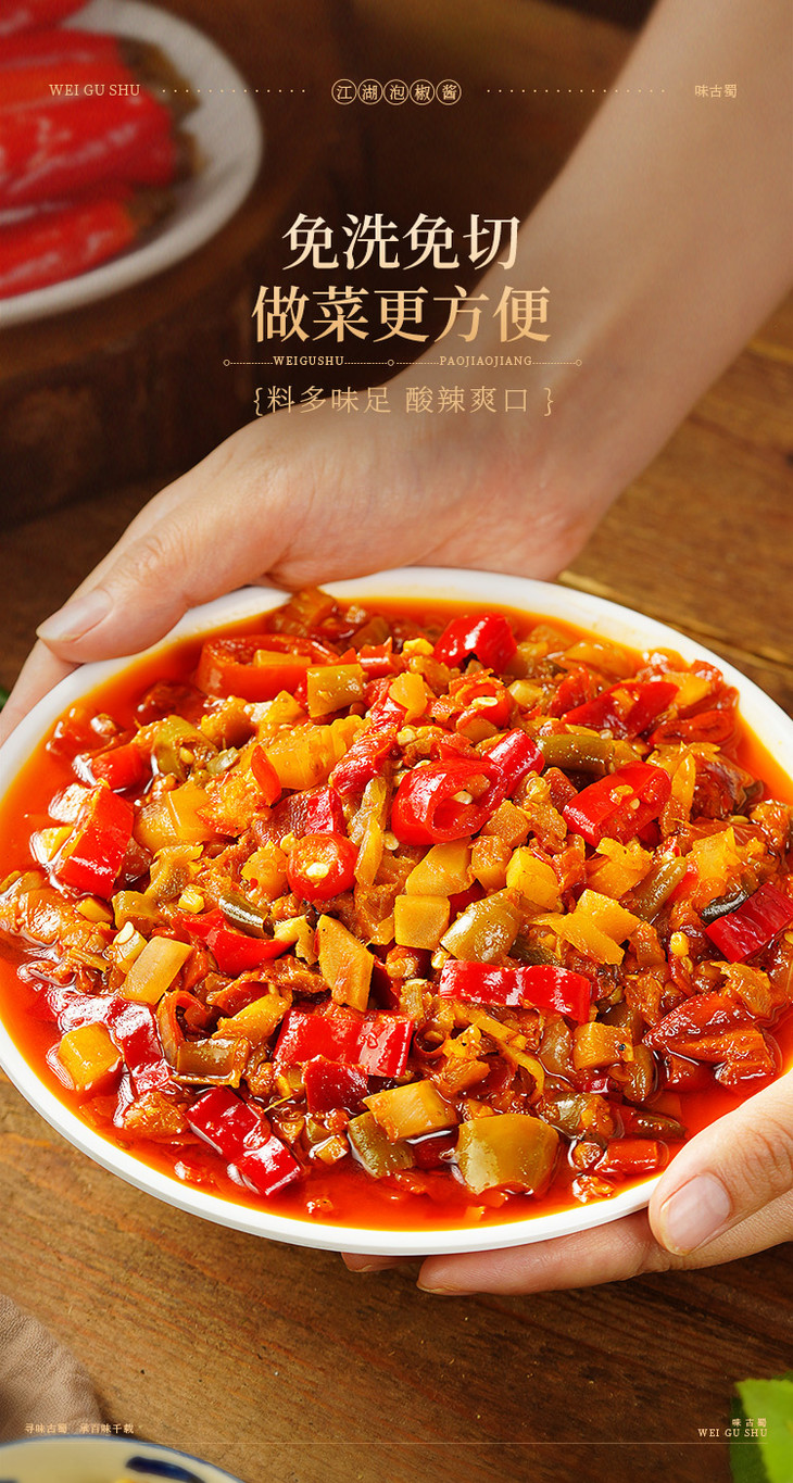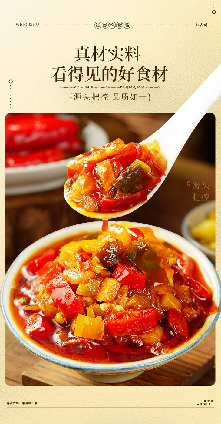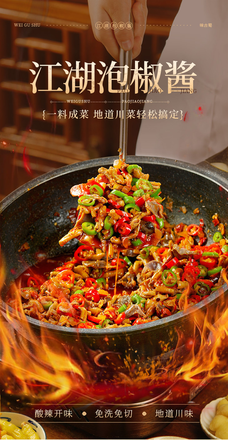 江湖菜的风味入味彻底,富有层次感,绝不单一的重油重味、大麻大辣、大燥大辛、大酸大咸, 而是追求五味平衡的综合味道的呈现,有滋有味,有颜有色,以麻辣擅长、酸辣突出、家常浓郁而著称, 既味中有味,又有主次之别,层次之分。 一款优秀的酱料,是能让人吃出“画面感”的。 味古蜀的泡椒酱,口感绝非单一的辣