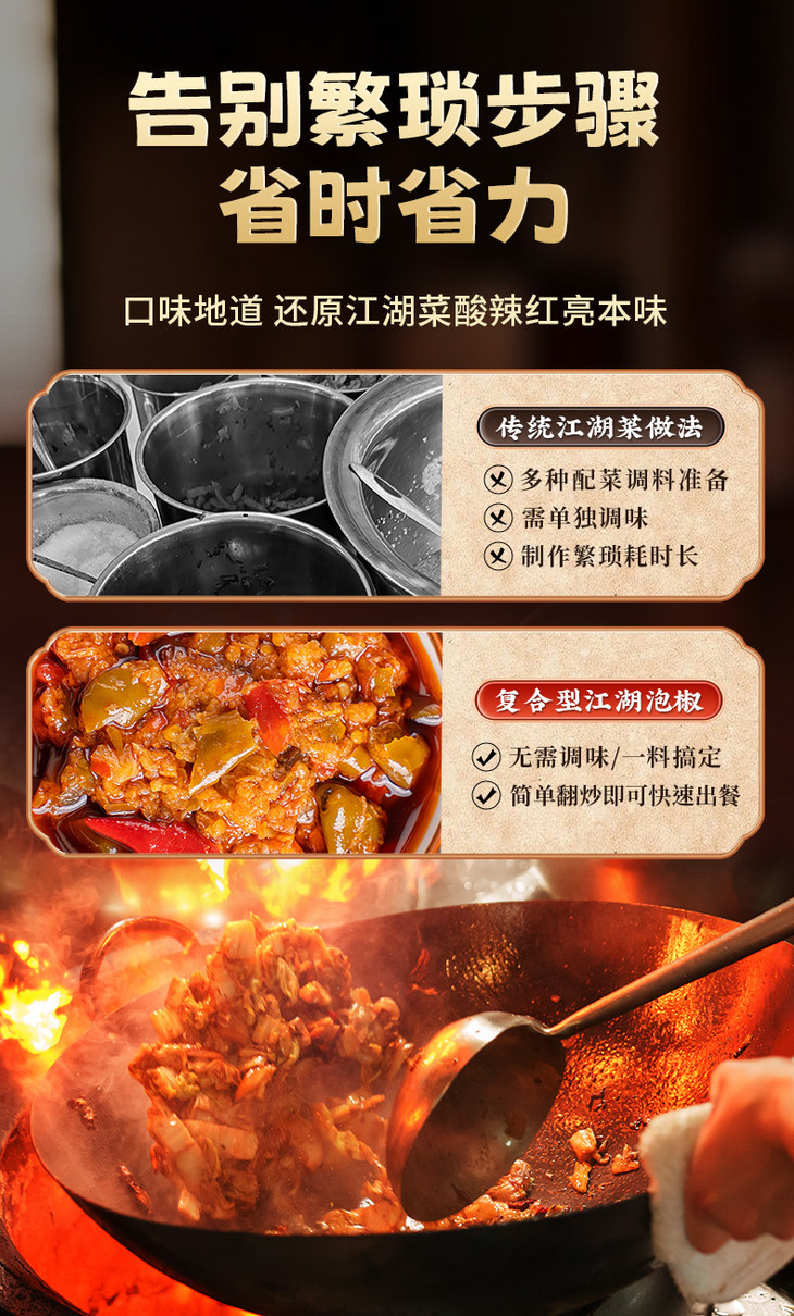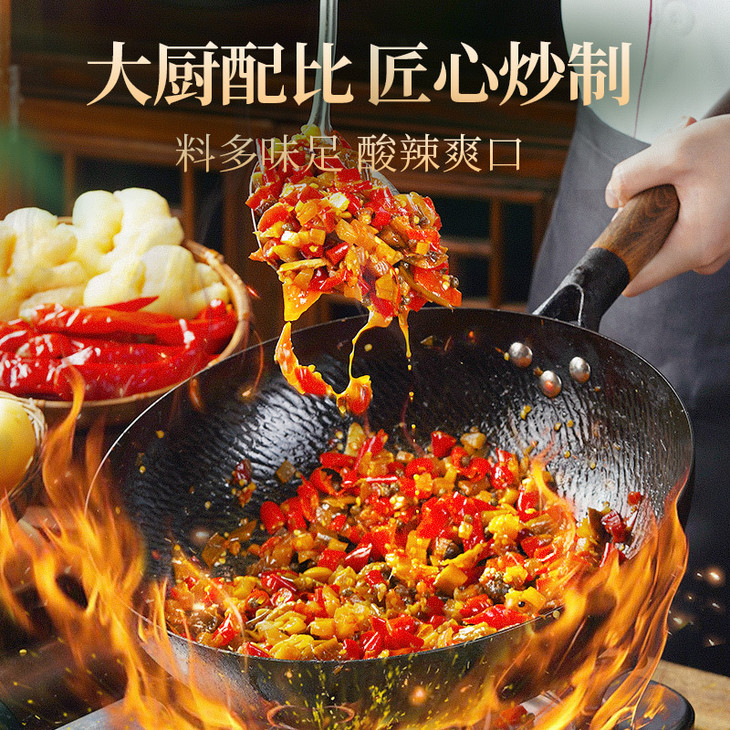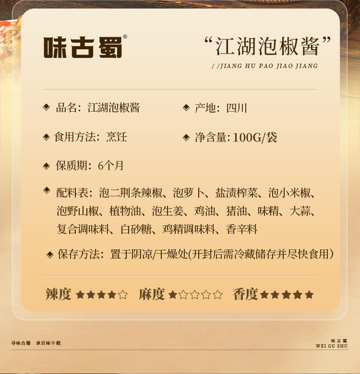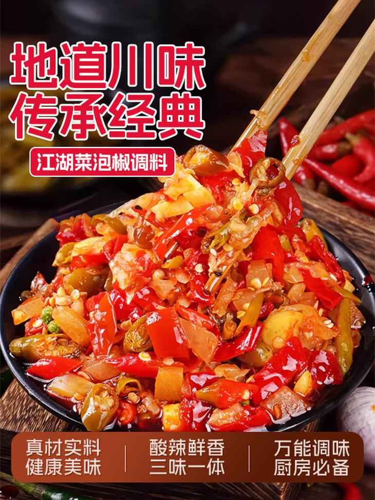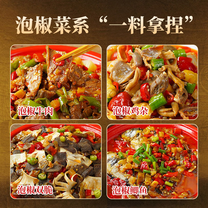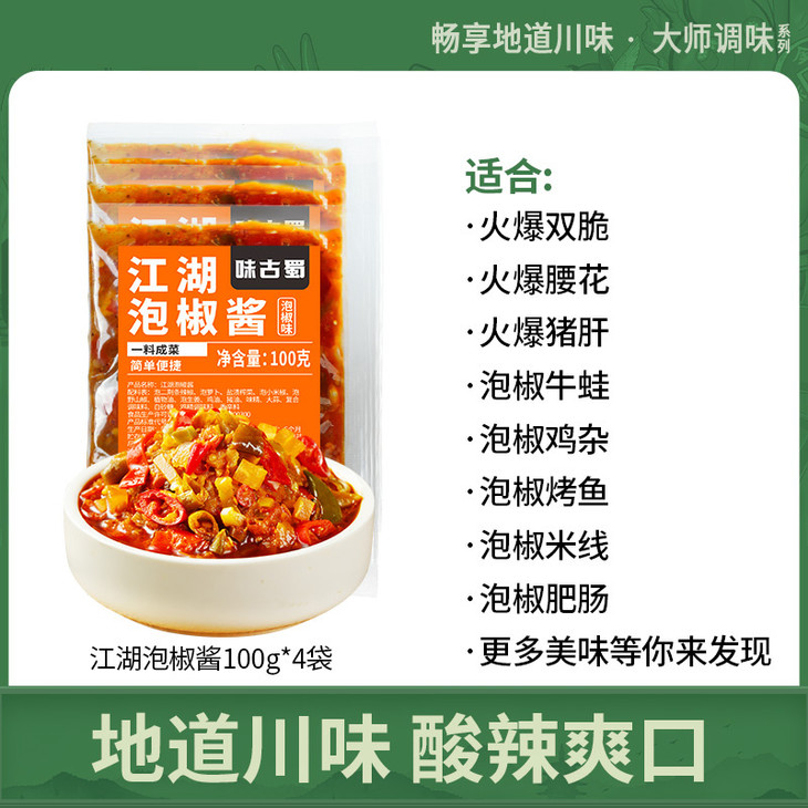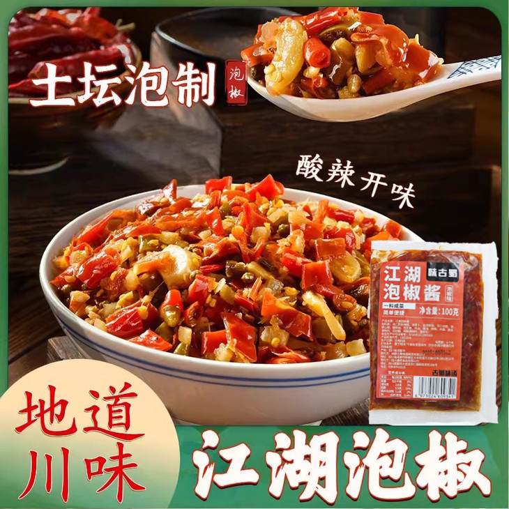 一袋在手,无需准备繁琐的泡椒、泡姜、剁蒜, 无需调和复杂的味道比例,您已经是半个川菜大师了。 100g的份量,刚好满足一次烹饪的需求,新鲜不浪费,便捷又地道👍👍 精选天然料,慢泡出醇香 一袋小包装,百变江湖菜💥💥