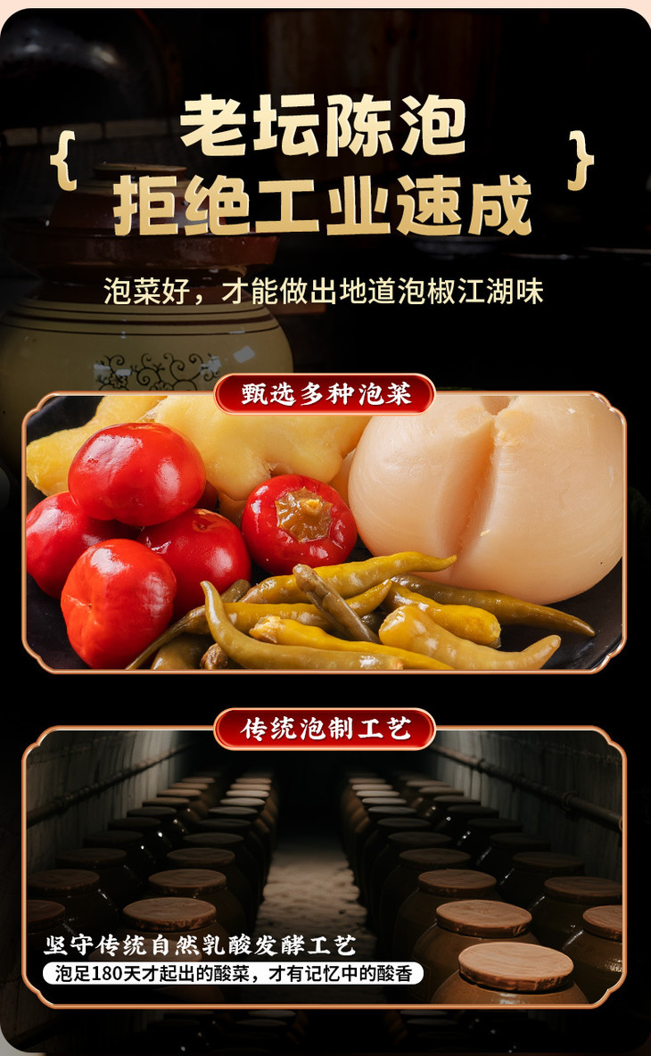 江湖泡椒酱的风味核心,全部来自于“泡”——这一古老的乳酸发酵工艺。 所有辣椒、萝卜、生姜、野山椒等,均采用传统四川老坛,自然发酵 口感脆爽,提味增鲜 泡出酸得透亮,辣得清爽的味道 一口下去,仿佛回到了小时候围着泡菜坛流口水的日子🤤