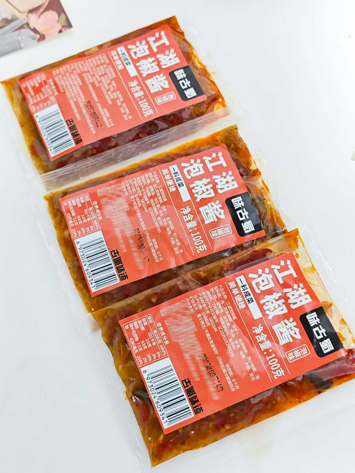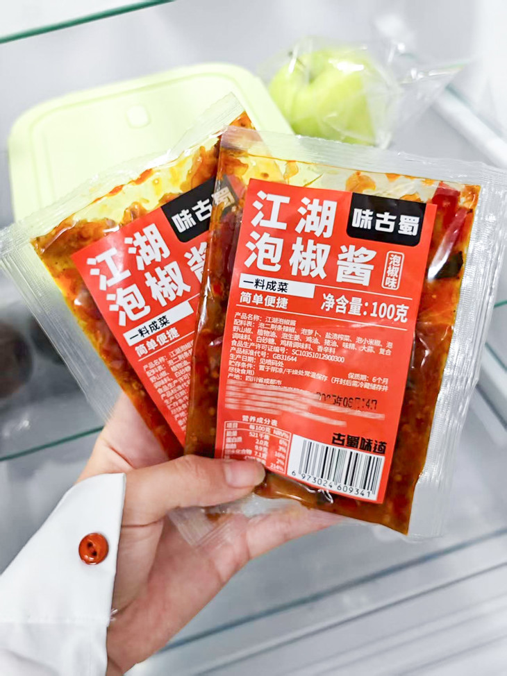【味古蜀江湖泡椒酱】 鲜红透亮,酸辣交融 地道正宗的江湖泡椒酱 分分钟让全国川菜爱好者们欲罢不能‼️‼️ 打开袋子,闻起来它的香气超级浓郁 发酵的鲜味突出,醇厚而富有攻击性的酸辣香气 江湖菜皆可用,加菜即炒 炒菜放一袋就特别提鲜提味‼️