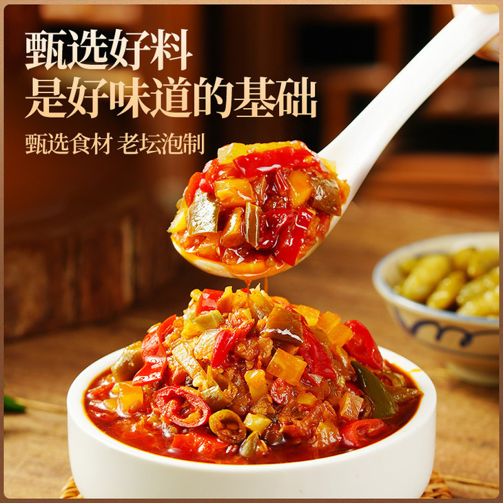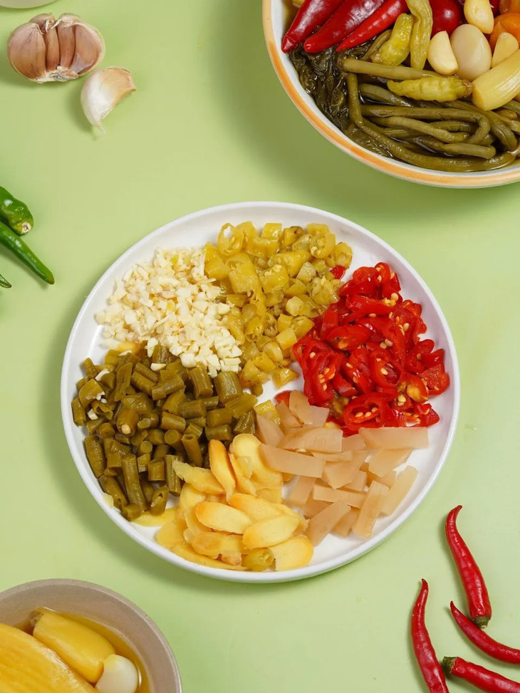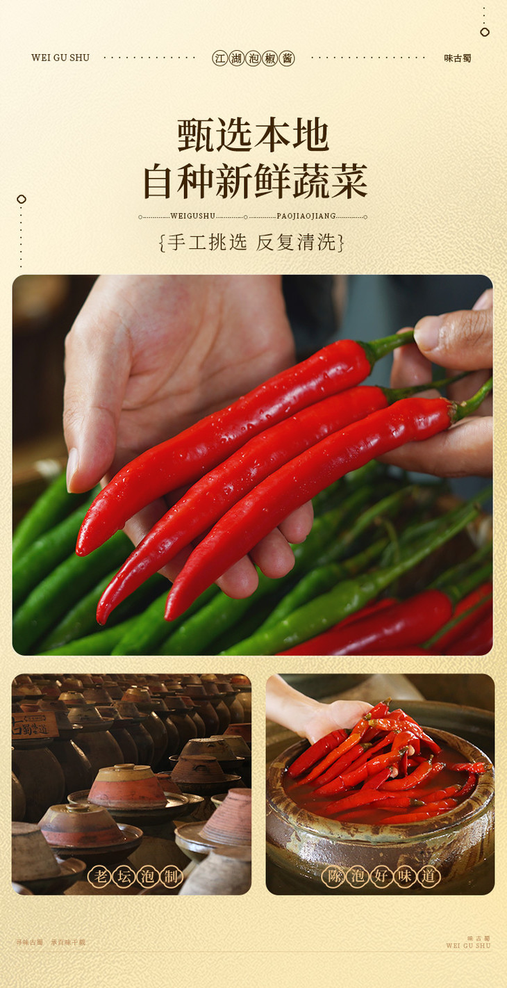 甄选本地自种新鲜蔬菜 手工挑选,反复清洗 加入辣椒、姜等食材和秘制香辛料🌶️ 最后用清水封坛 让乳酸菌慢慢发酵 酿出的泡椒带着醇厚又清爽的酸,是很清新的泡椒味 远胜工业速成的尖锐酸💯!