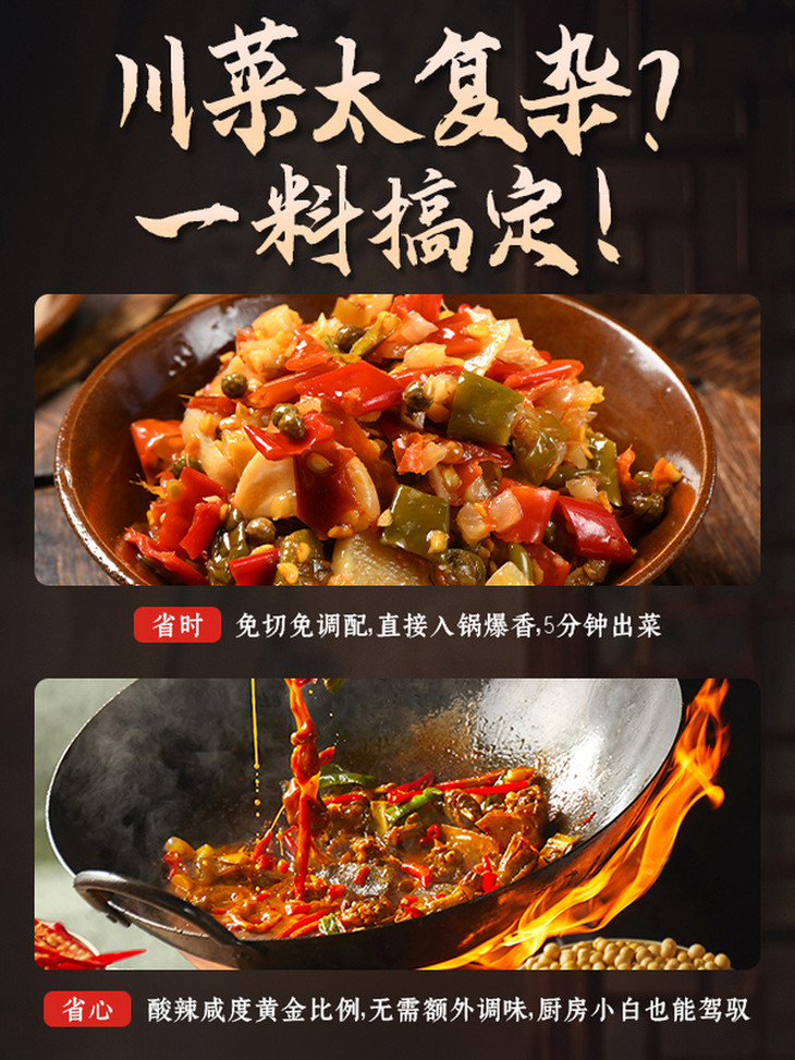 免洗免切设计,简直是为懒人量身打造 方便快捷!打开袋子直接用 江湖菜皆可用,加菜即炒 拆开倒出来就开做,省时省心省力❗