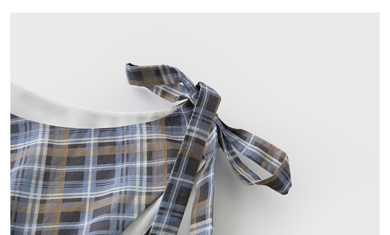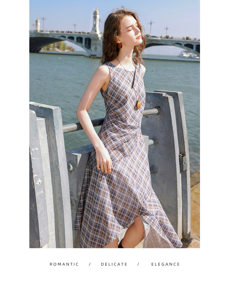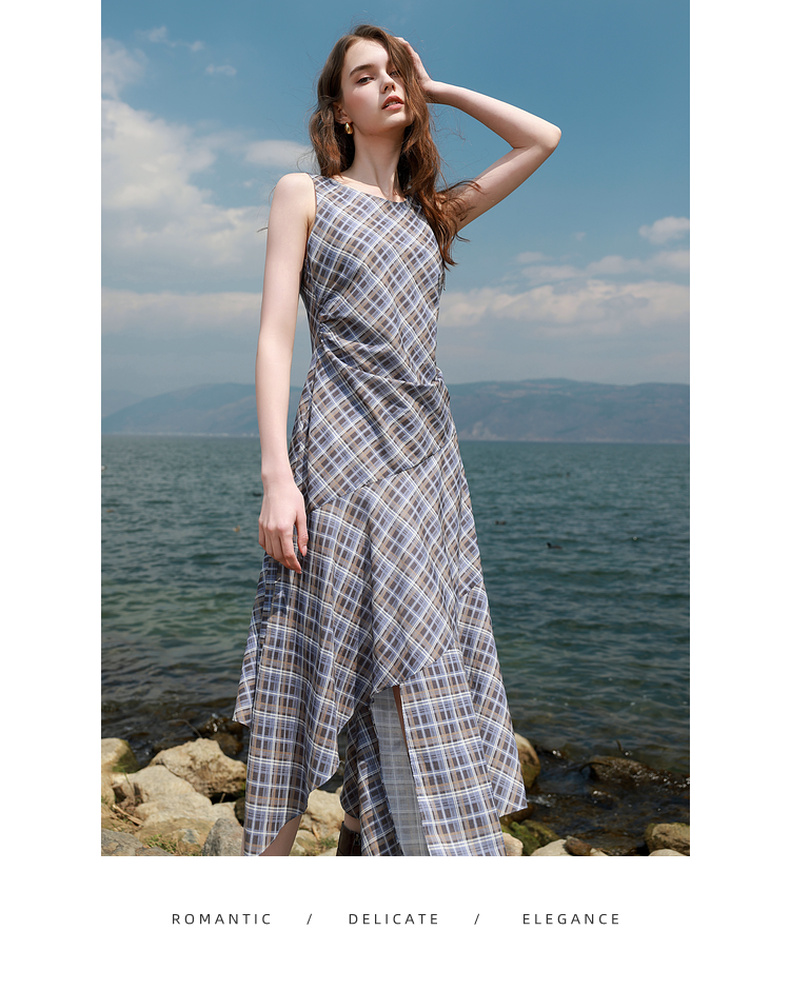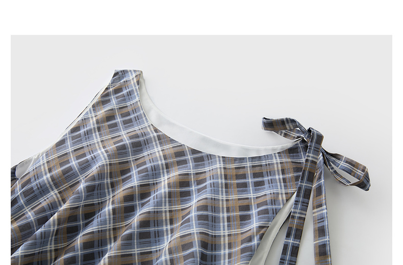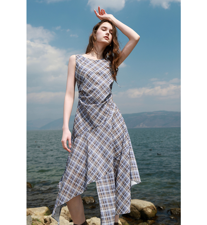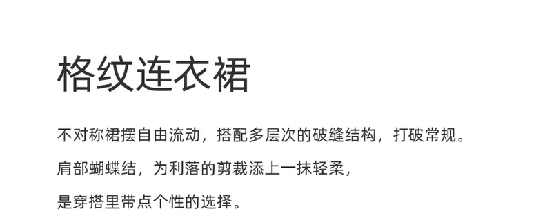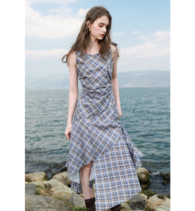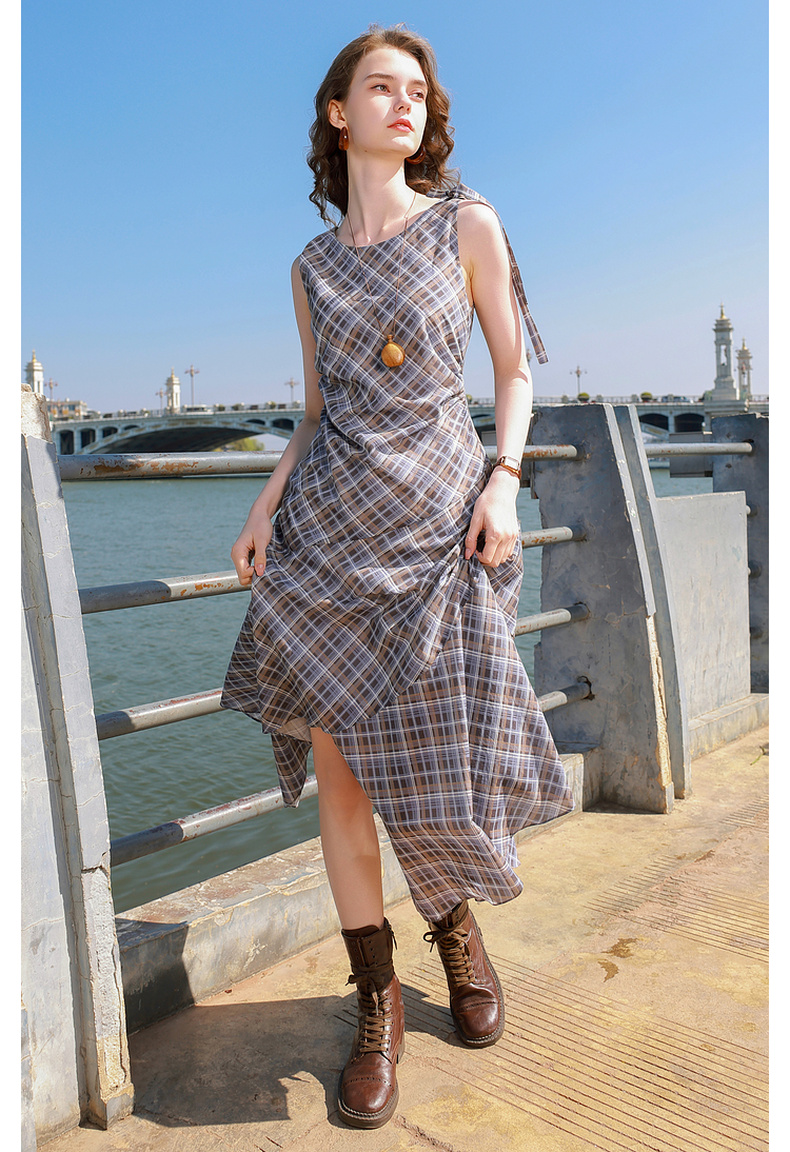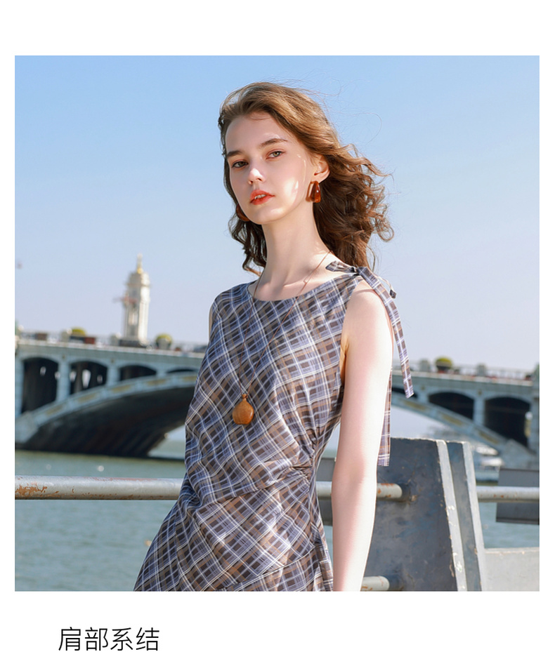 三彩2025夏季新款格纹连衣裙不对称A字裙系带解构长裙复古M