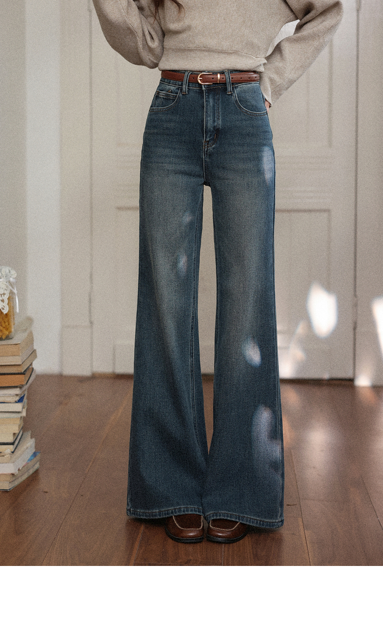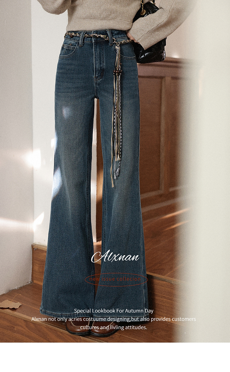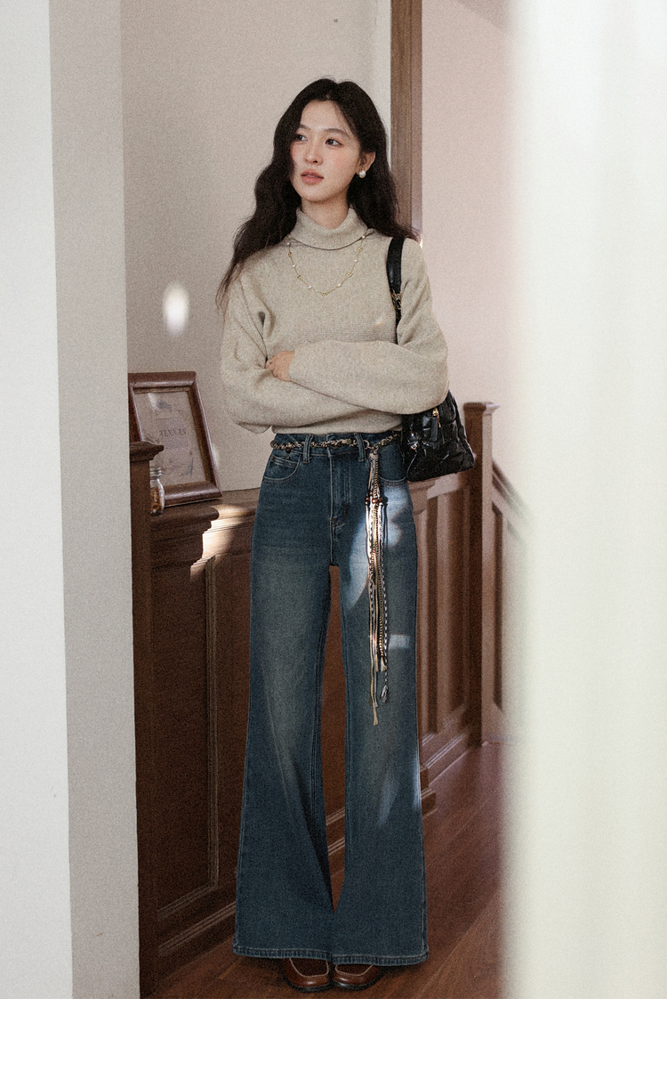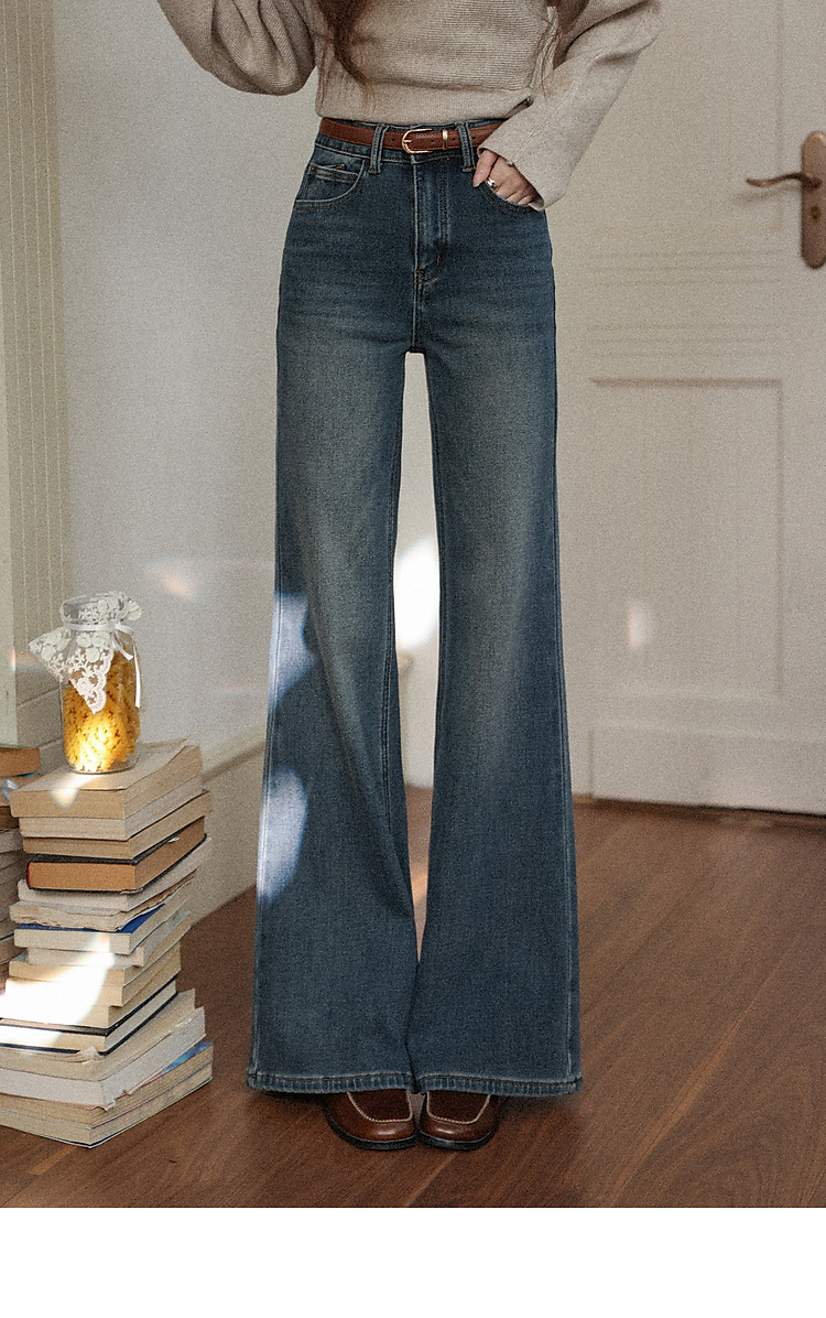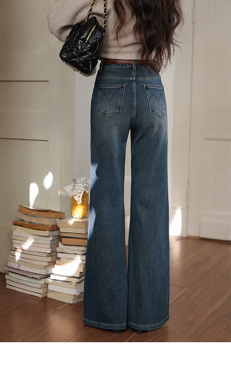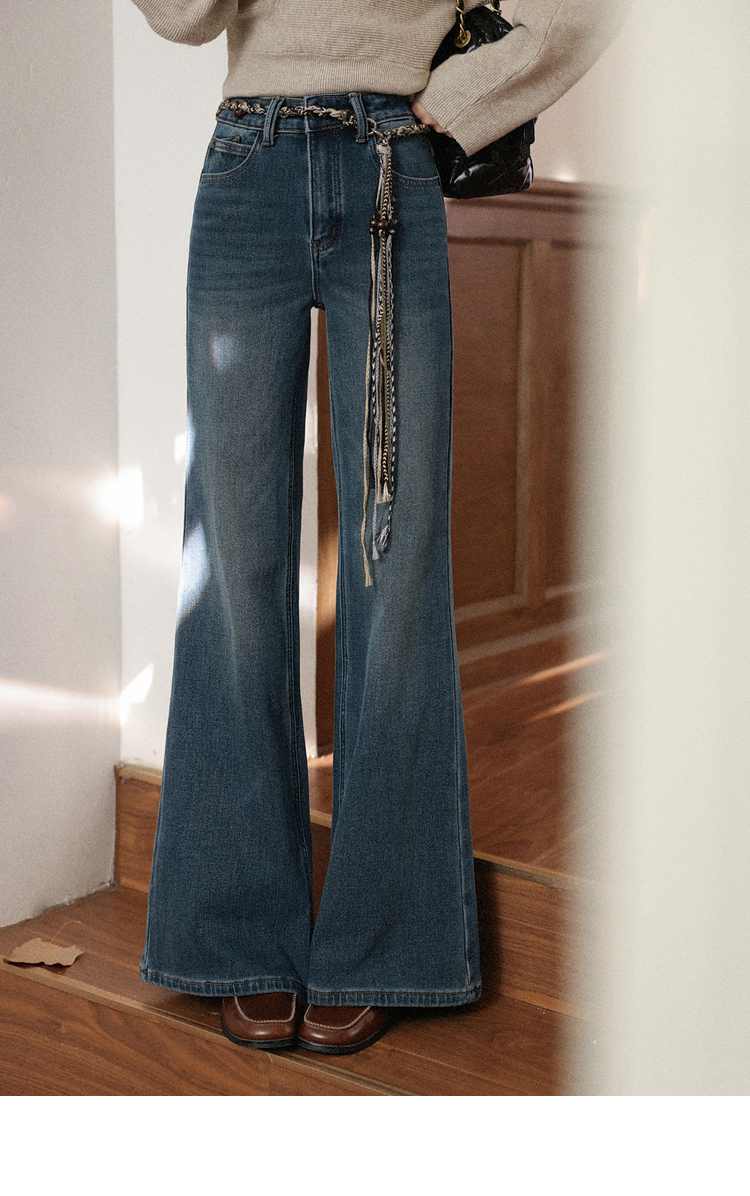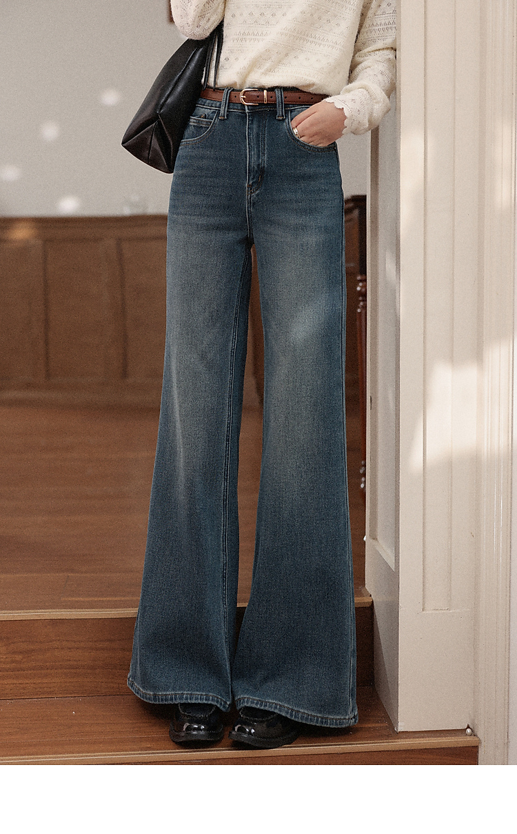 鹿向南「做旧迷情」牛仔蓝微喇直筒修身牛仔裤秋冬季新款女款长裤