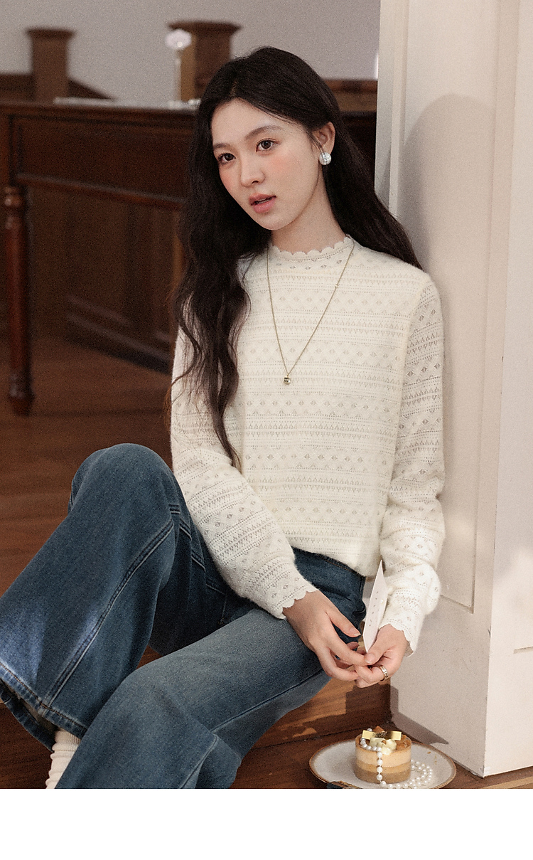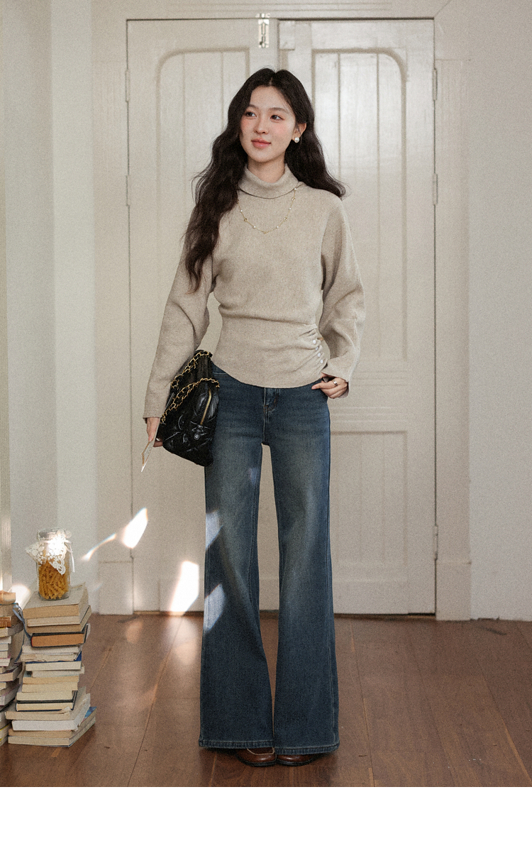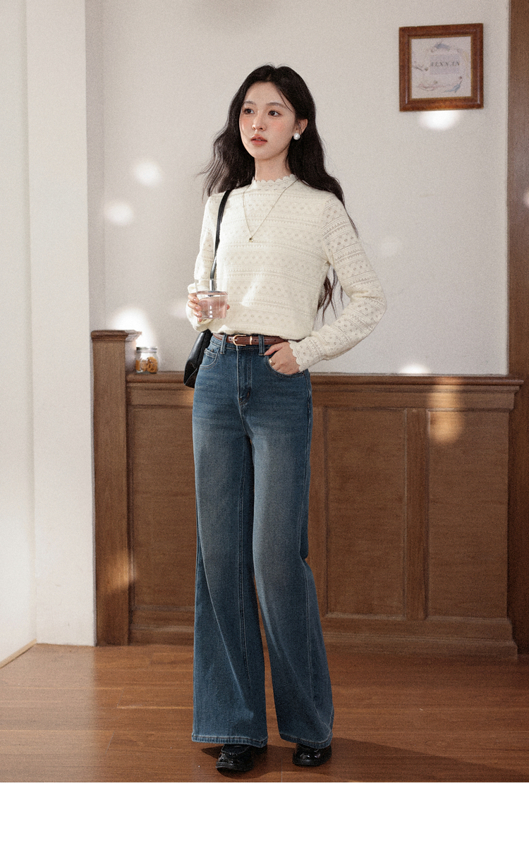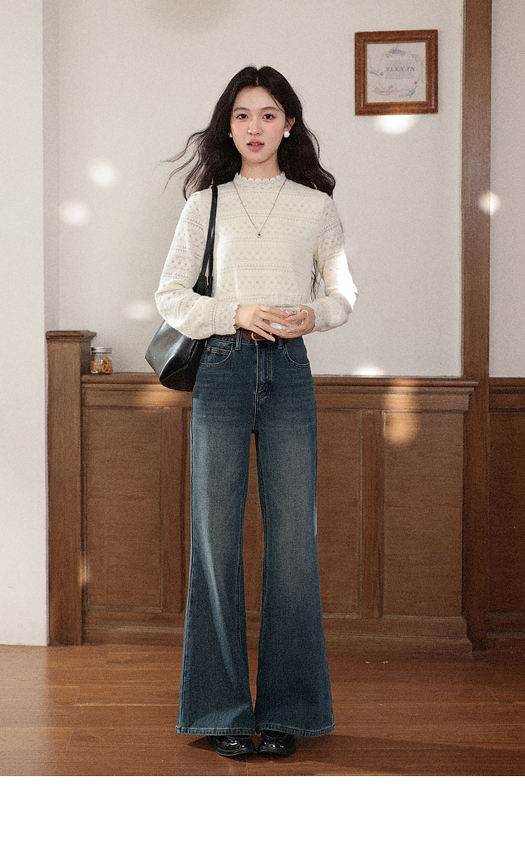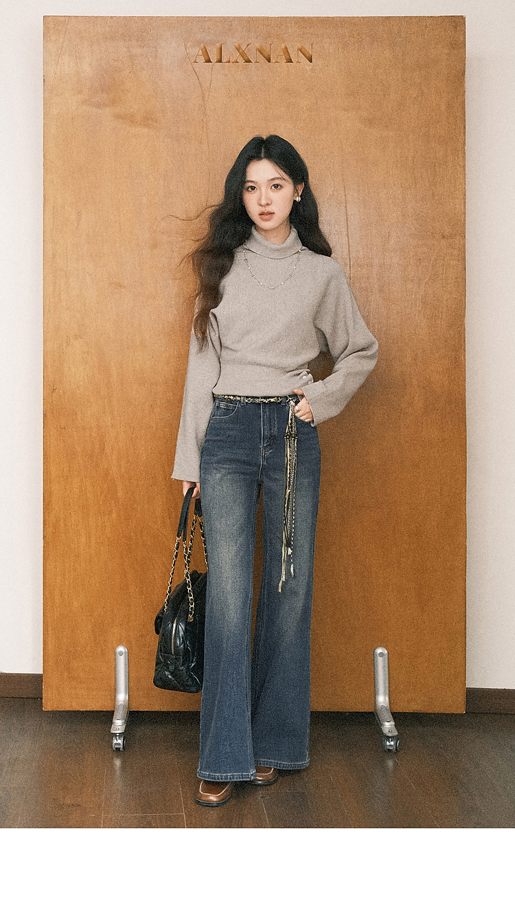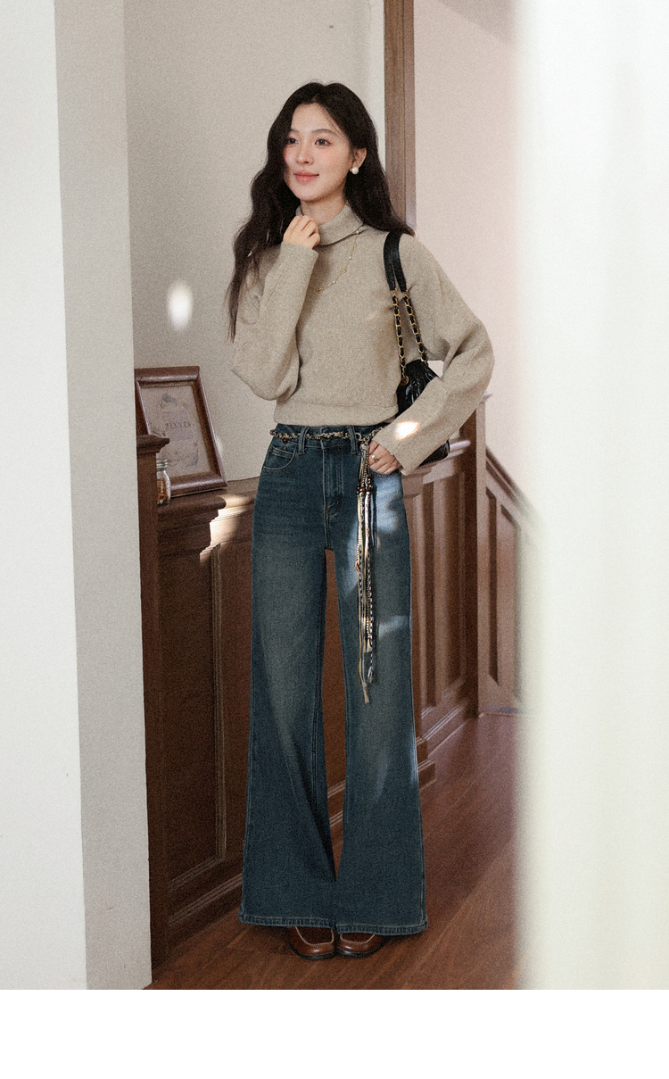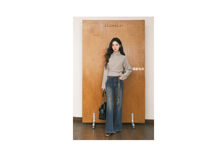 鹿向南「做旧迷情」牛仔蓝微喇直筒修身牛仔裤秋冬季新款女款长裤