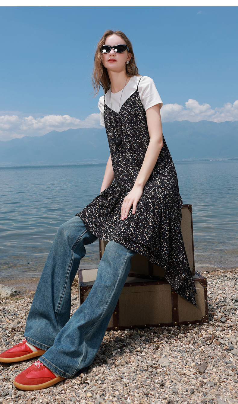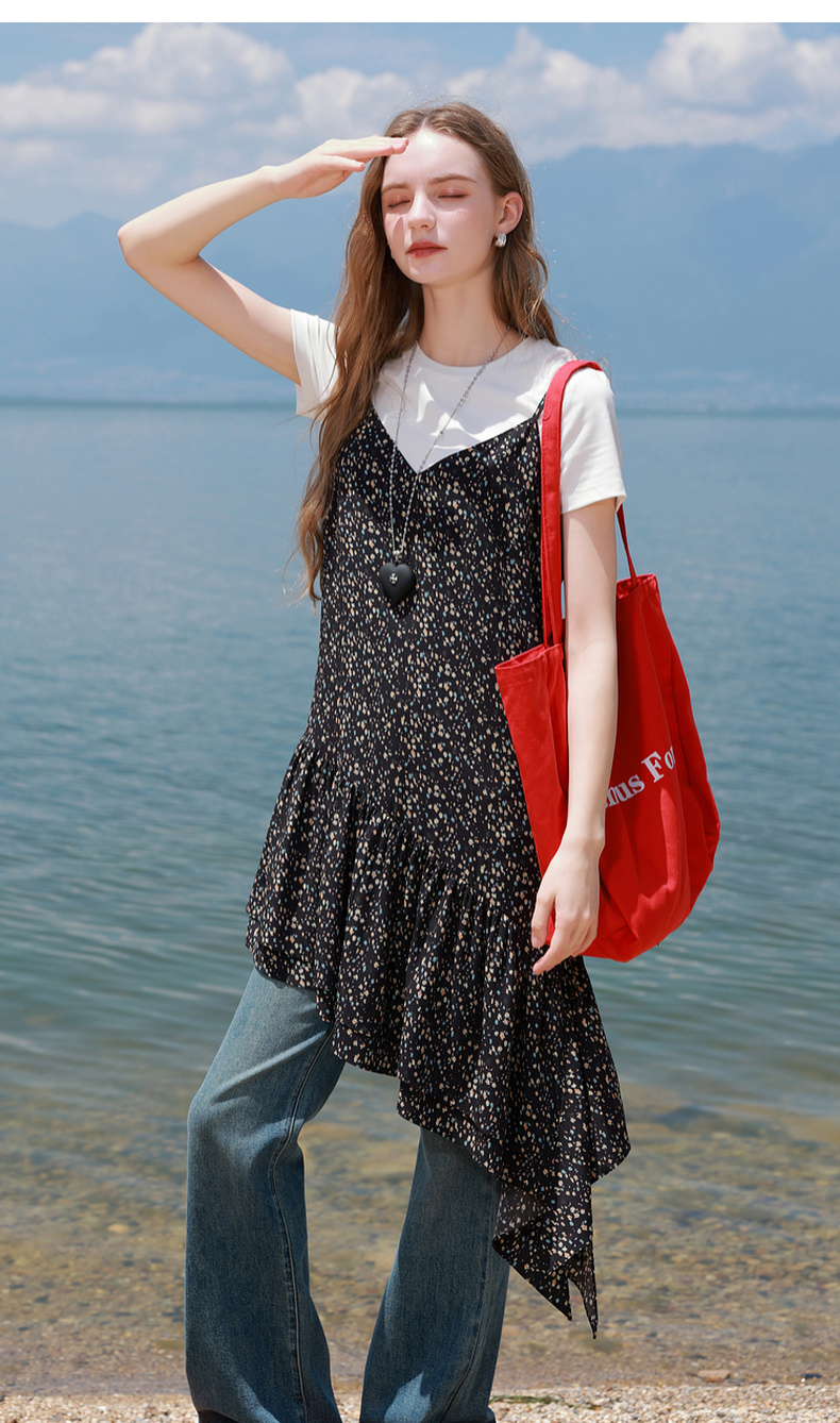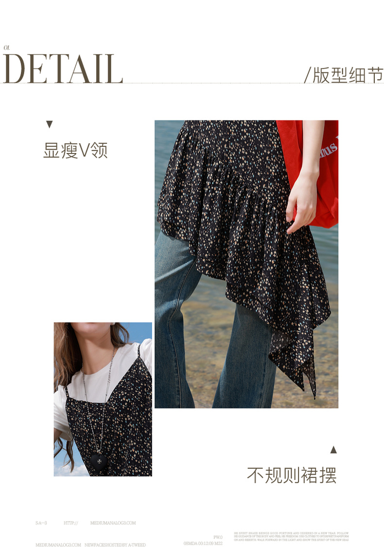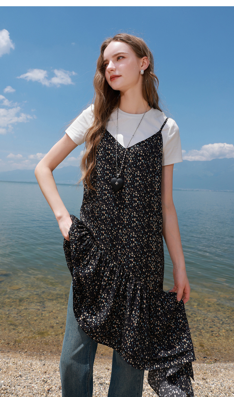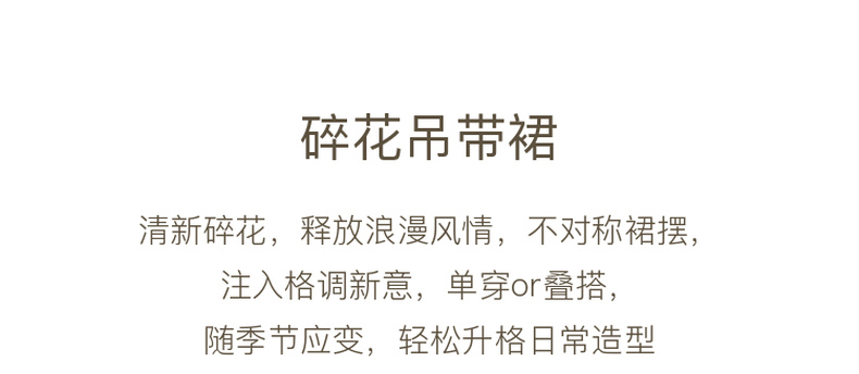 三彩2025秋季新款碎花吊带裙不对称连衣裙叠穿短裙M