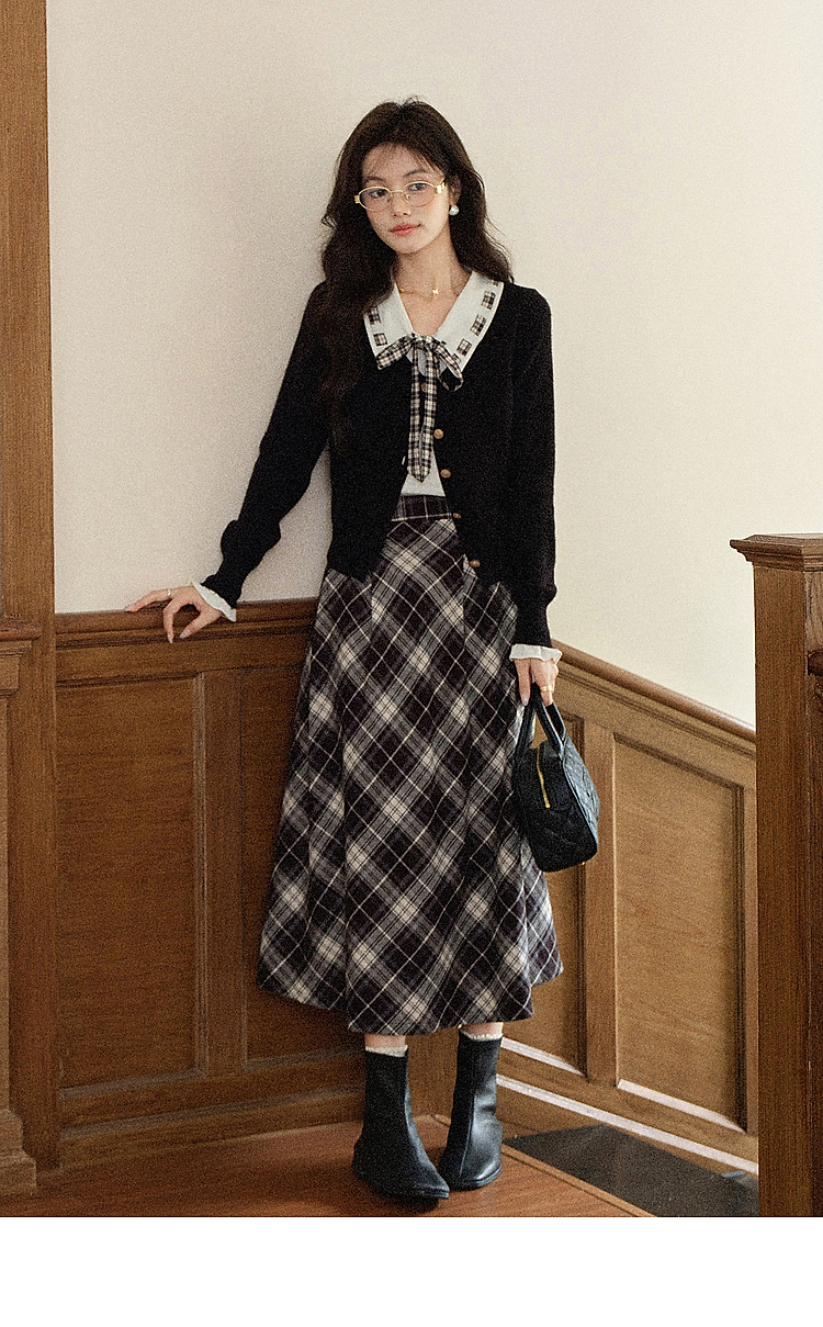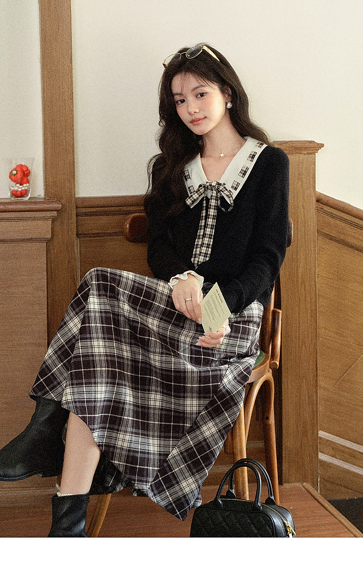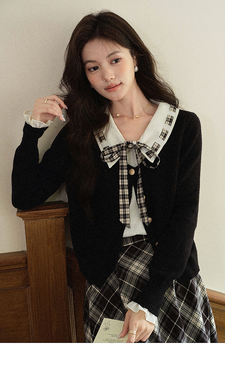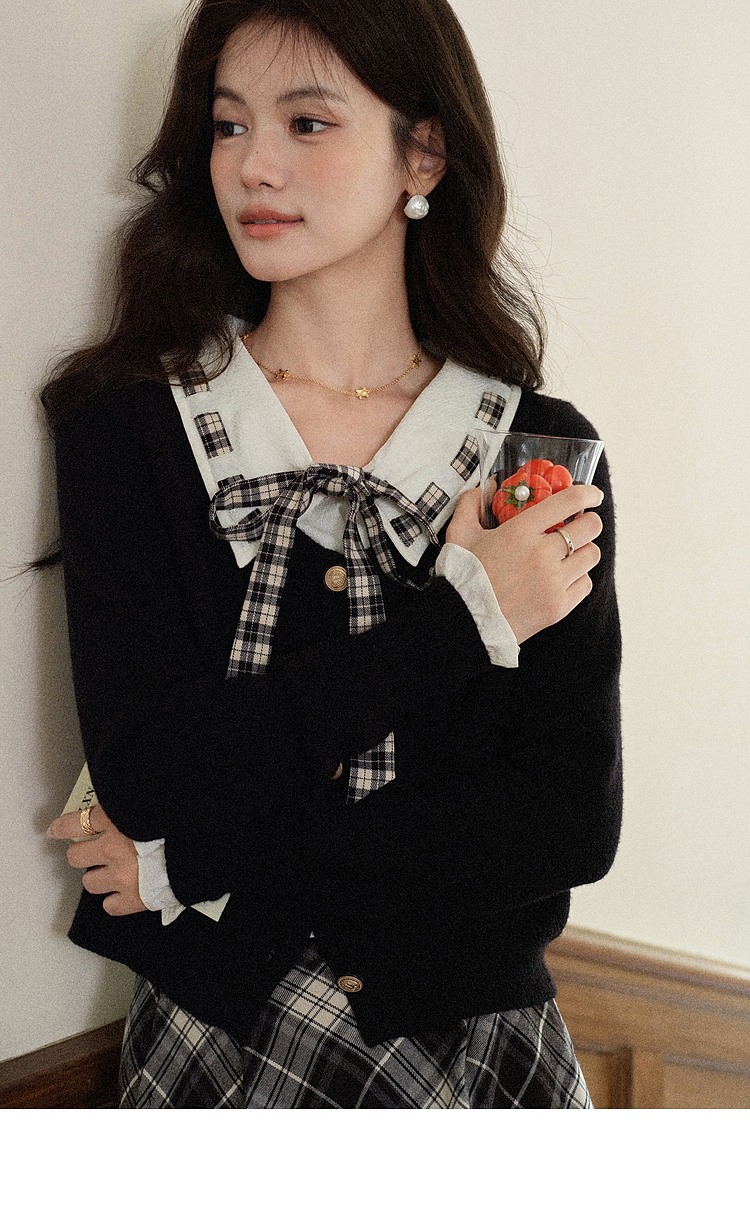 【65折秒杀】鹿向南「复古格律」韩系学院风气质2025秋格纹拼接领结毛衣上衣女DYL662081