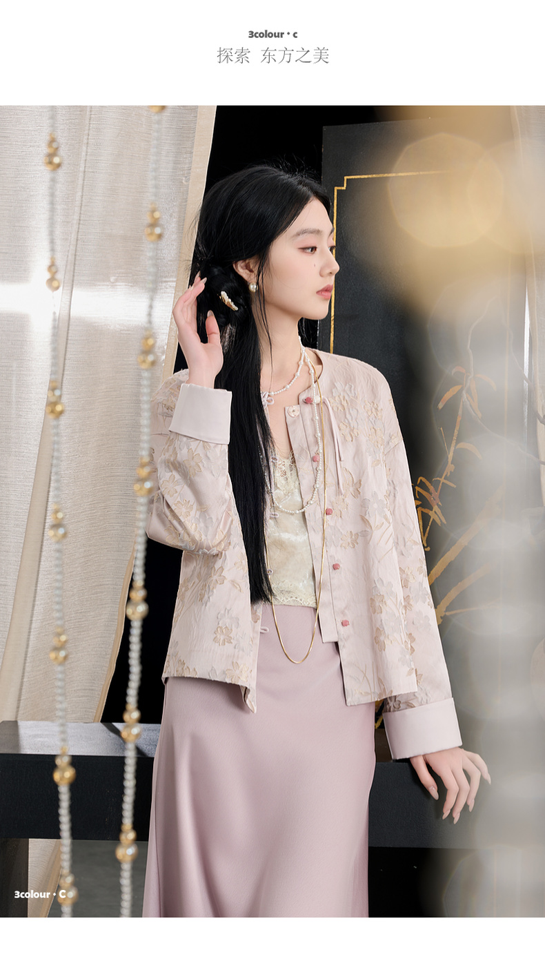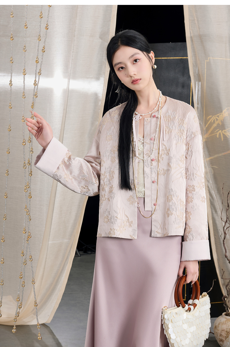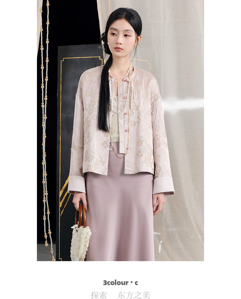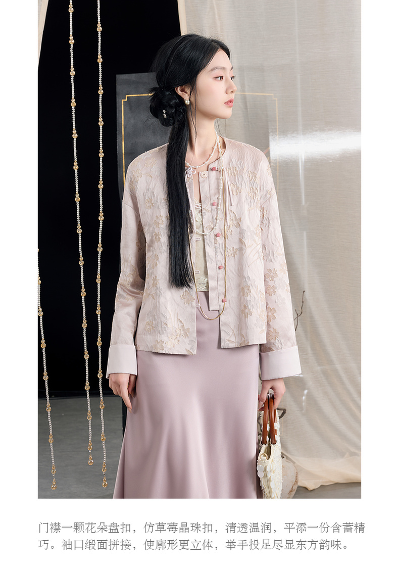 三彩【轻烟粉黛】2025秋季新款提花外套圆领盘扣开衫宽松中式C