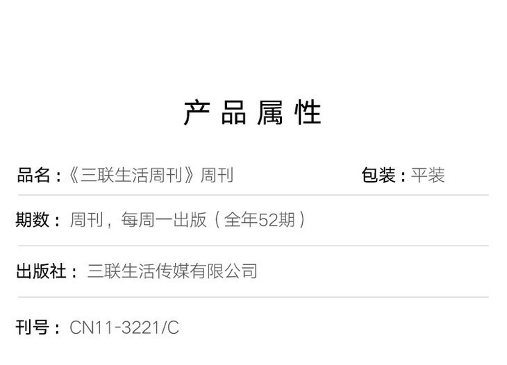 忙碌疲惫的生活也让我们沉迷片刻的欢愉,而很少思考——我该怎么过好这一生?如果你也想从大浪潮中淘得优质内容,获得深入思考,那我建议你可以读一读《三联生活周刊》。创刊近百年来,总印量令人震撼,即便是纸媒衰微的今日,《三联生活周刊》的订阅率仍旧每年以高速率增长。* 在“2018数字阅读影响力期刊前100”榜单上,三联排到第*位;* “2018Flipboard红板报品质之选”,三联入选读者至爱前10;和市面上一月一刊的杂志不同,《三联生活周刊》每周一刊,与时俱进,与你共同思考当下。难怪作家苏童感叹道:看完它,有一种脑后大补的感觉。好杂志的内容是永不过时的。白岩松曾说过,即便隔了很长时间,三联依然可以摆在我们的书架里面。随时拿起阅读,随时获得关于“真相、知识、成长、生活”的新感悟。