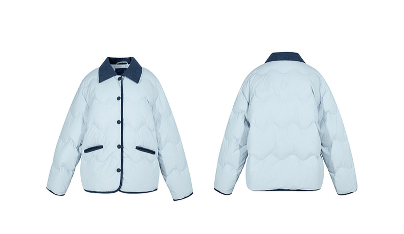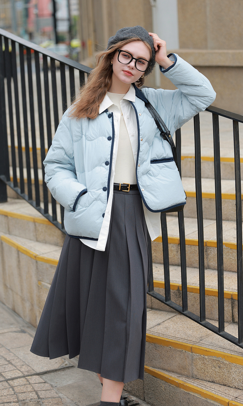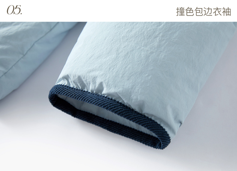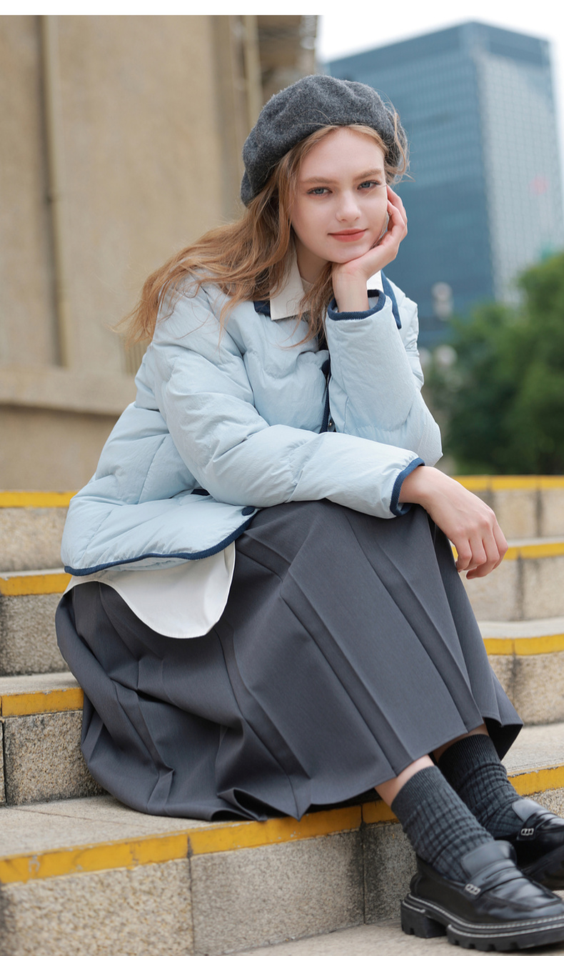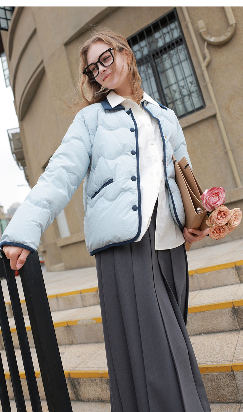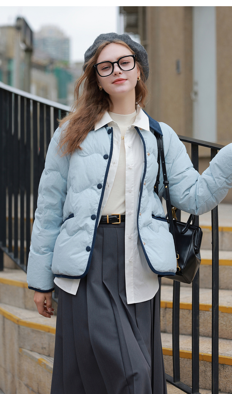 三彩2025冬季新款轻薄衬衫式鹅绒服翻领宽松短款羽绒服撞色拼接