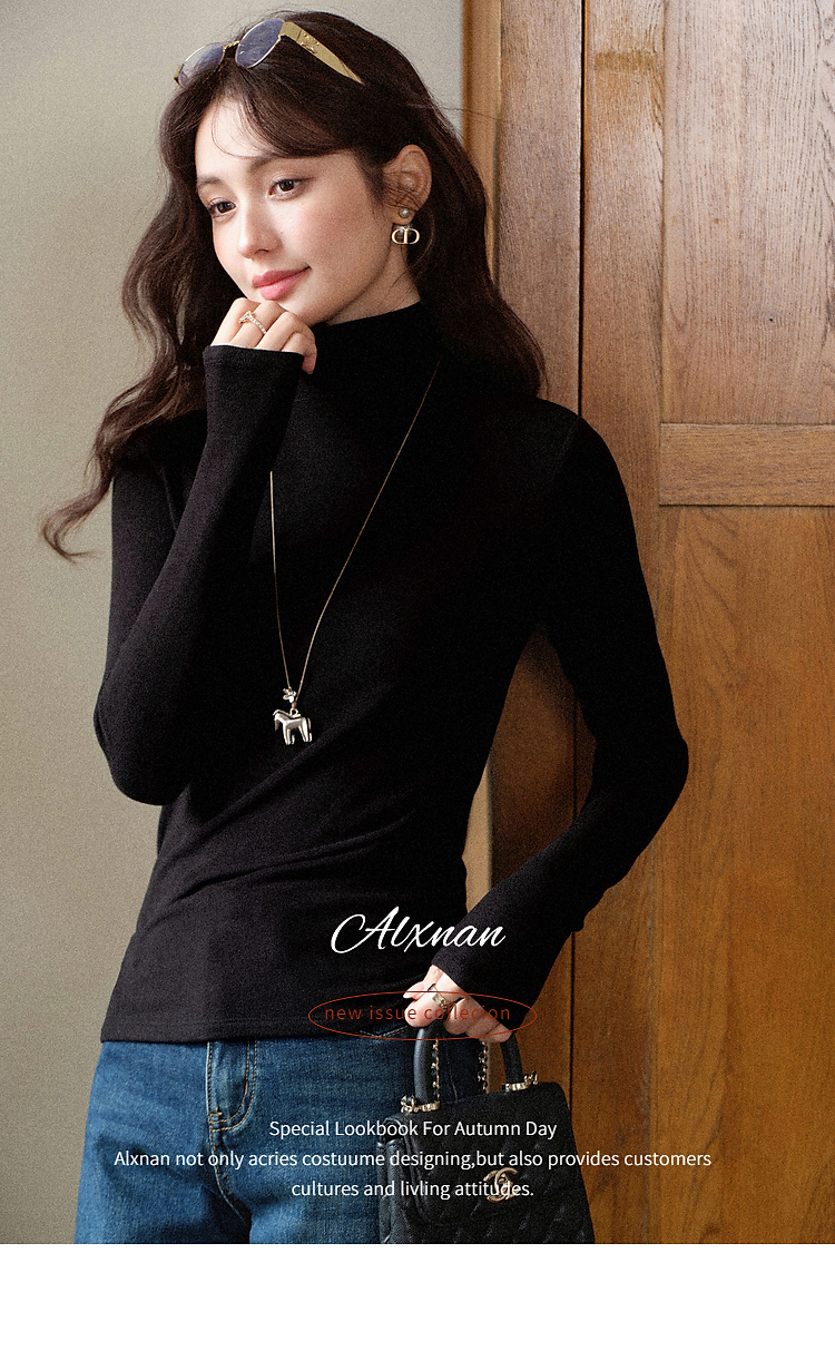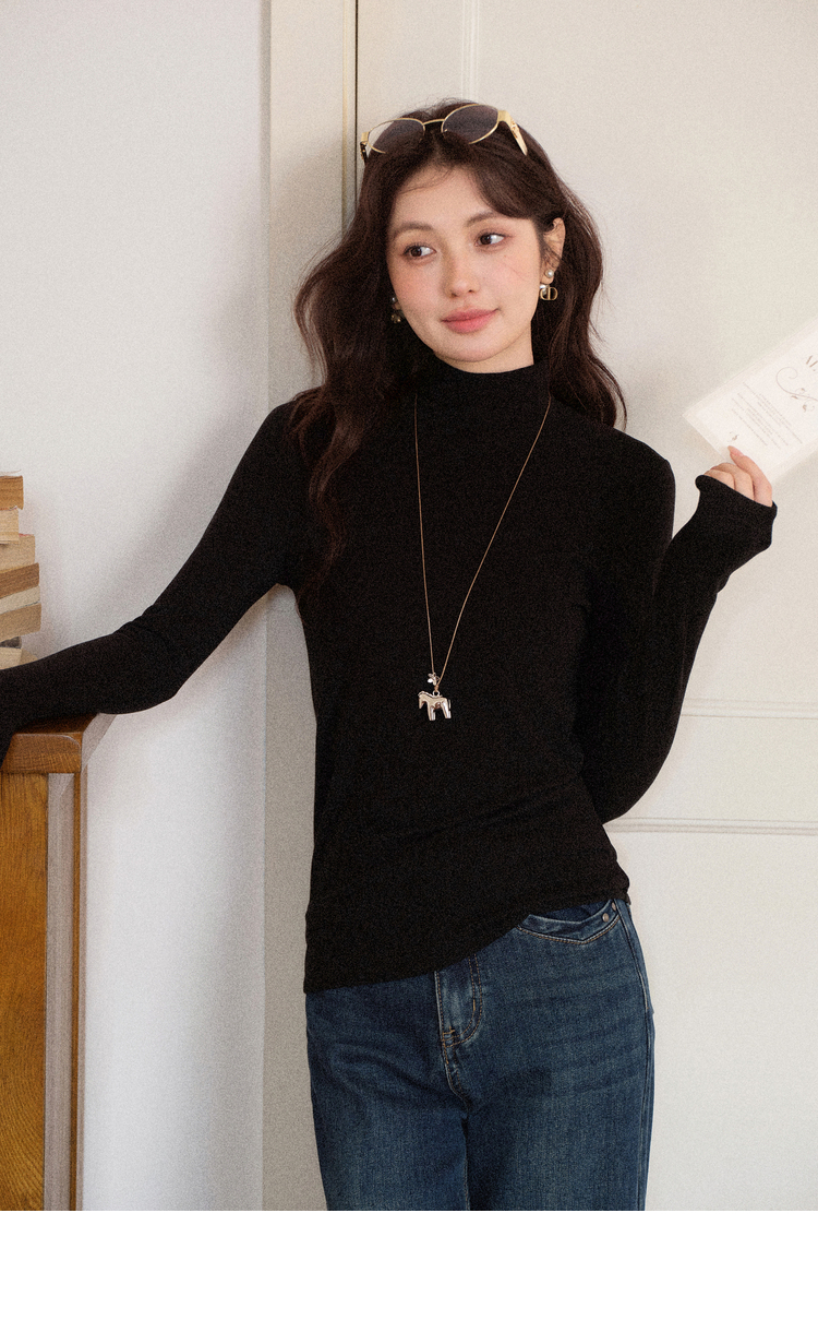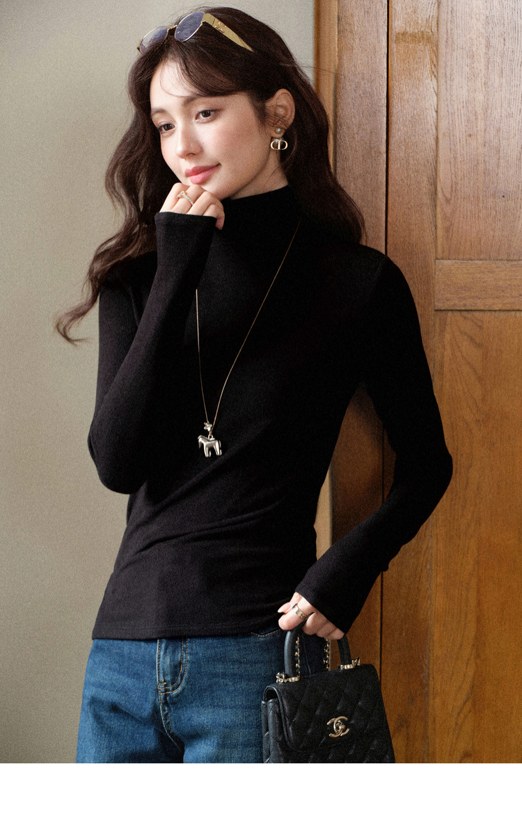 鹿向南「京都墨章」黑色打底衫长袖T恤女秋新款纯色简约修身上衣