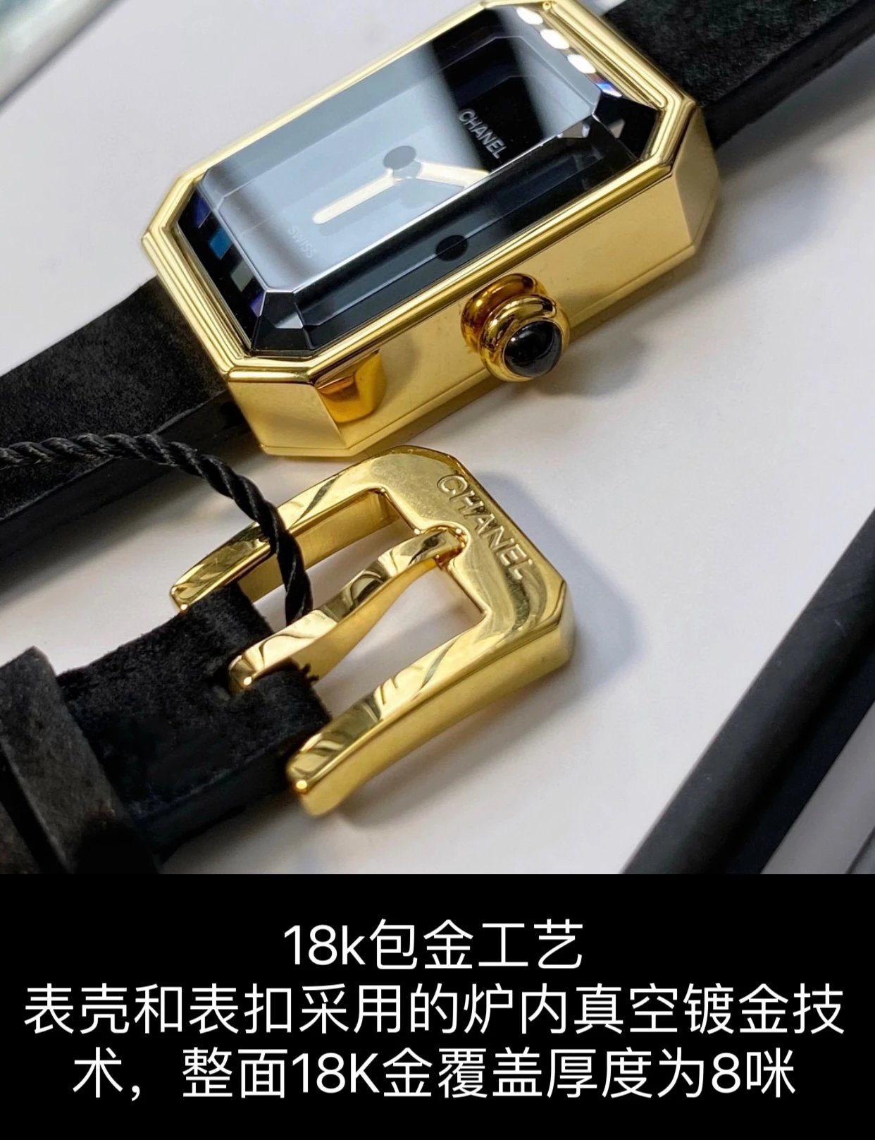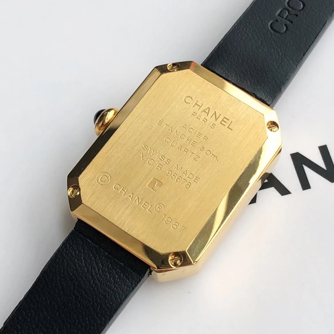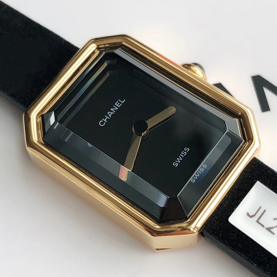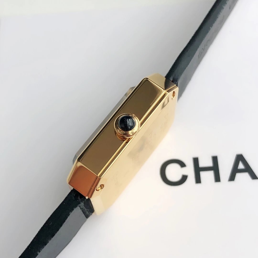 真正18k包金工艺,配备国检证书,一表一码,支持复检!表壳和表扣采用的炉内真空镀金技术,整面18K金覆盖厚度为8咪,腕表尺寸19.7✖️15.2mm.搭载进口原装石英机芯,方形多边形大切边蓝宝石玻璃镜面,钻石切割工艺,始终保持无痕清透,搭配丝绒质感橡胶表带,上手柔软舒适,质感上佳。这款腕表是coco邀请好莱坞女星GretaGarbo设计,作为香奈儿的第一款腕表,非常具有premiere(首次露面)的意义,表壳配八角形蓝宝石玻璃的灵感来源于N°5香水的瓶盖以及coco家附近的巴黎芳登广场,因为这个外形很像方糖也被大家称之为方糖腕表。就是一款你穿什么衣服戴它都立刻提高时尚度的腕表。中古表里的万人迷复古优雅,表盘上没有秒针没有数字也没有时标让你随心感觉时间,与众不同为各种造型平添前卫时尚感。