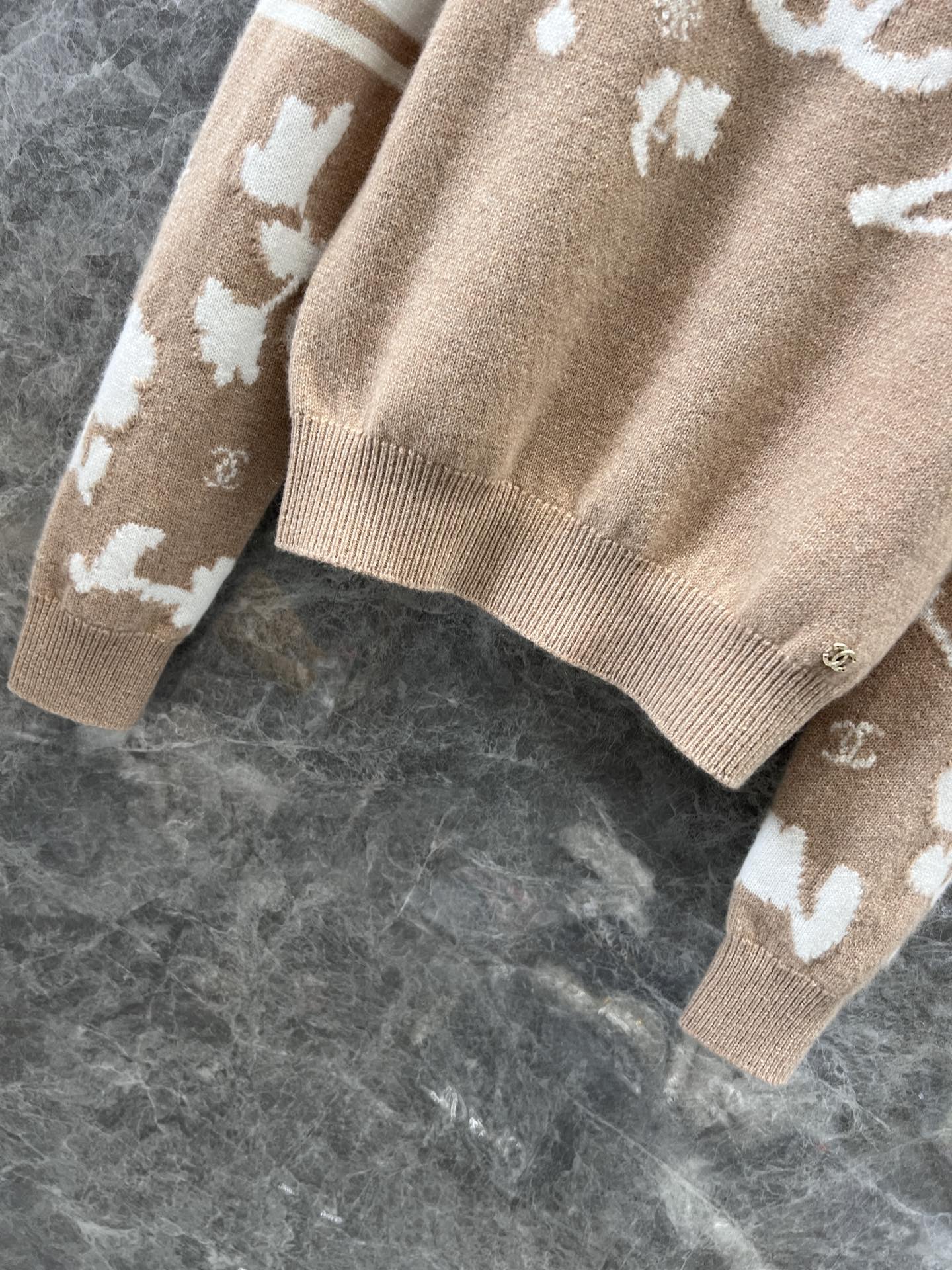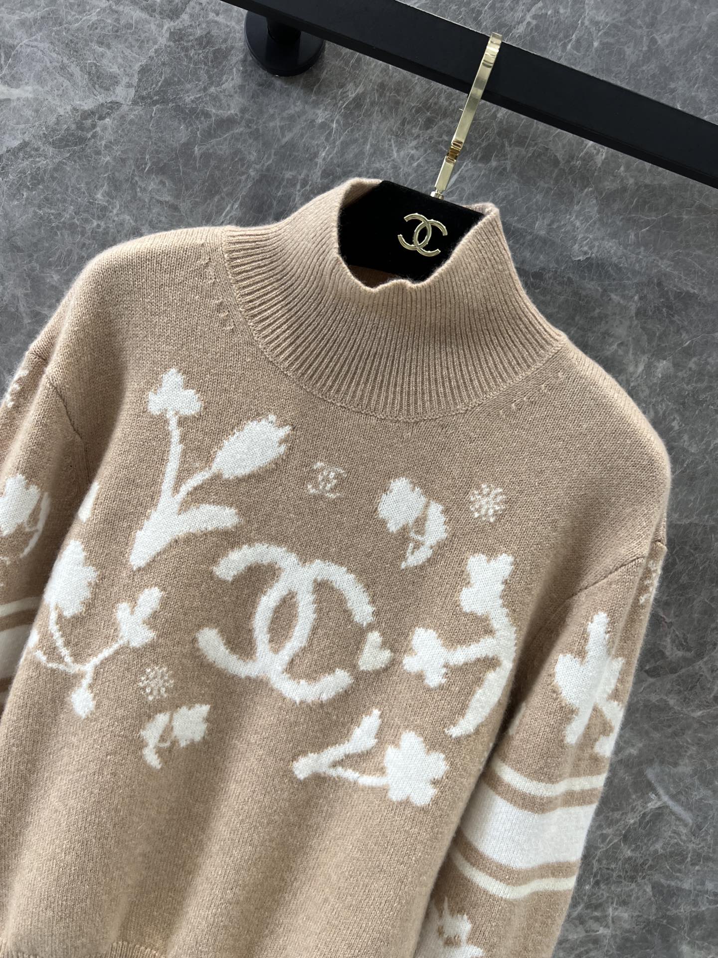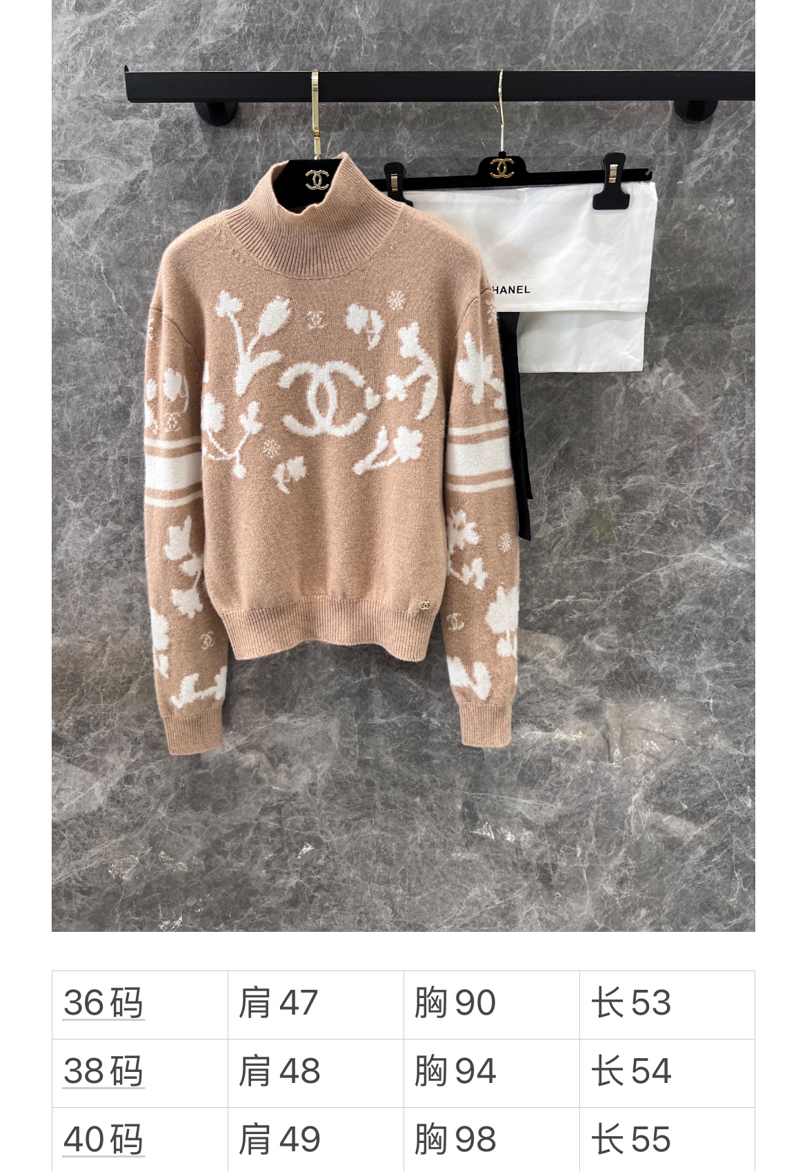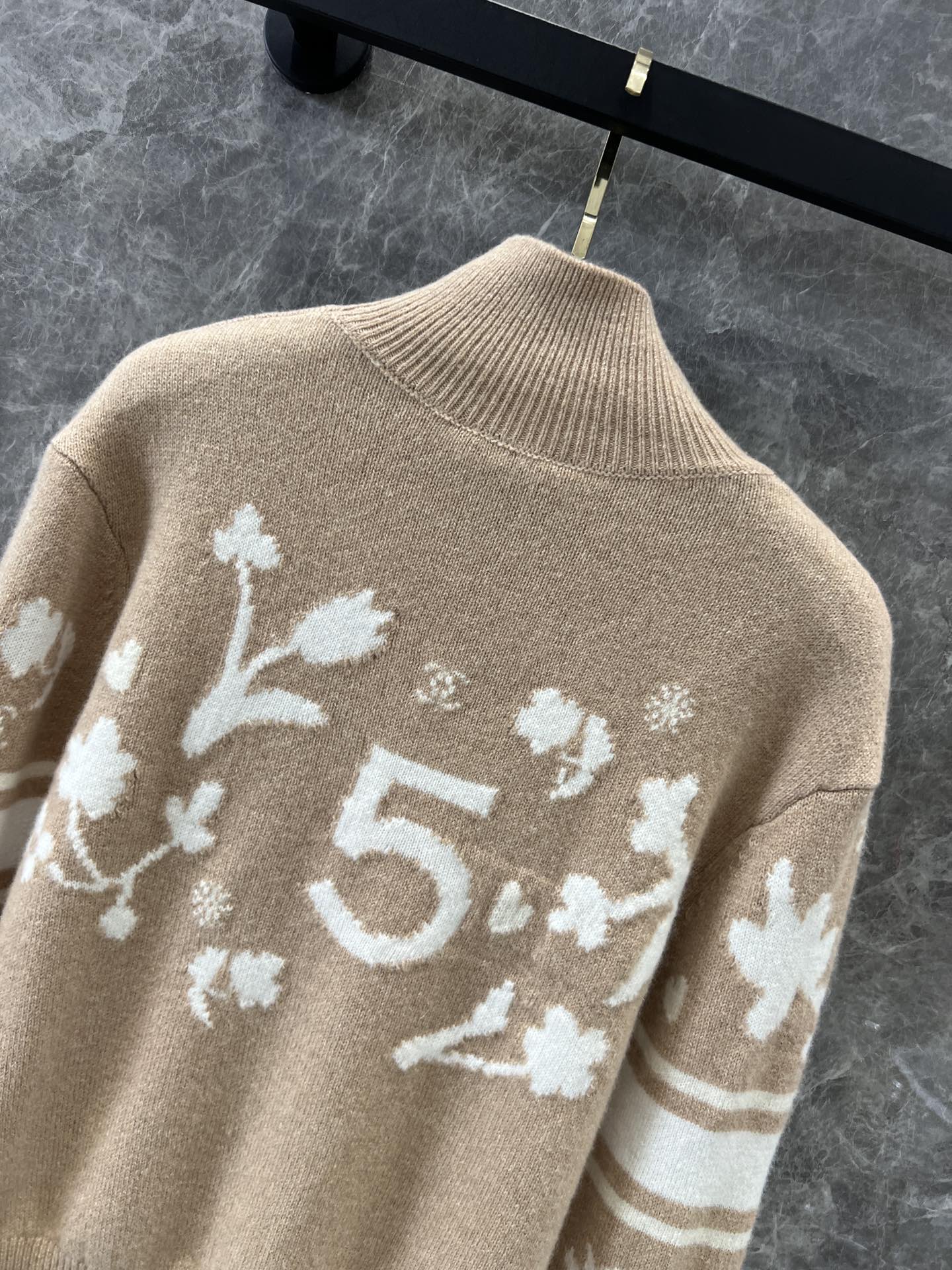 定制YB进口羊毛材质 质感舒适柔软 精致撞色提花 肌理纹路呈现 成衣气质高雅 下角双C小配件 整体优雅有小细节 常规高领毛衣剪裁