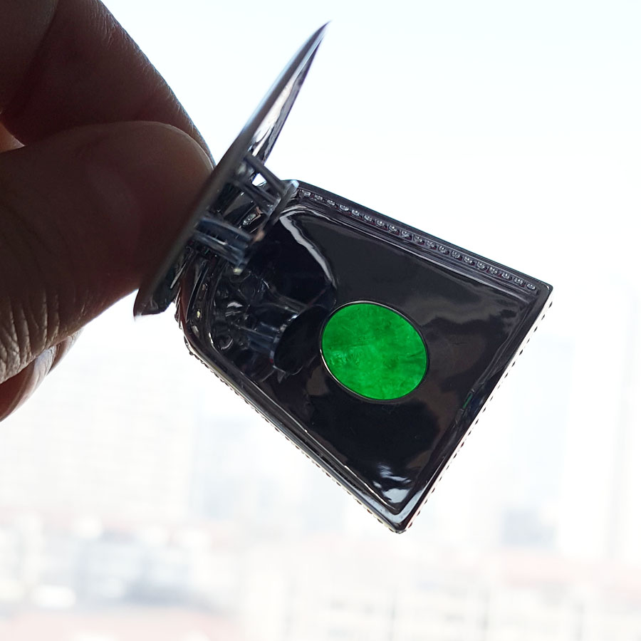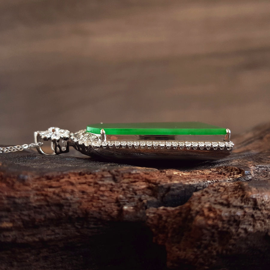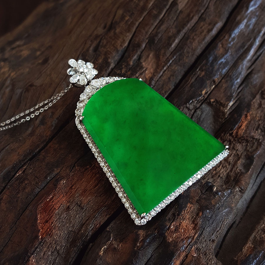 名称 | AU750收藏级白金镶钻镶天然细腻糯种满绿平安无事牌翡翠吊坠项链 |