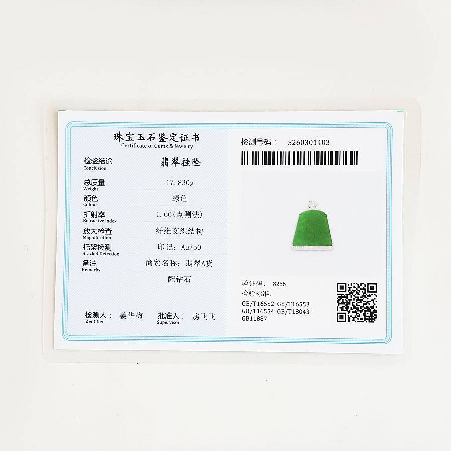 【天然正品】A货翡翠AU750收藏级白金镶钻镶天然细腻糯种满绿平安无事牌翡翠吊坠项链47.1*31.9*8.5MM(皆取最大值)230326NJS35