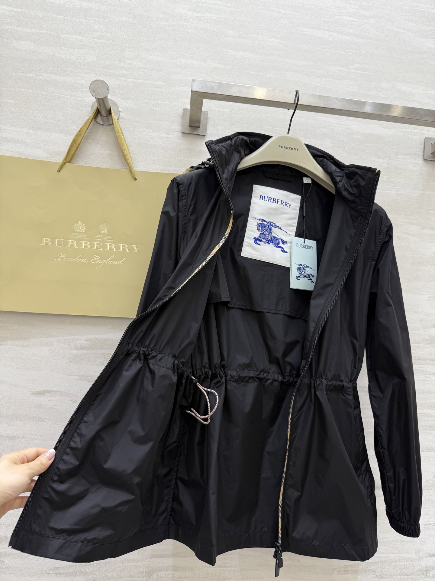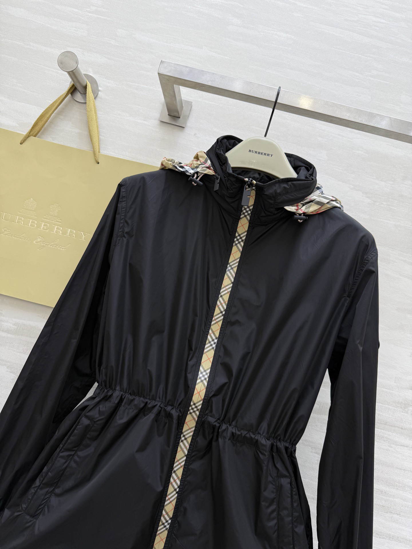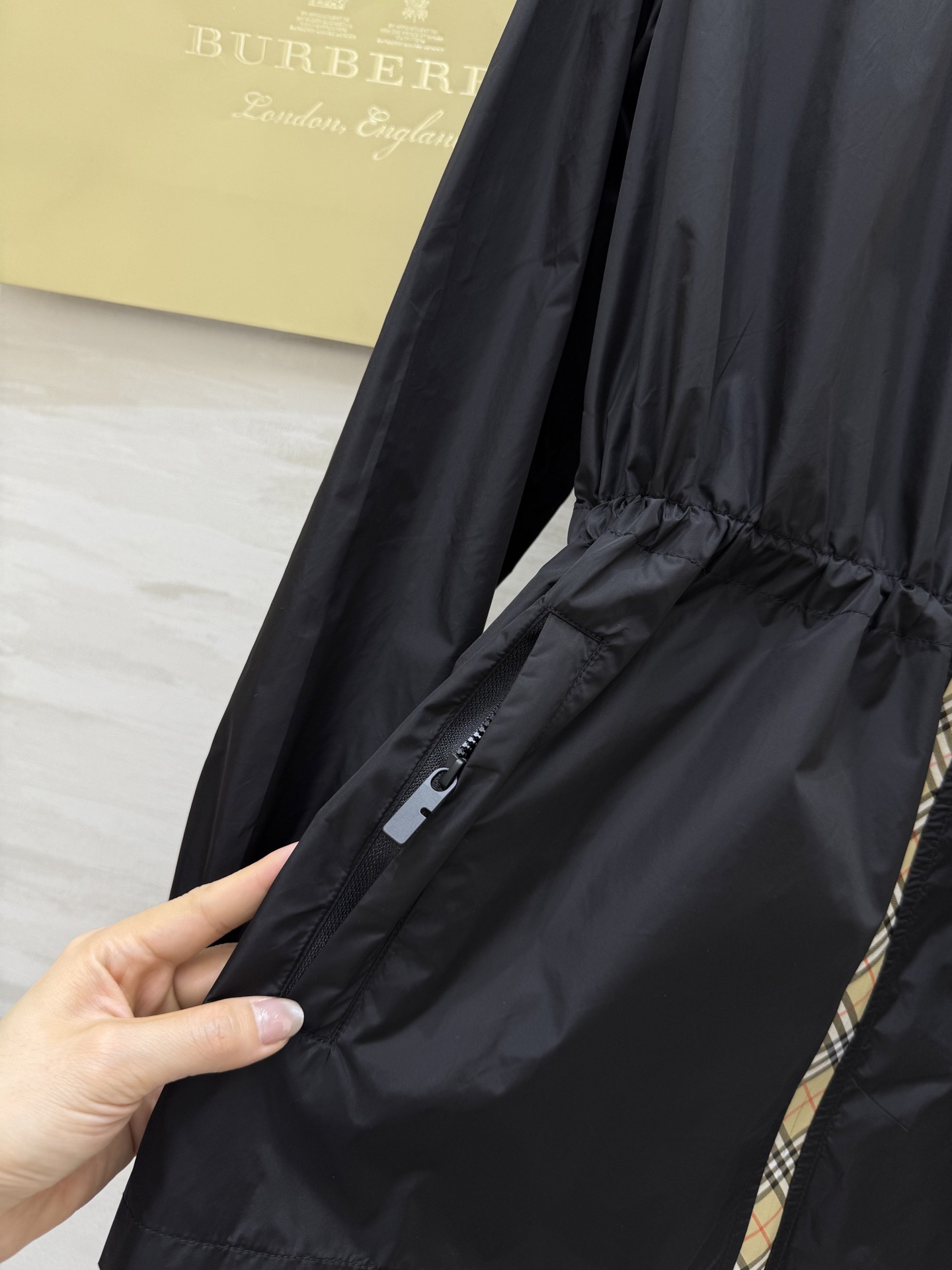 #市面最高版本 、不接急单。 BURBERR♡新款 轻薄抽绳中长款外套 格纹细节控看这里!轻薄外套巧搭经典格纹饰边 独特设计瞬间点亮造型 层次丰富又不失时尚感 黑与米色双色任选 轻松适配多种场合 出街吸睛力MAX~每一件都好爱,快来冲~ 高品质定制 现货首发size:SMLXL(M码肩宽:45,胸围:108,衣长:69)p410