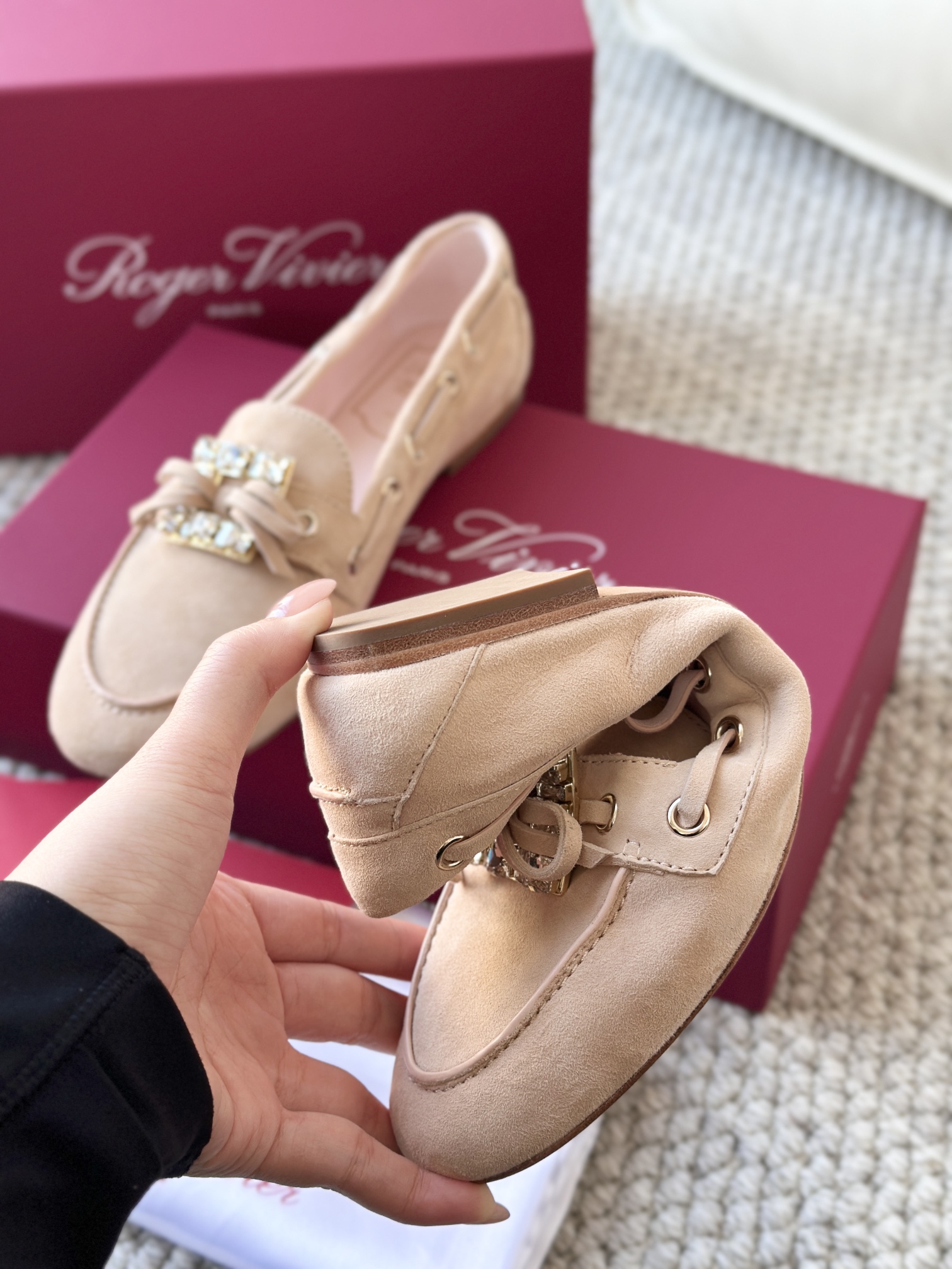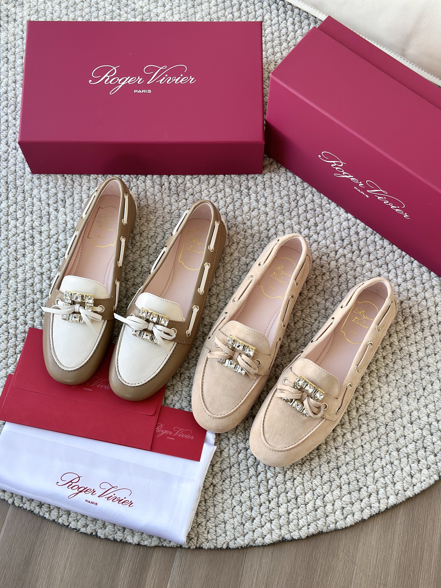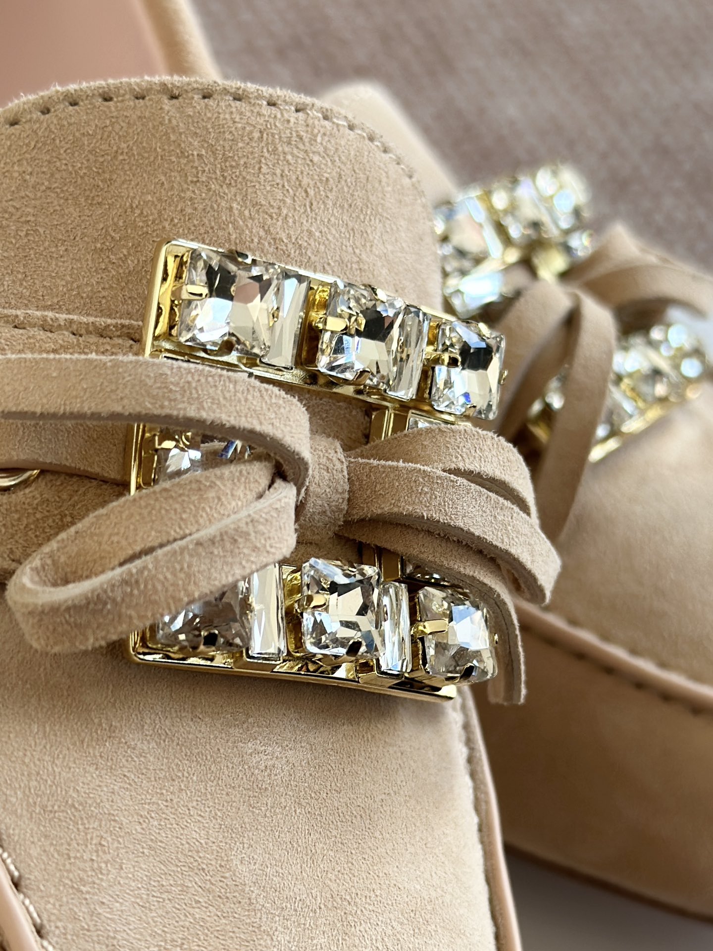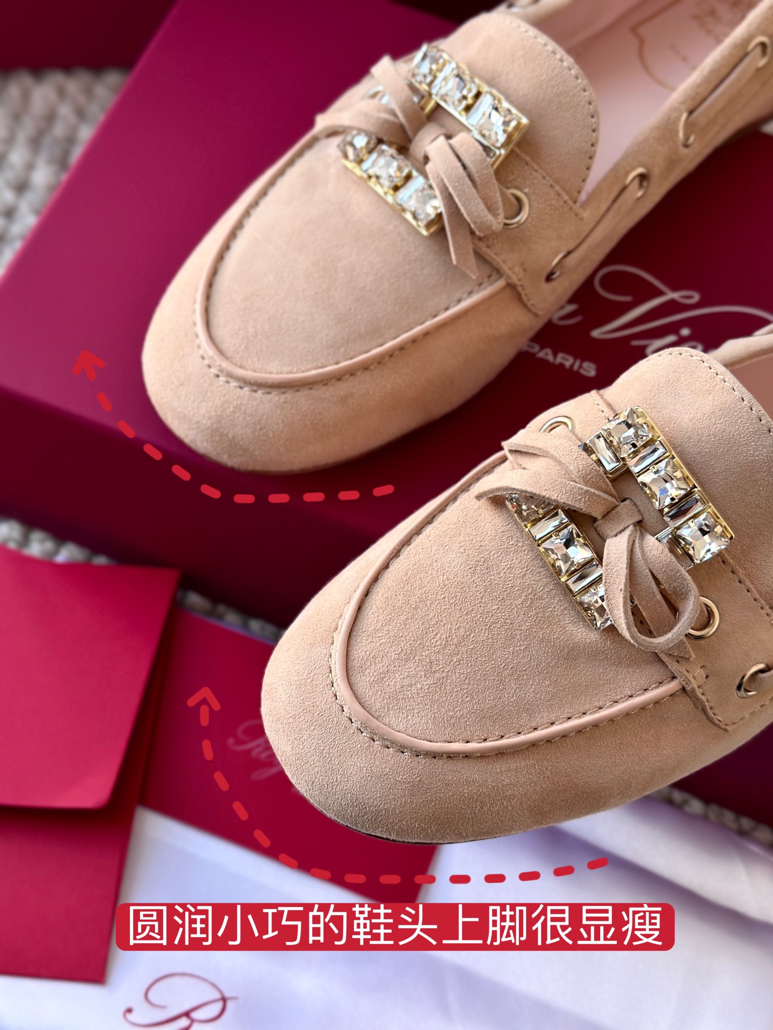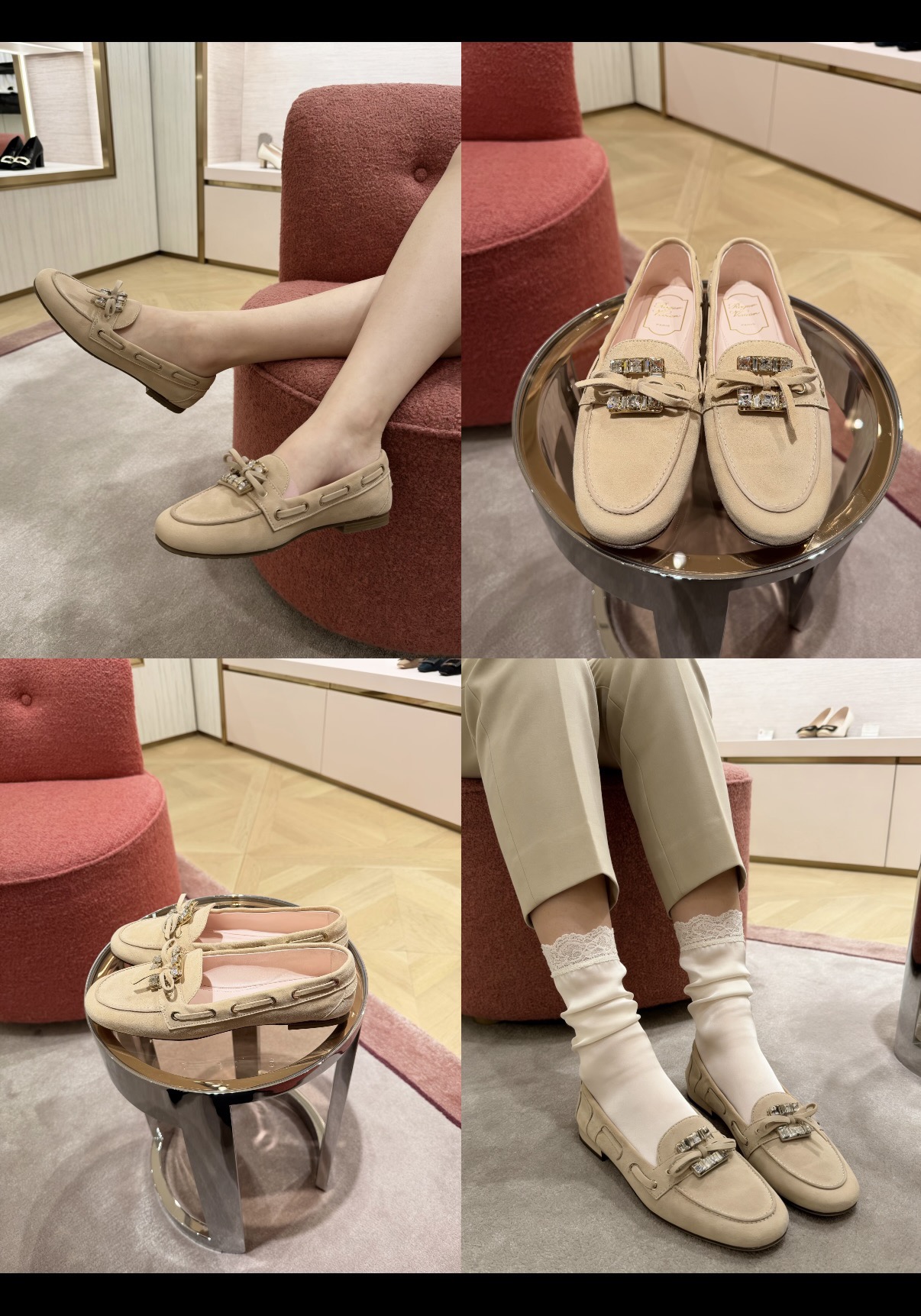 res Vivier 系列重新诠释经典乐福的魅力,手工制作,点缀mini水晶饰扣,闪耀动人搭配编制蝴蝶结,灵动可爱又不失优雅的气质
