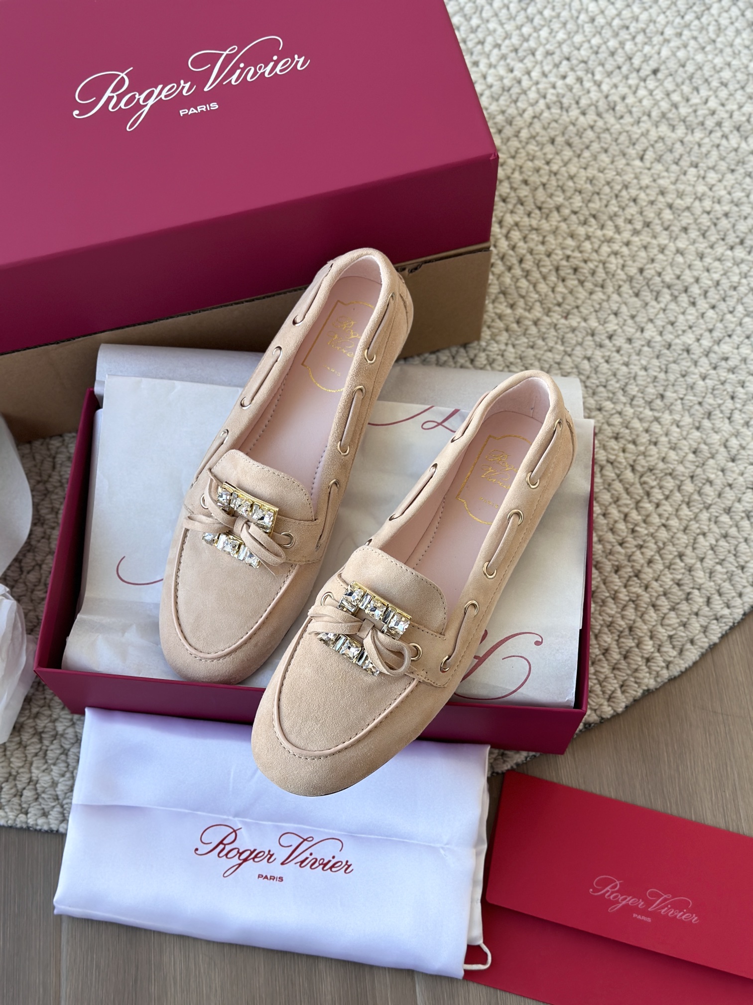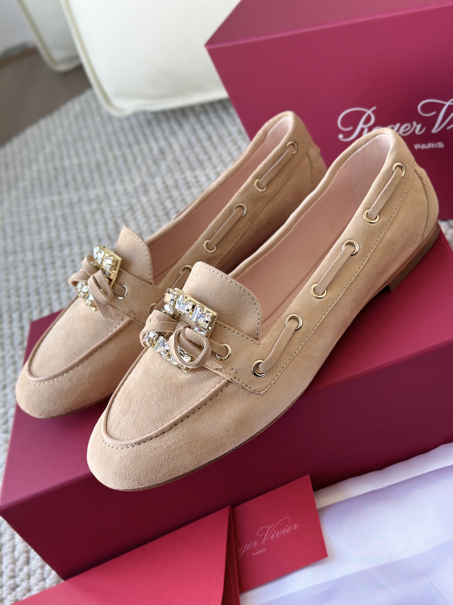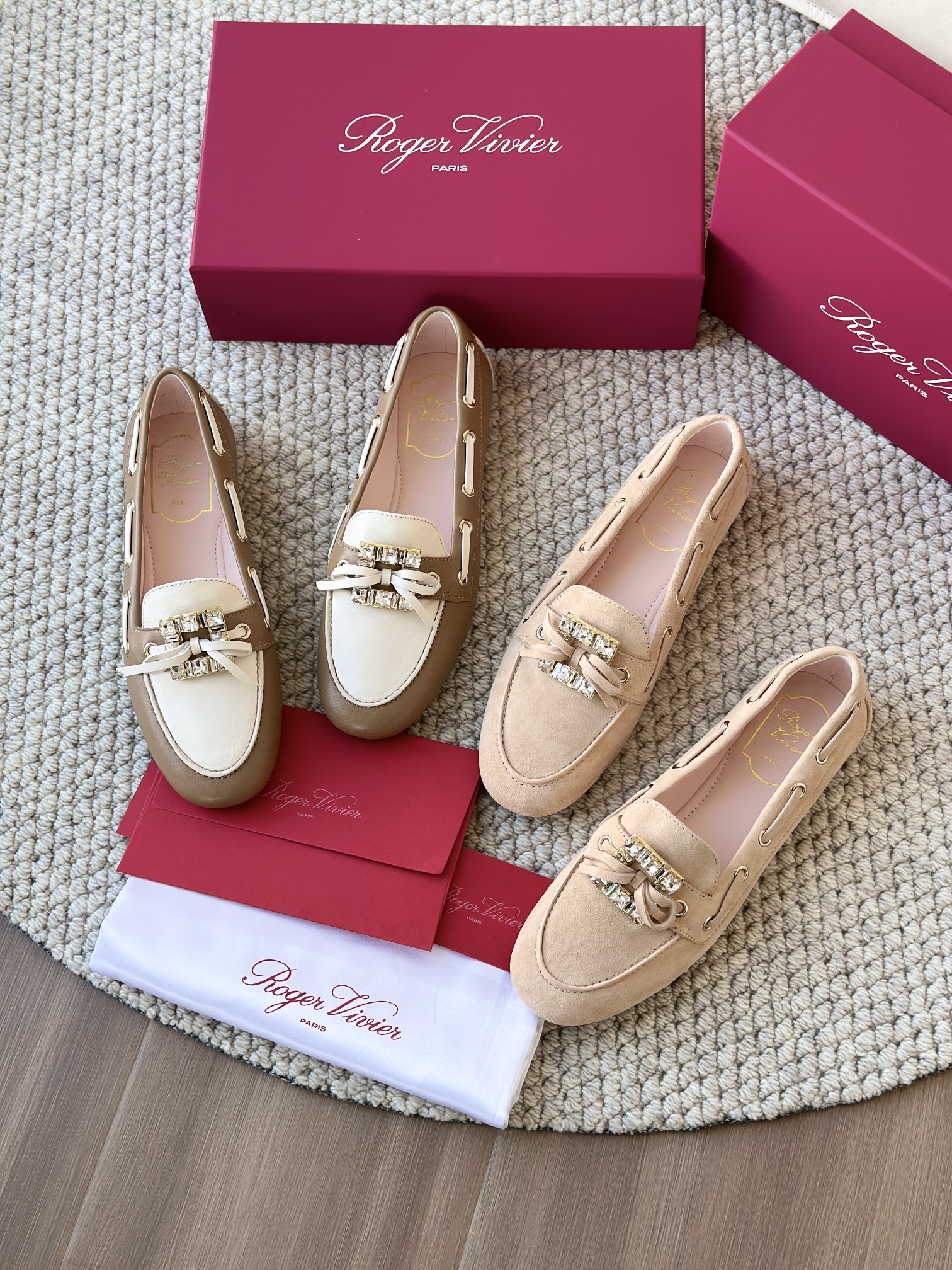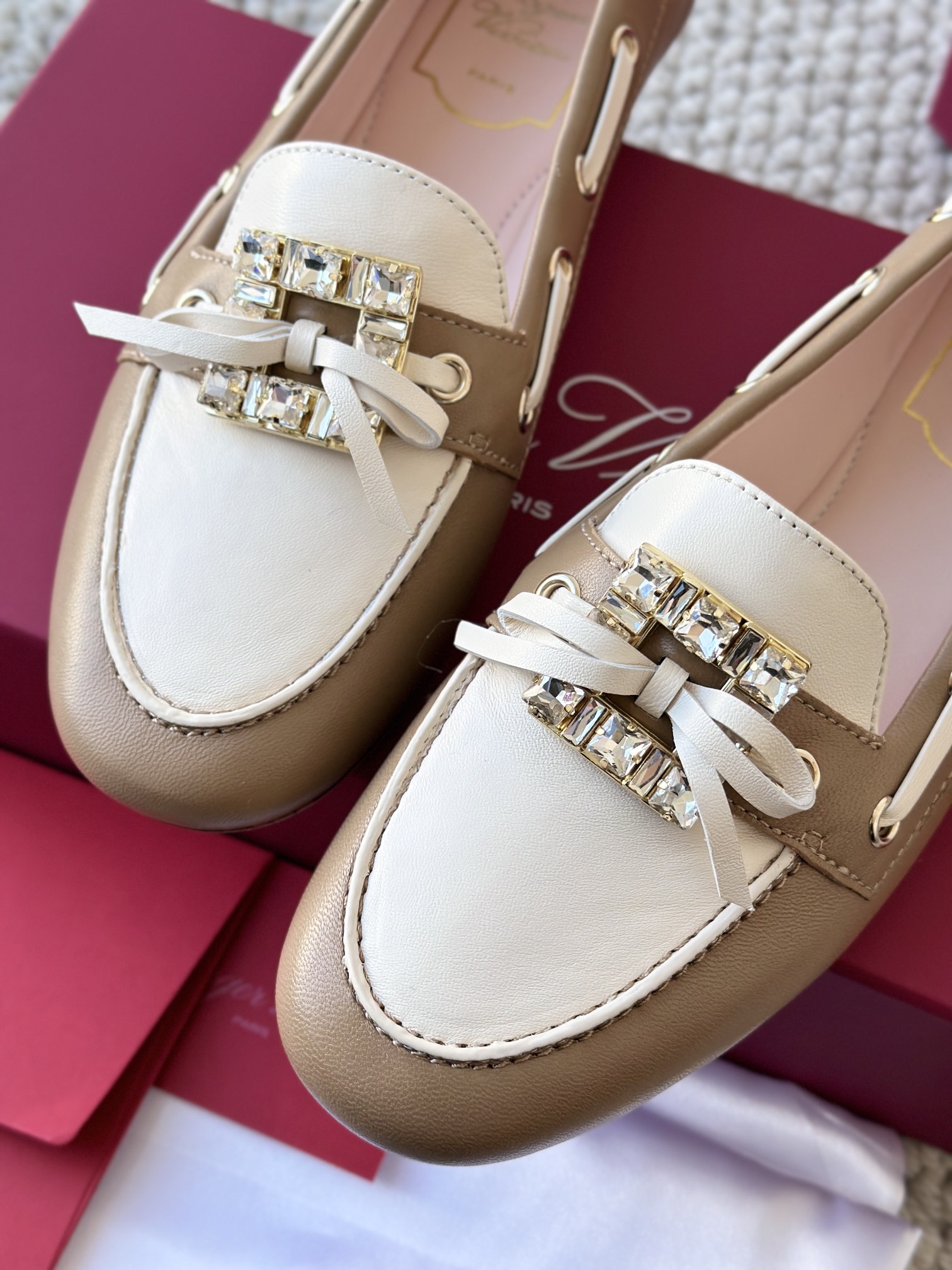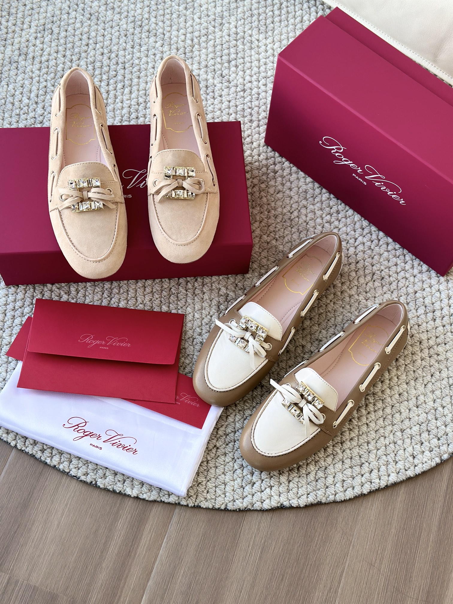 res Vivier 系列重新诠释经典乐福的魅力,手工制作,点缀mini水晶饰扣,闪耀动人搭配编制蝴蝶结,灵动可爱又不失优雅的气质