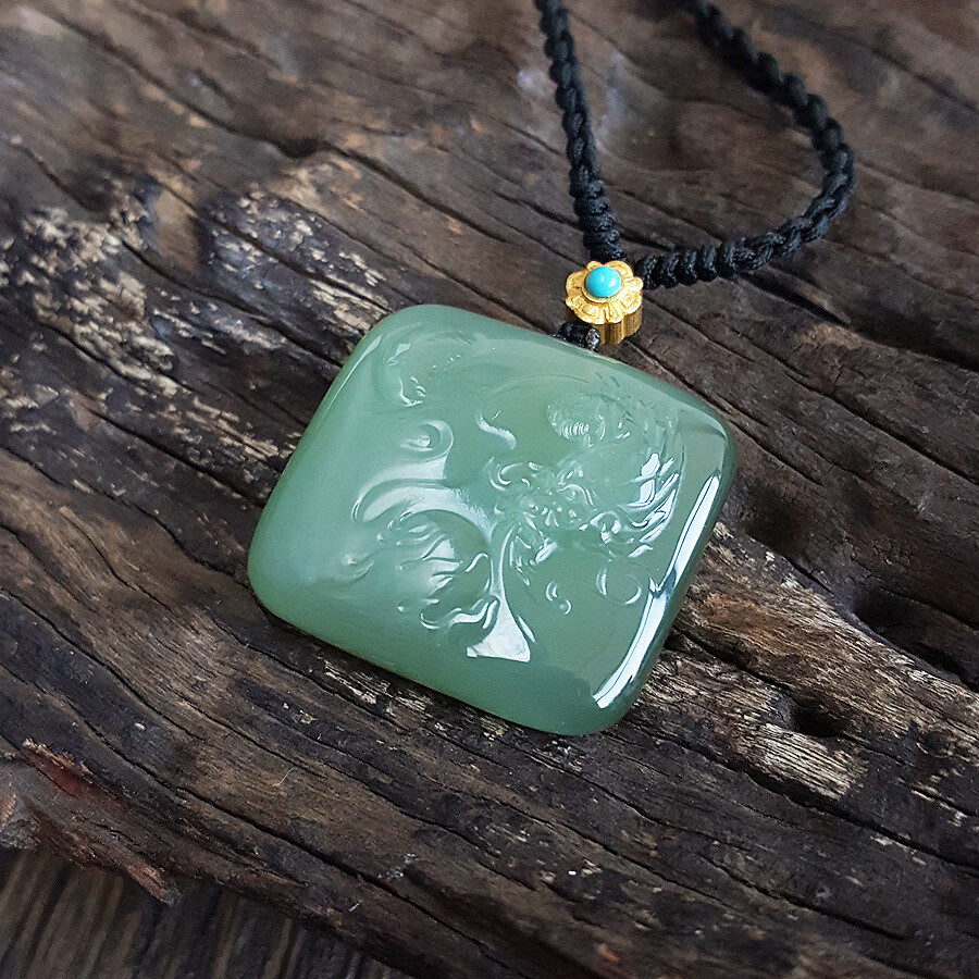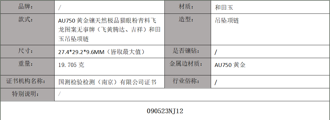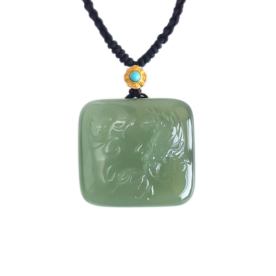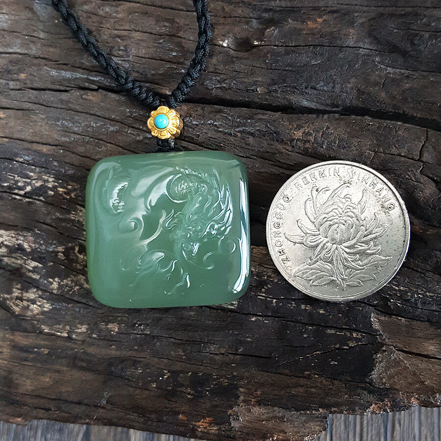 【天然正品】AU750黄金镶天然猫眼粉青料飞龙图案无事牌(飞黄腾达、吉祥)和田玉吊坠项链090523NJ12