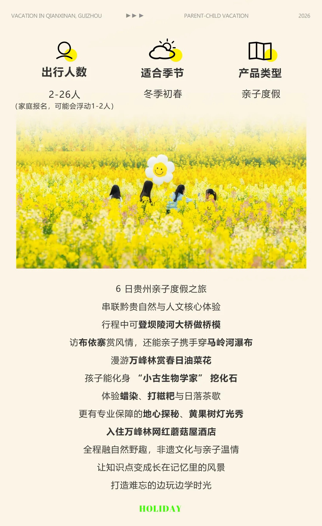 贵州|2026黔西南亲子6天5晚度假之旅,串联黔贵自然与人文核心体验,万峰林油菜花/布依族村落/夜游黄果树瀑布/蘑菇屋/非遗体验/地质研学/模型实践,化身地质小顽家边玩边学!寒假春节行程提前定!