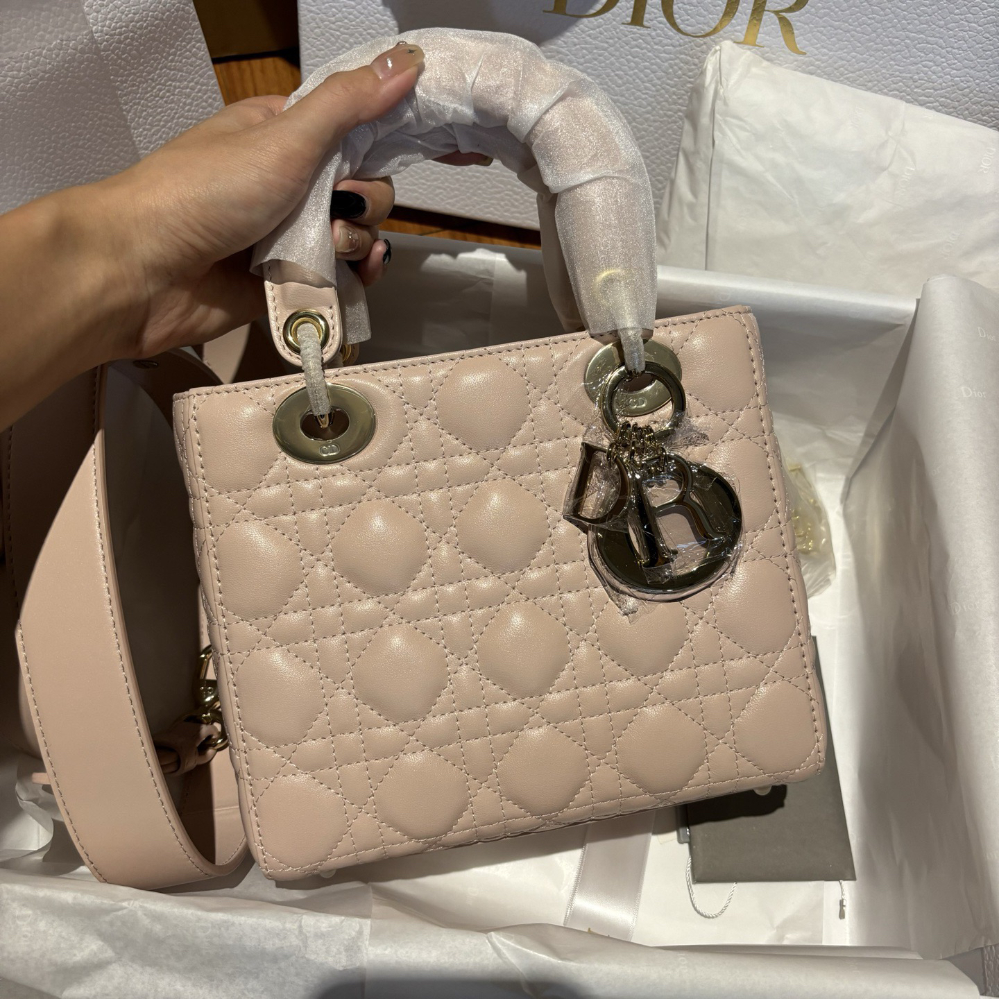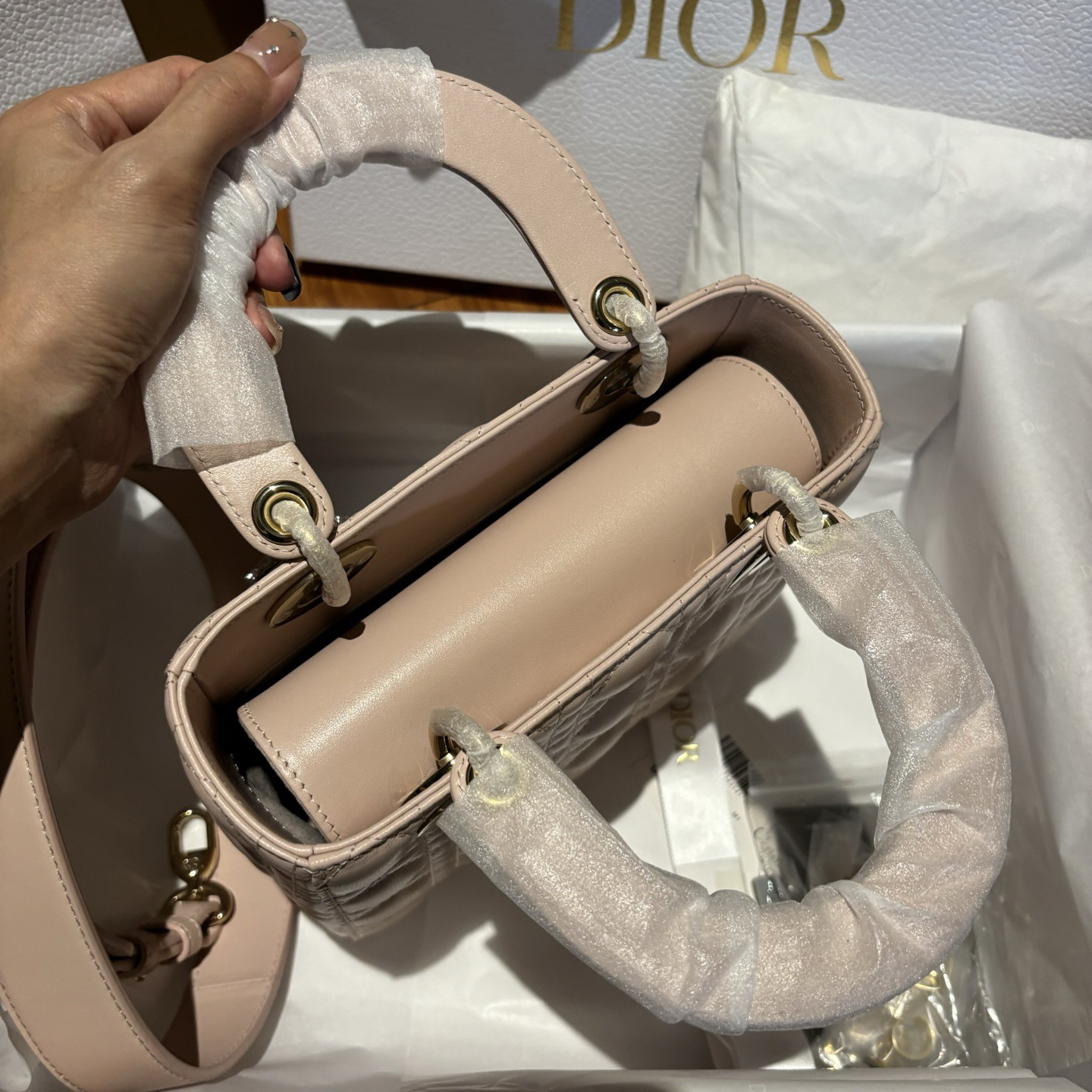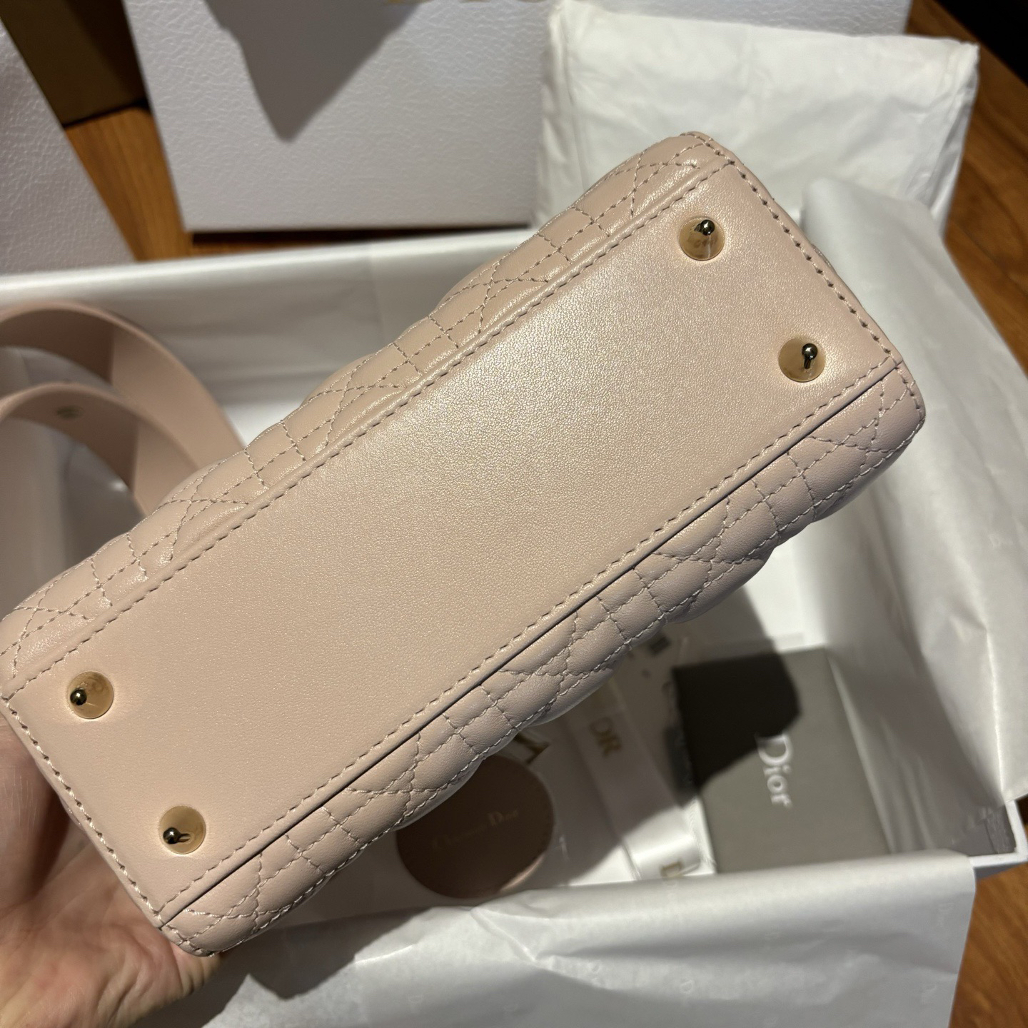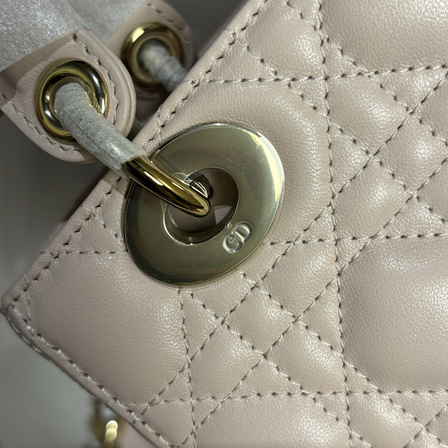 这款 Lady Dior 手袋集中体现了Dior对优雅和美丽的深刻洞见。采用胭脂粉羊皮革精心制作,以藤格纹缉面线打造醒目的绗缝纹理,时髦典雅的设计经久不衰。缀有浅金色饰面金属 D.I.O.R.吊饰,彰显优雅气质。小号款式,设计别致,肩带可搭配经典徽章彰显个性,可手提或斜挎。