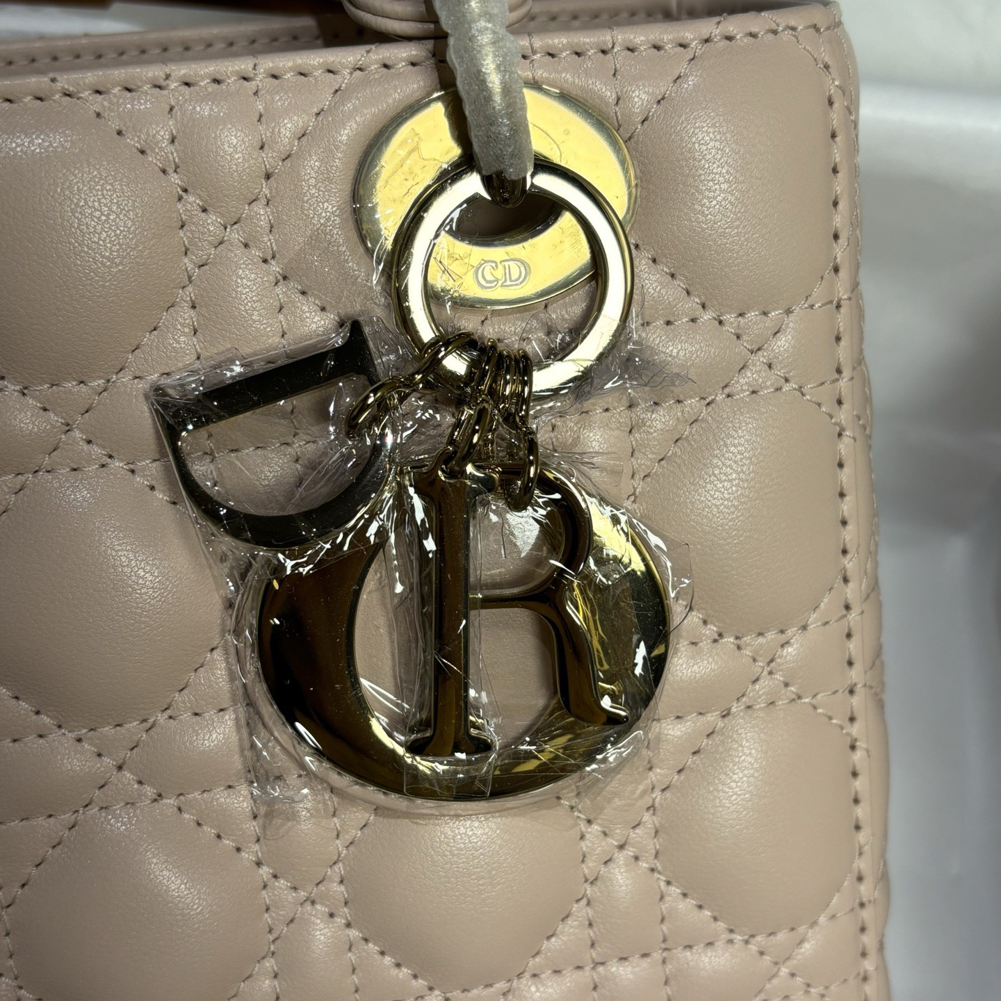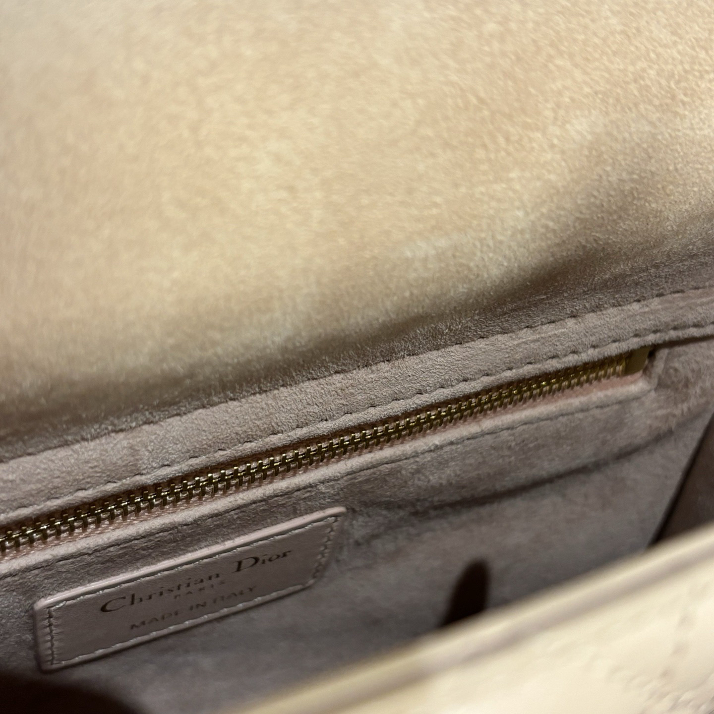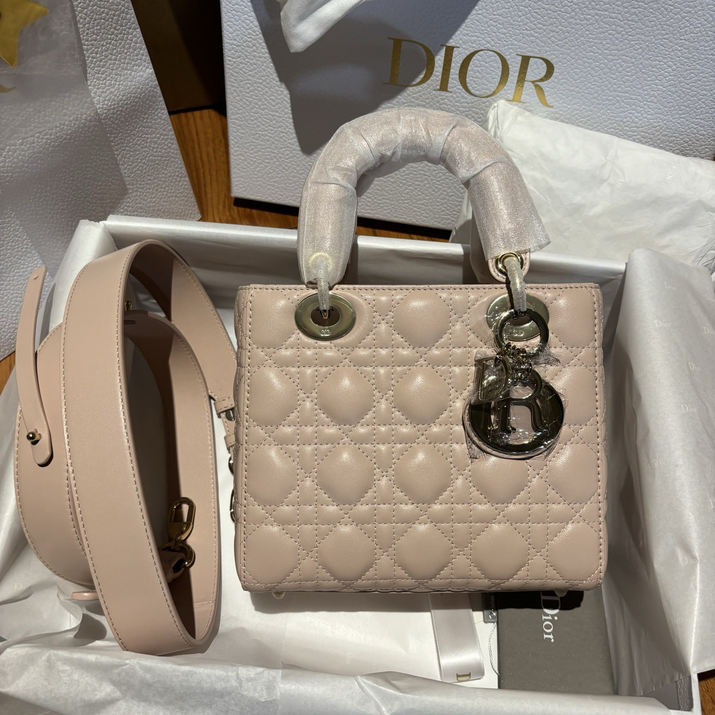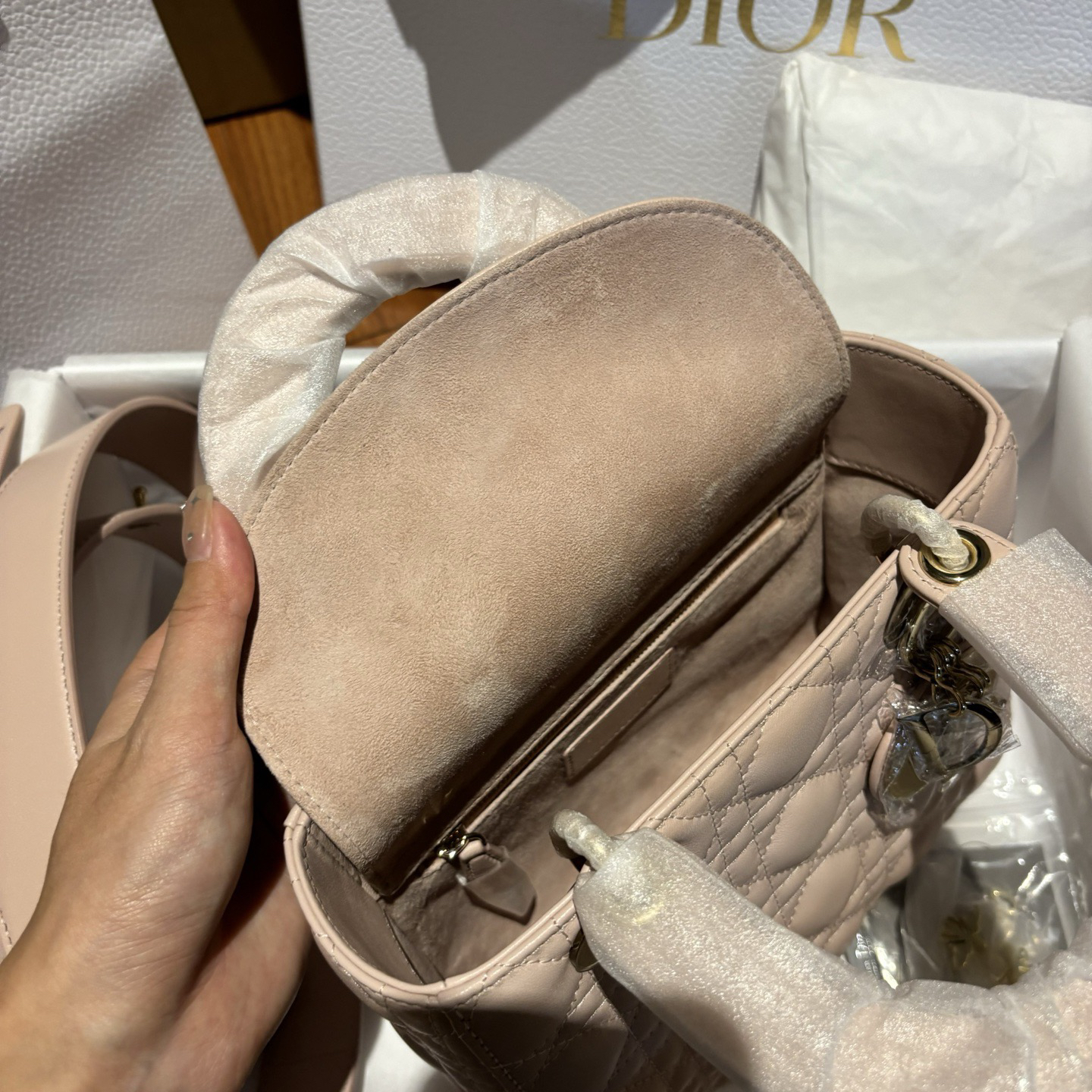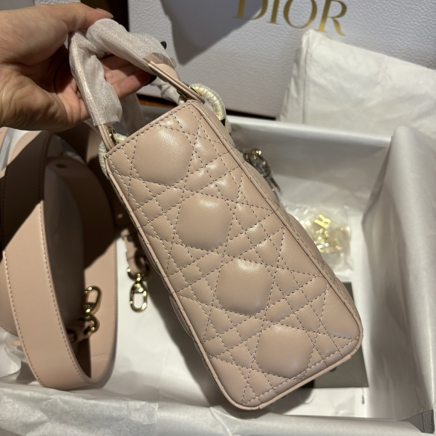 这款 Lady Dior 手袋集中体现了Dior对优雅和美丽的深刻洞见。采用胭脂粉羊皮革精心制作,以藤格纹缉面线打造醒目的绗缝纹理,时髦典雅的设计经久不衰。缀有浅金色饰面金属 D.I.O.R.吊饰,彰显优雅气质。小号款式,设计别致,肩带可搭配经典徽章彰显个性,可手提或斜挎。