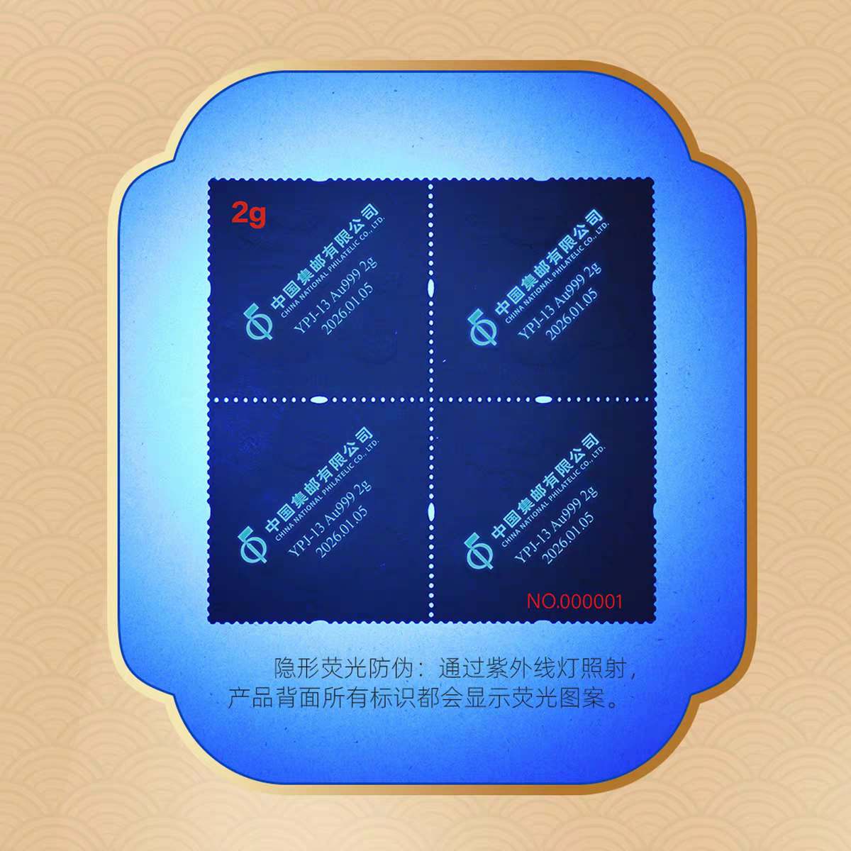 背面利用特殊工艺将贵金属与防伪特种纸结合,带有荧光防伪,具有独特的防伪功能和收藏价值。