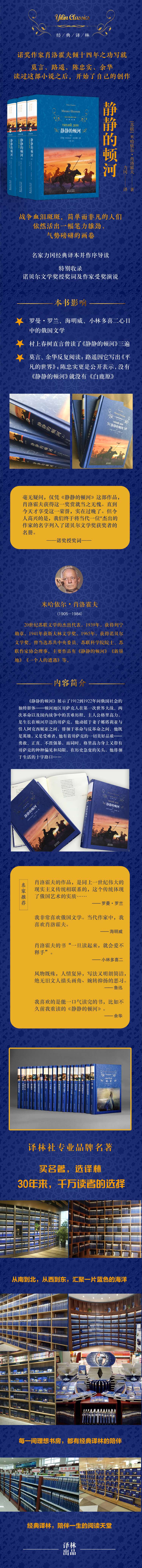 《静静的顿河》展示了1912到1922年间,俄国社会的独特群体——顿河地区哥萨克人在*次世界大战、二月革命和十月革命以及国内战争中的艰苦历程。主人公格里高力,是生长在顿河岸边的哥萨克,他动摇于妻子娜塔莉亚与情人阿克西妮亚之间,徘徊于革命与反革命之间,他既是英雄,又是受难者,他有着哥萨克的一切美好品质——勇敢、正直、不畏强暴,而同时,格里高力身上又带有哥萨克的种种偏见和局限,在历史急变的关头,他徘徊于生活的十字路口。作者用悲剧手段,塑造了一个个性鲜明的男子汉形象,从格里高力身上,读者能感觉出作者对人的尊重。肖洛霍夫因《静静的顿河》作品获得1965年的诺贝尔文学奖。