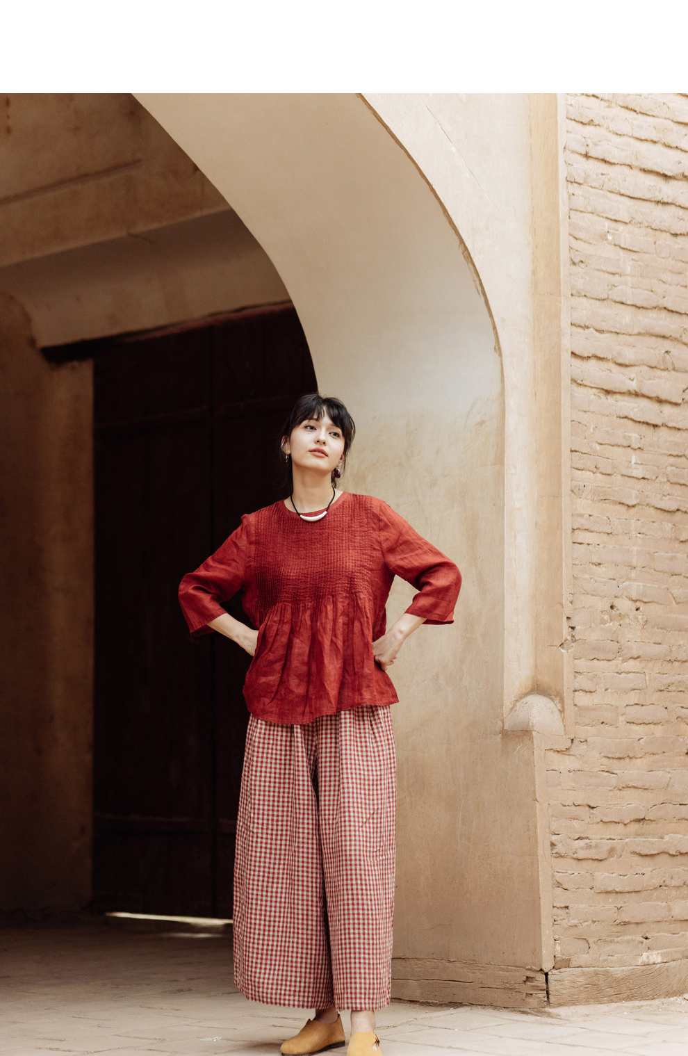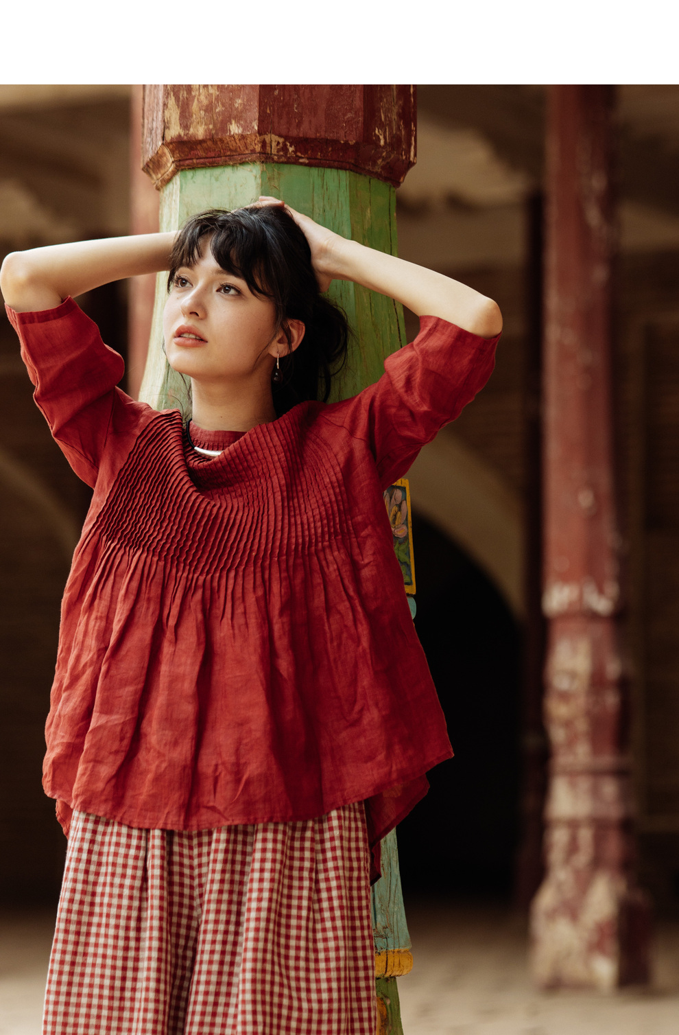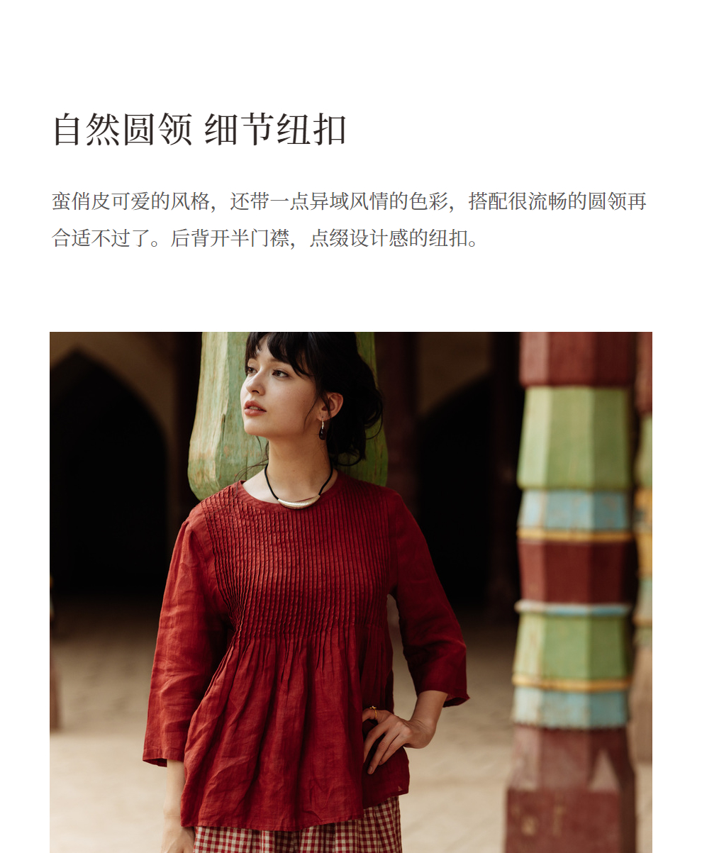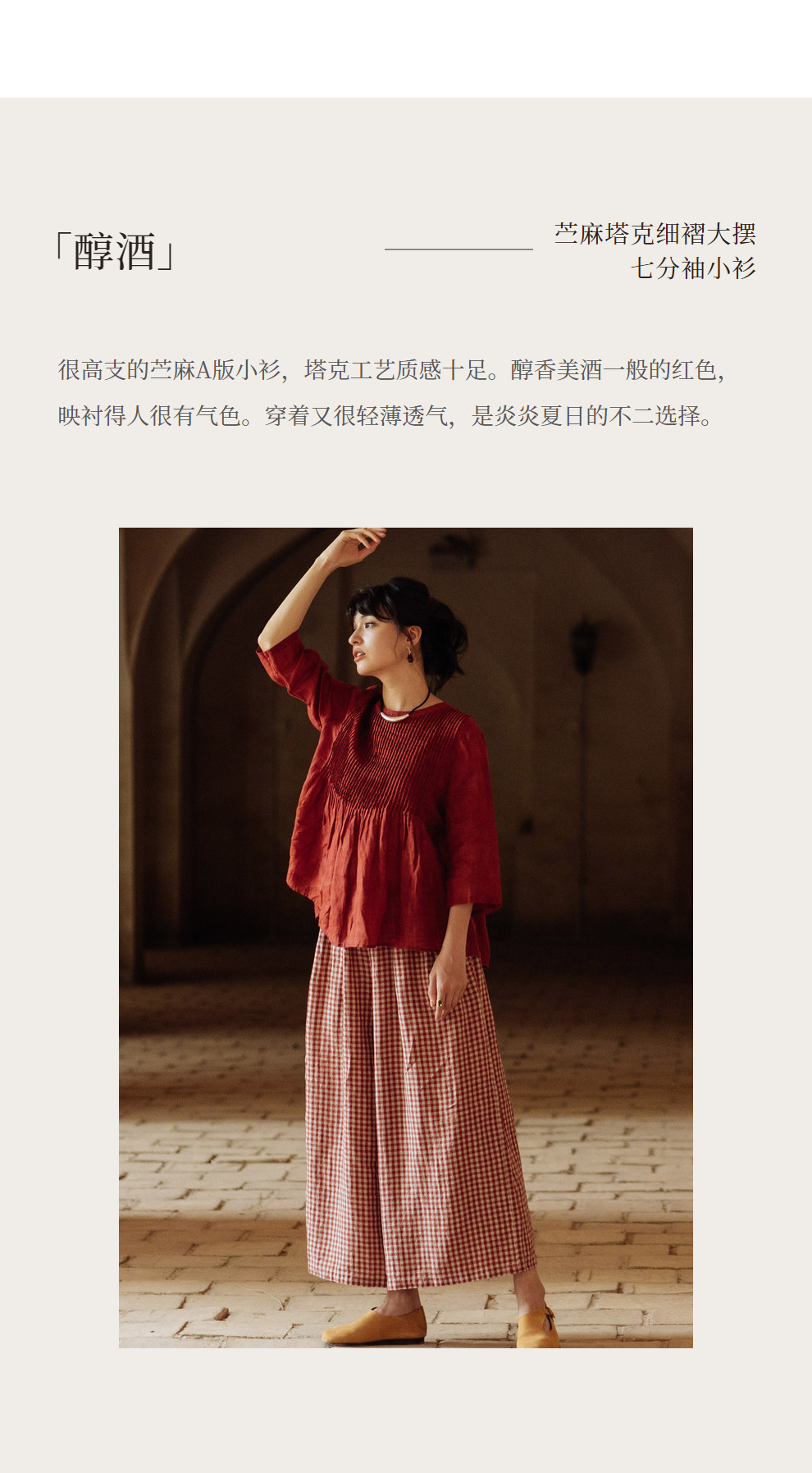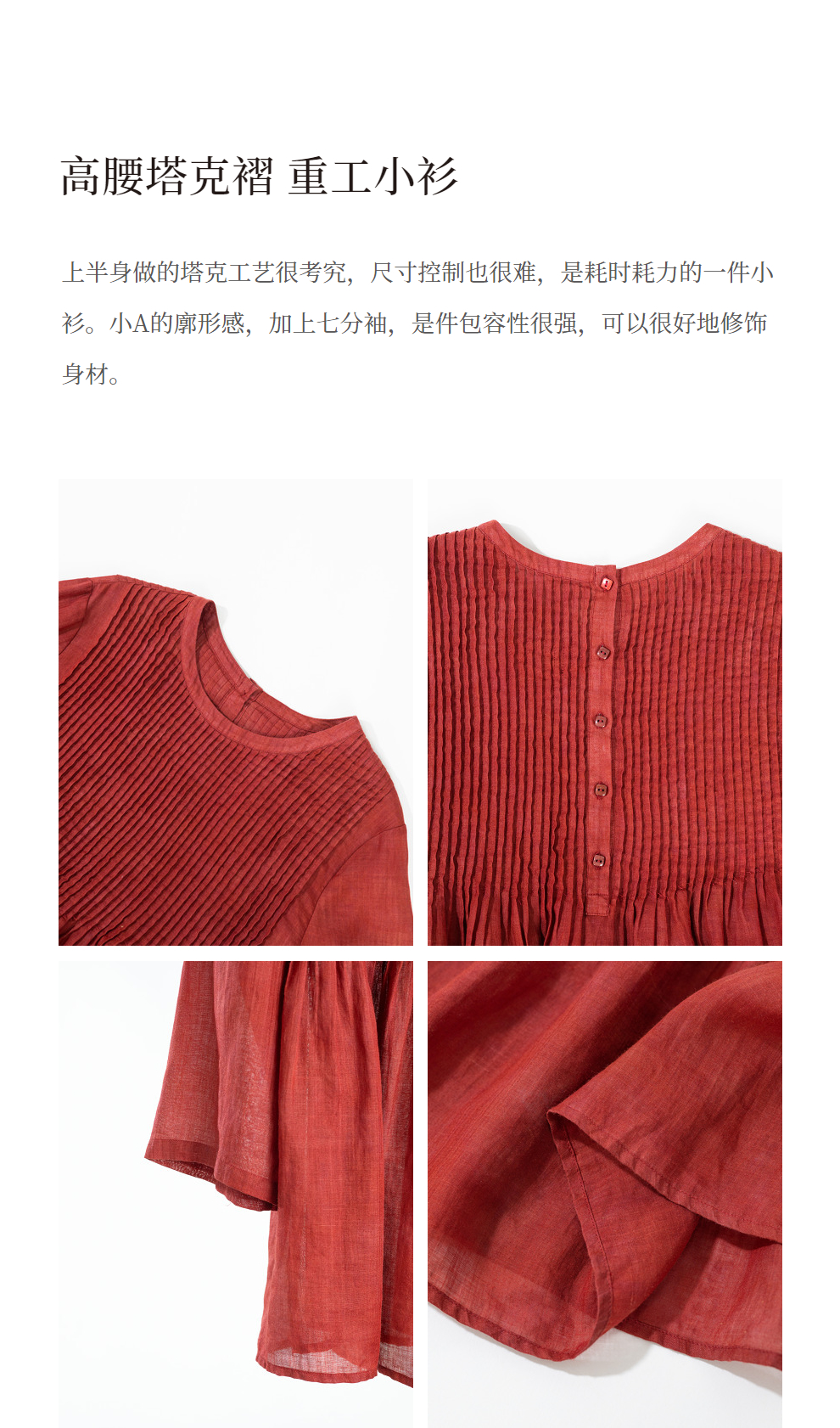 绽放旅行女装472朵/醇酒高支苎麻塔克细褶大摆七分袖圆领小衫