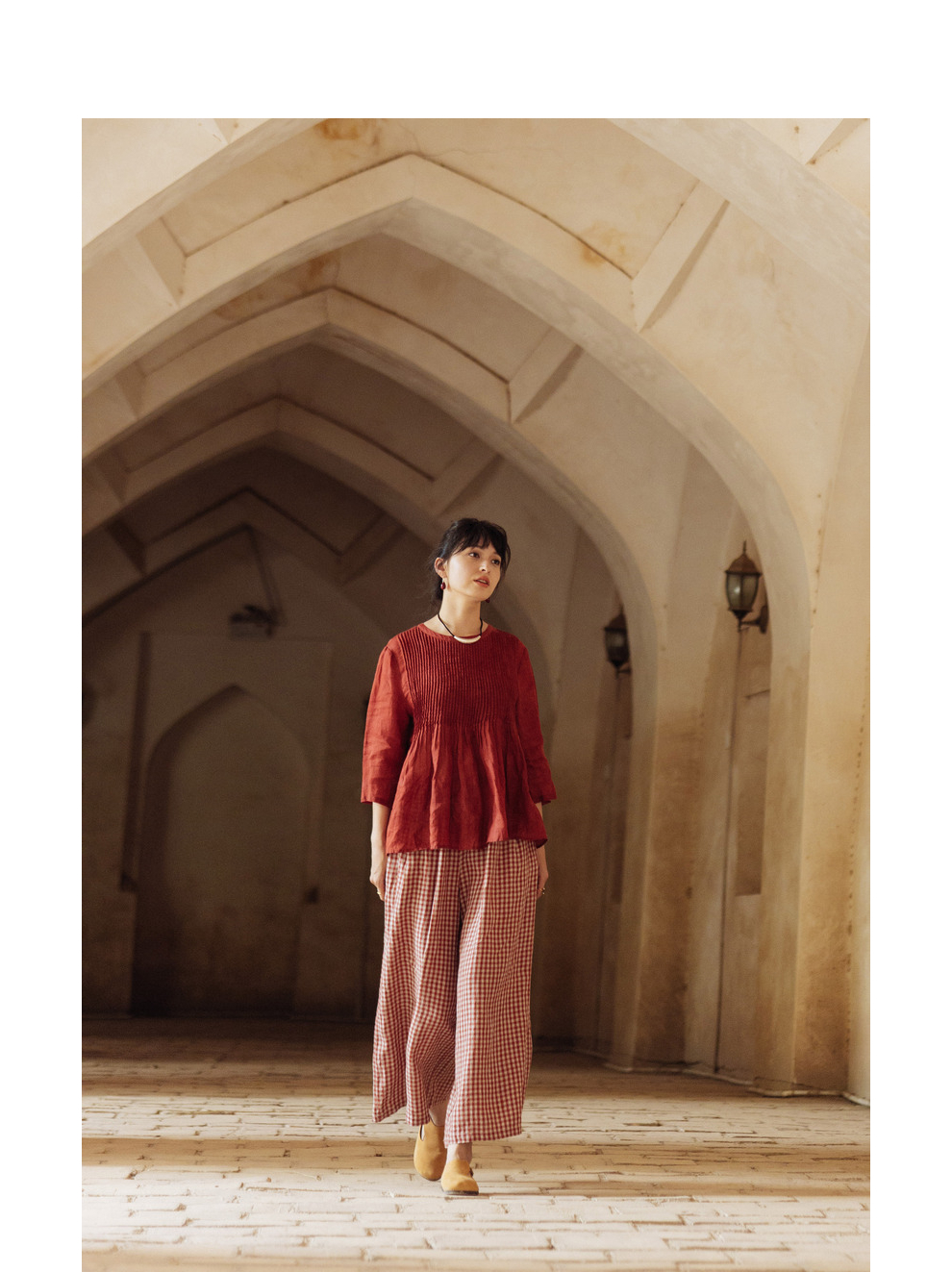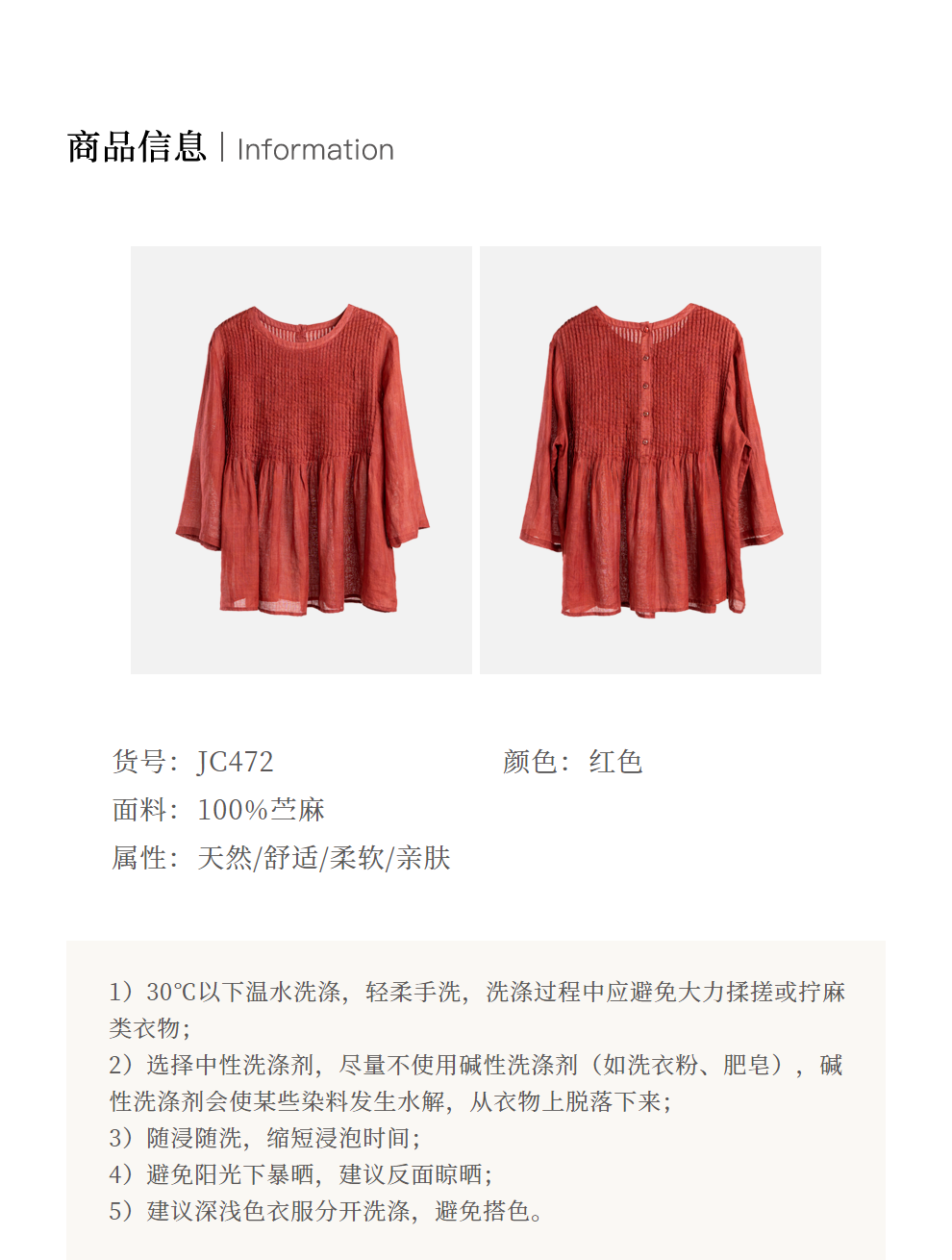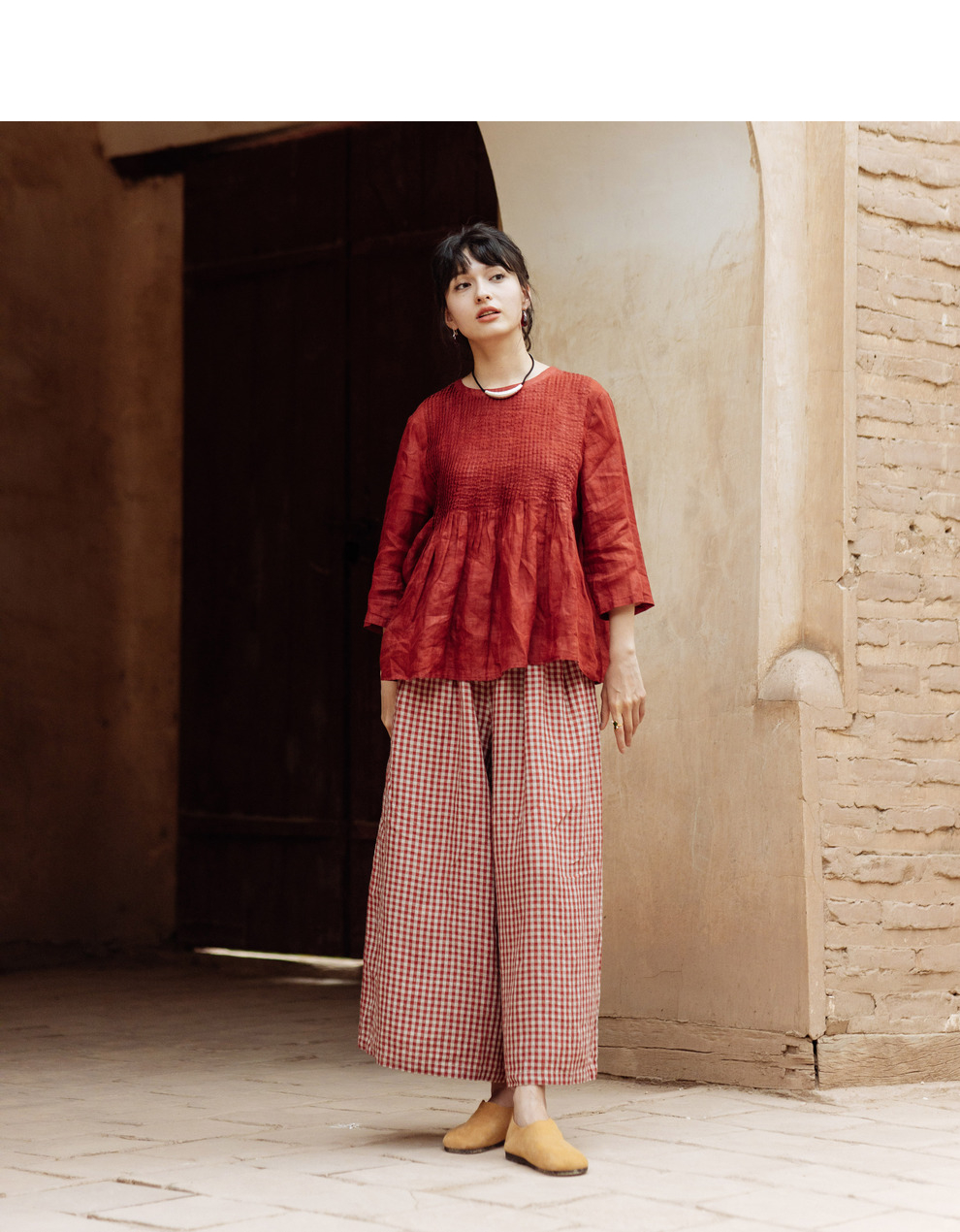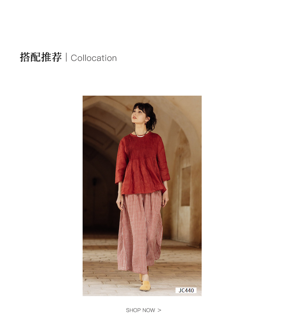 绽放旅行女装472朵/醇酒高支苎麻塔克细褶大摆七分袖圆领小衫