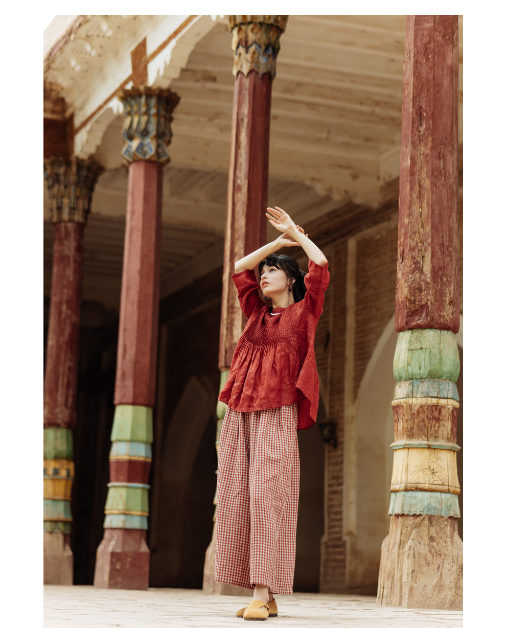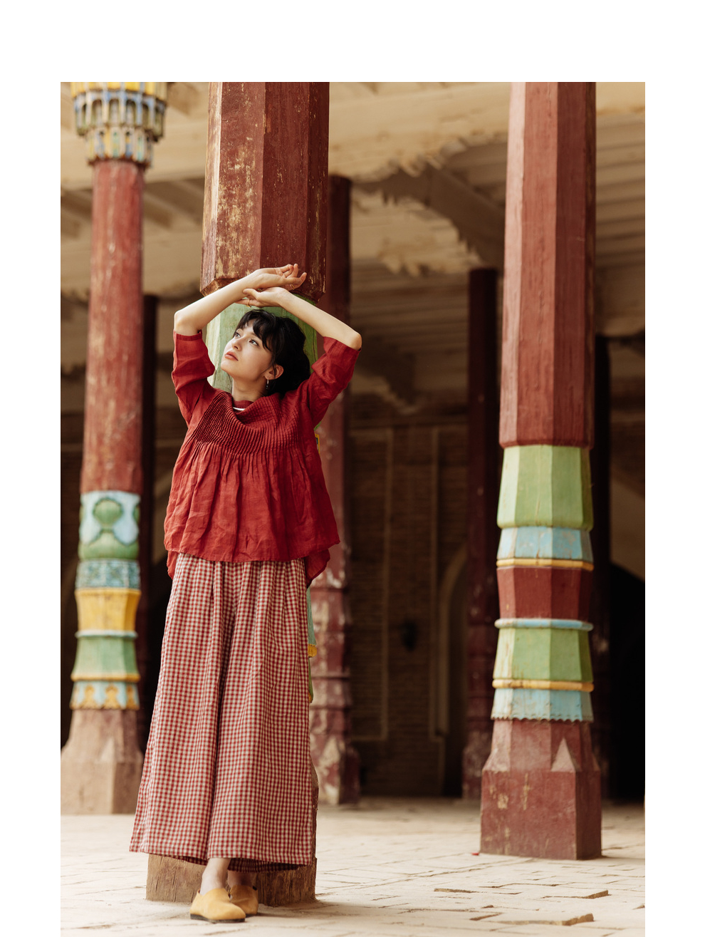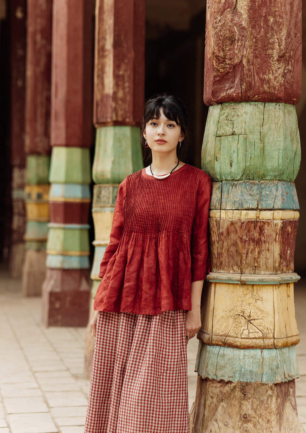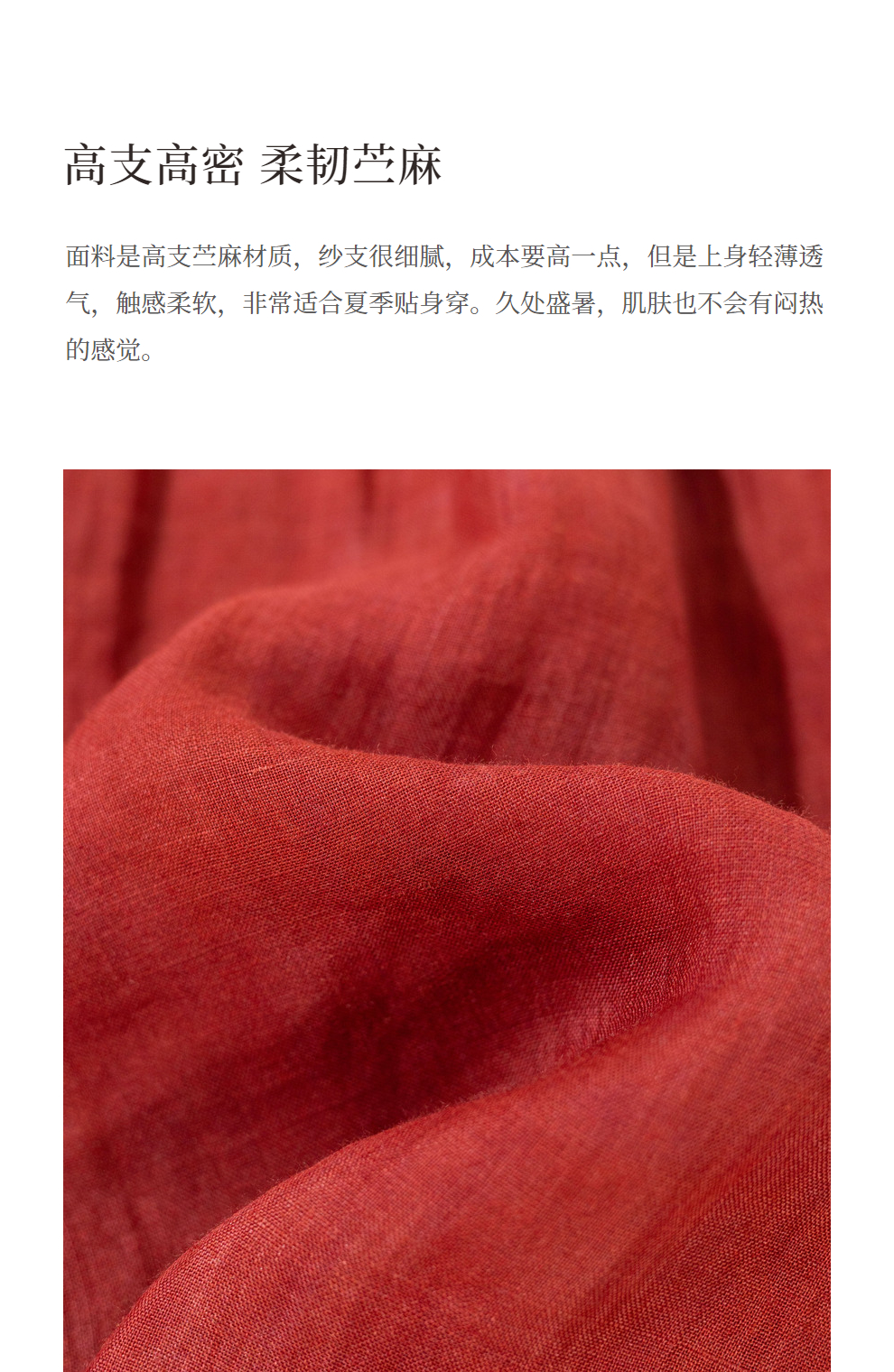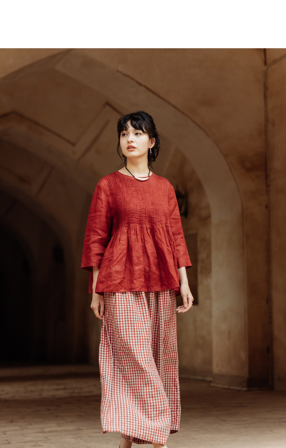 绽放旅行女装472朵/醇酒高支苎麻塔克细褶大摆七分袖圆领小衫