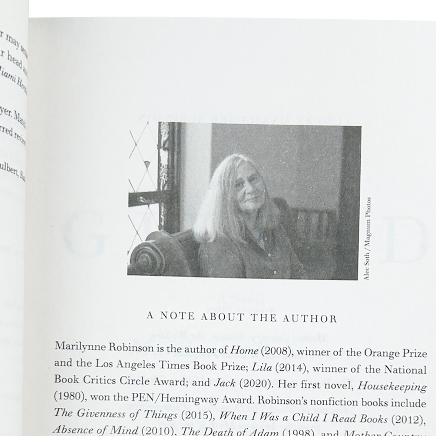 Marilynne Robinson is the recipient of a 2012 National Humanities Medal, awarded by President Barack Obama, for "her grace and intelligence in writing." She is the author of Gilead, winner of the 2005 Pulitzer Prize for Fiction and the National Book Critics Circle Award; Home, winner of the Orange Prize and the Los Angeles Times Book Prize; and Lila, winner of the National Book Critics Circle Award. Her first novel, Housekeeping, won the Hemingway Foundation/PEN Award. Robinson's nonfiction books include The Givenness of Things, When I Was a Child I Read Books, Absence of Mind, The Death of Adam, and Mother Country. She lives in Iowa City, Iowa.