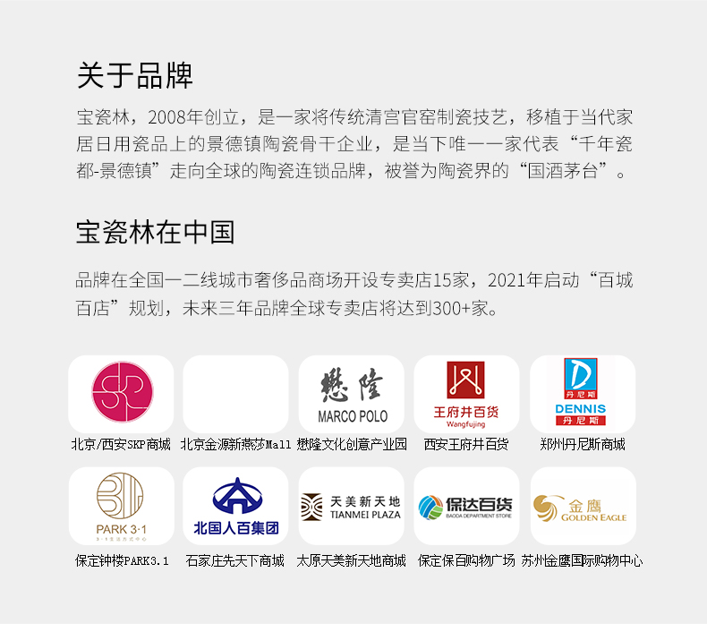 宝瓷林,2008年创立,是一家将传统清宫官窑制瓷技艺,移植于当代家居日用瓷品上的景德镇陶瓷骨干企业,是当下唯一一家代表“千年瓷都-景德镇”走向全球的陶瓷连锁品牌,被誉为陶瓷界的“国酒茅台”。