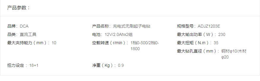 DCA东成 12V无刷双速起子电钻 ADJZ1203E