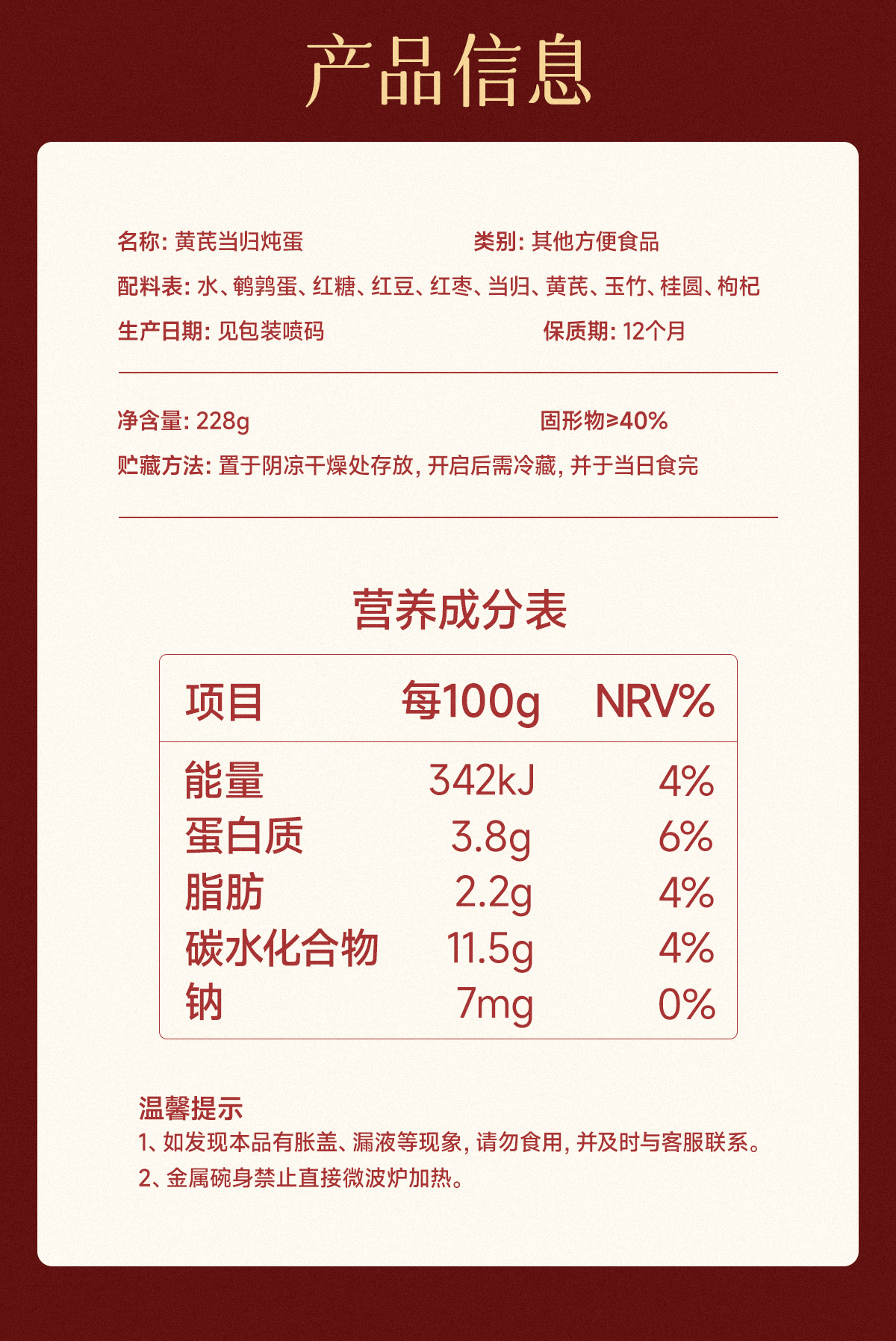 【老客回购】极盏 冬季滋补 女神汤 经典配方 黄芪当归炖蛋(鹌鹑蛋)228g/碗
